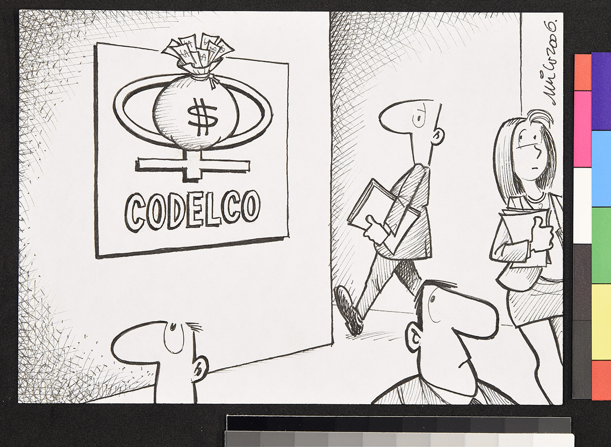 Dibujo de un hombre que camina hacia el mar fumando y llevando un flotador en forma de tiburón en la cintura. Otro hombre que ya tiene sus pies en el agua, tiene un flotador más pequeño.