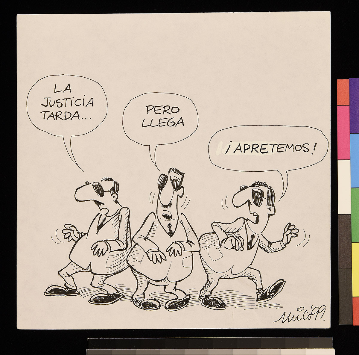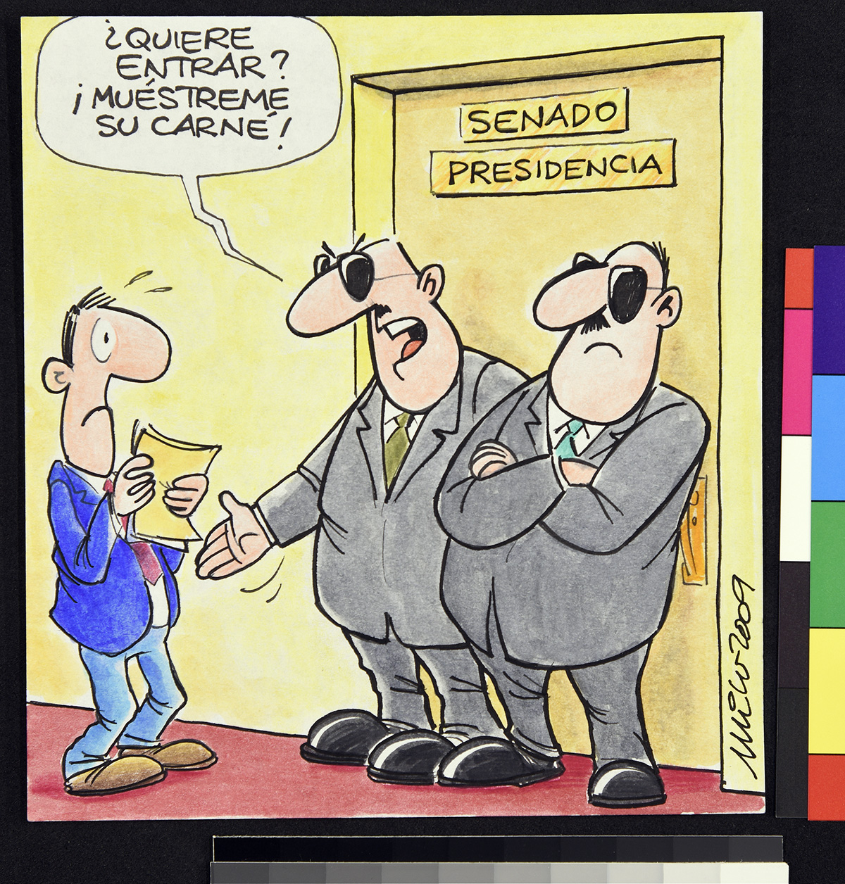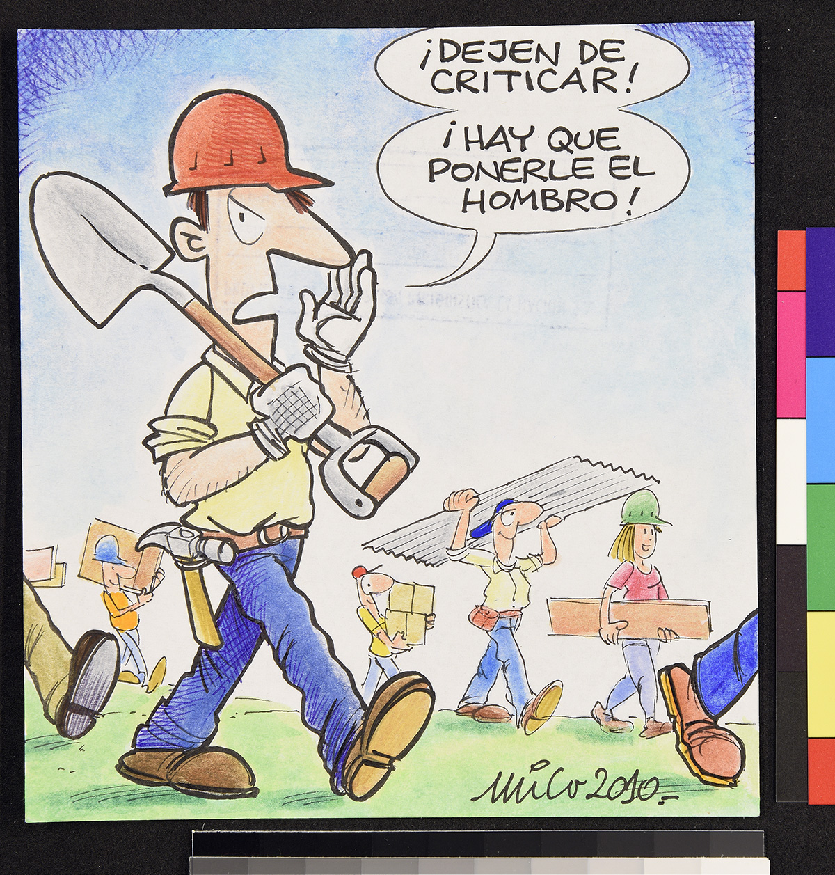 Dibujo de un hombre que mira alegremente un periódico lo quieres, mientras escucha a otro que está frente a él conversando, usando un casco de seguridad.