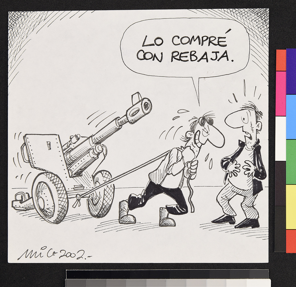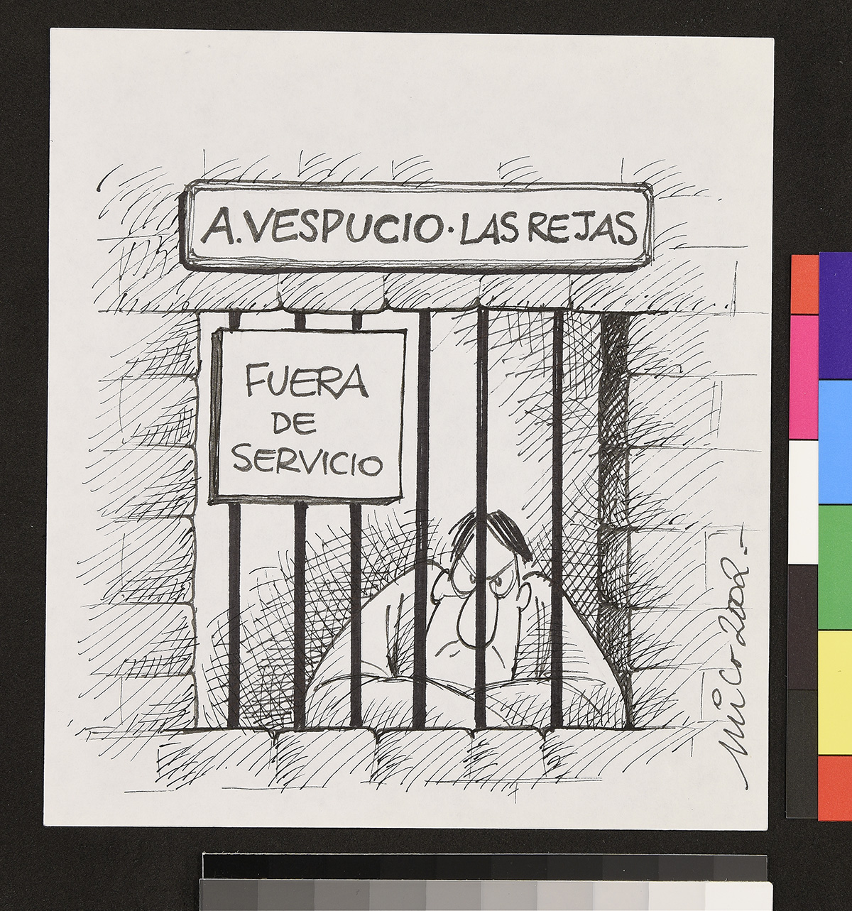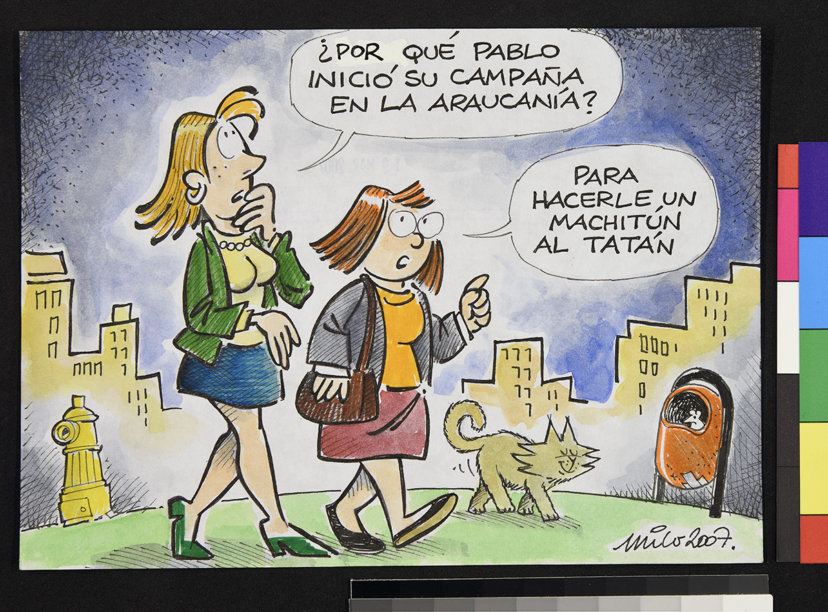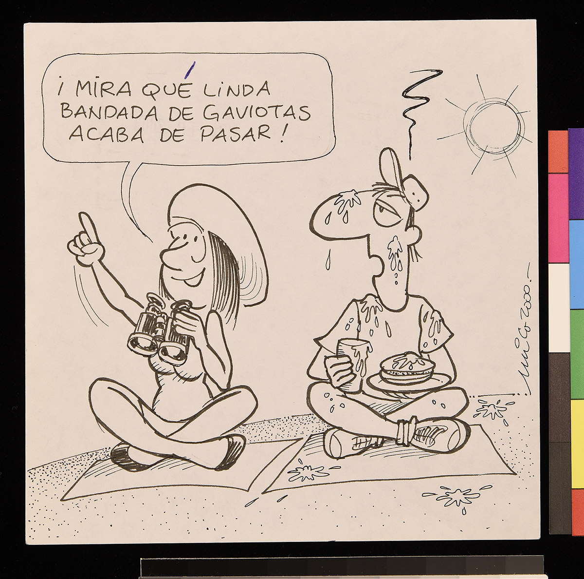 Dibujo de un hombre que mira alegremente un periódico lo quieres, mientras escucha a otro que está frente a él conversando, usando un casco de seguridad.