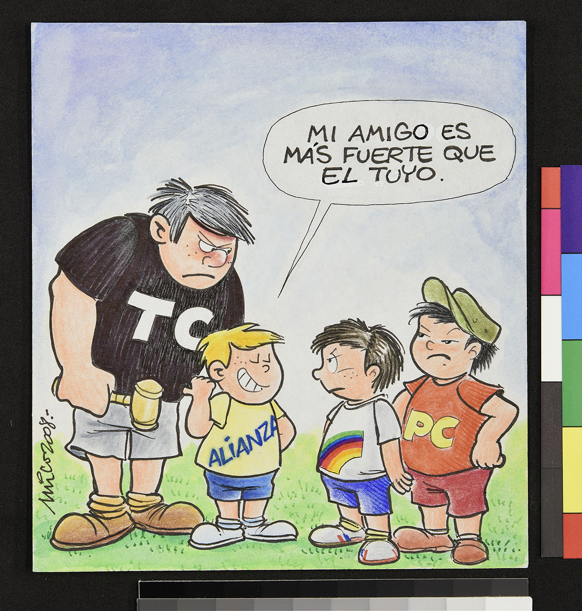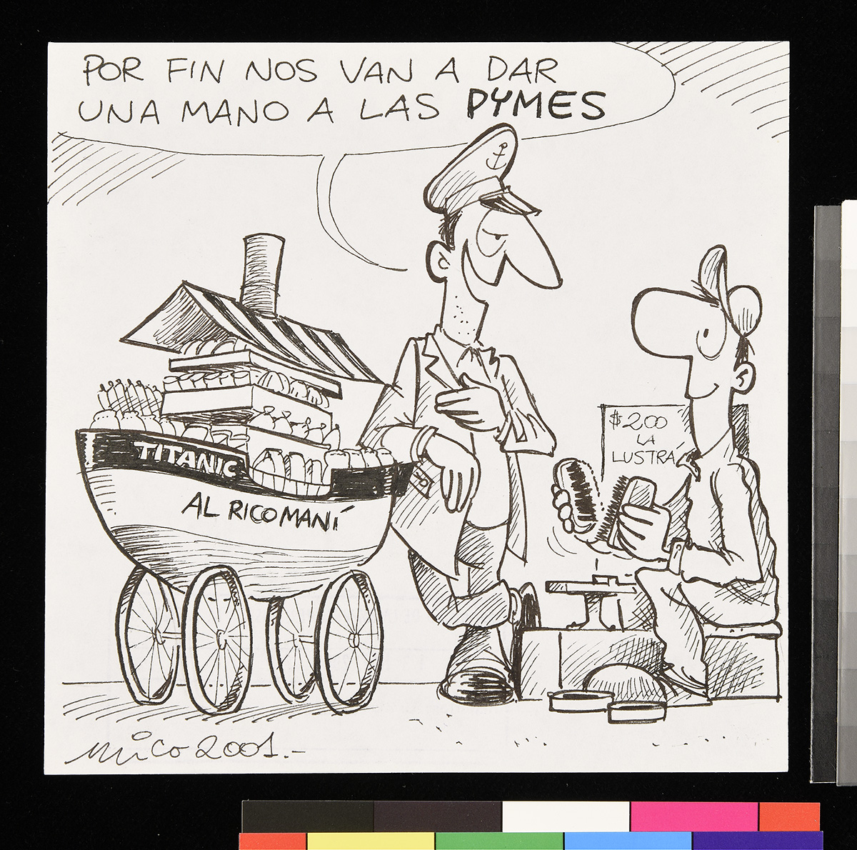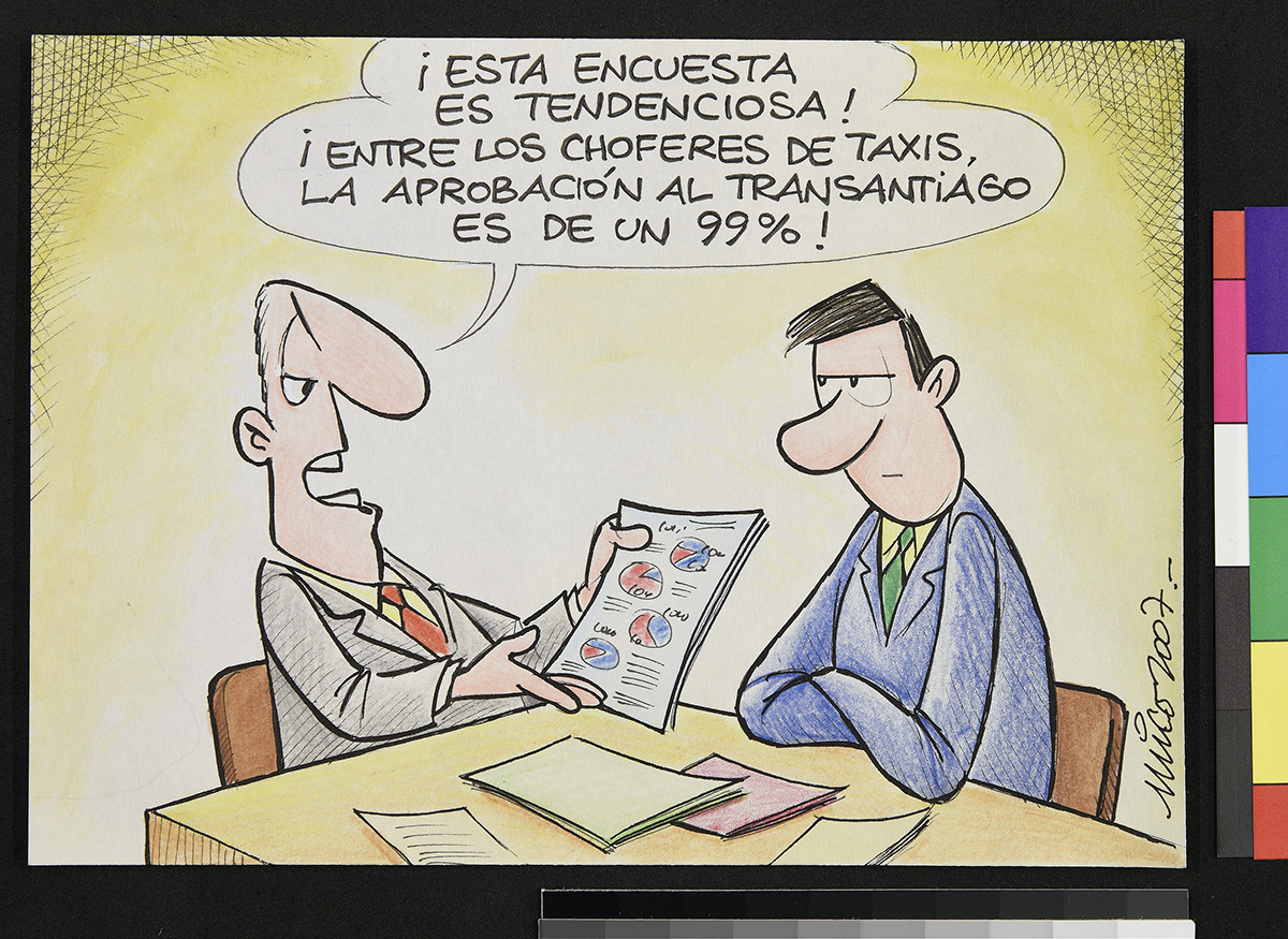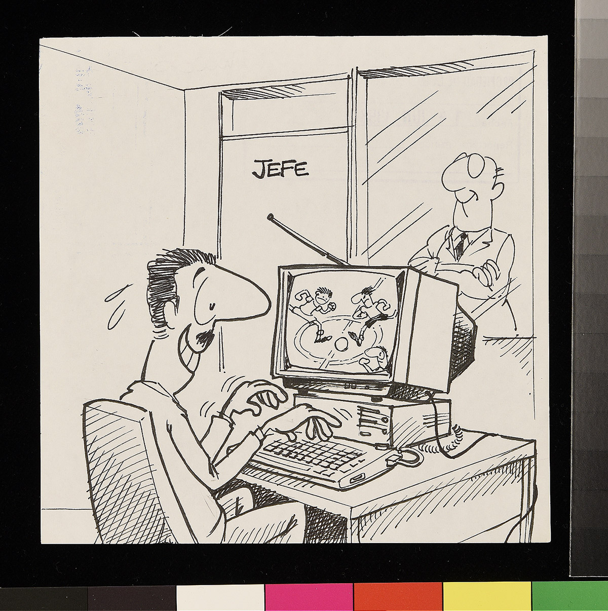 Dibujo de dos hombres que caminan mientras conversamos. Uno de ellos lee el periódico.
