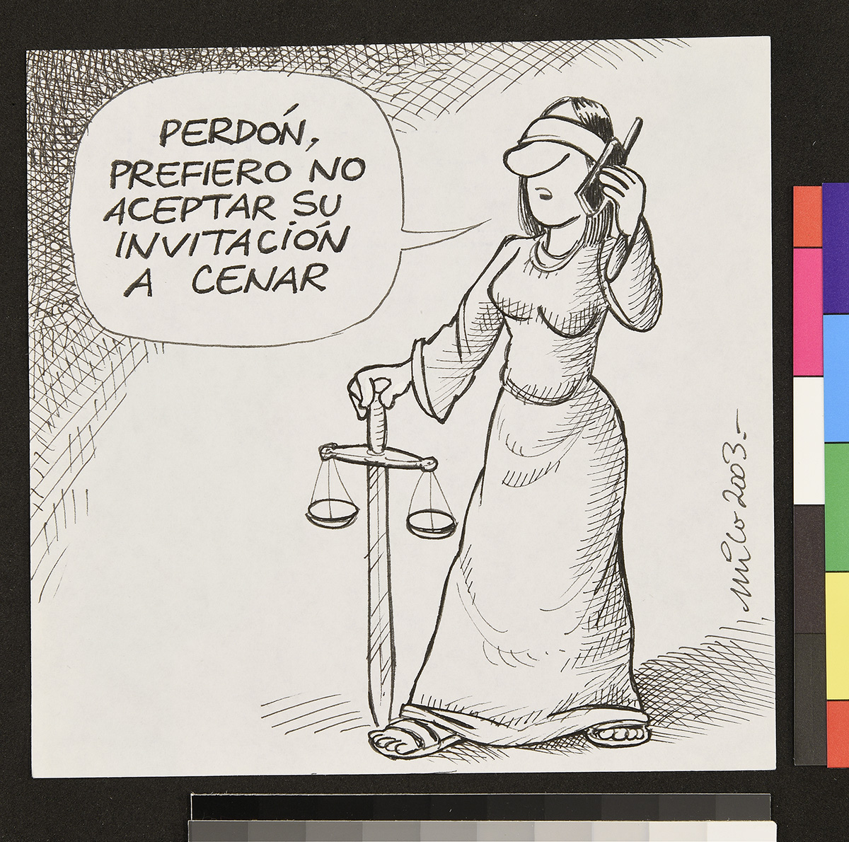 Dibujo de un hombre que camina hacia una puerta llevando en su cintura un flotador inflable. Mira hacia otro hombre que está de pie y le acerca con su mano izquierda un grabador de voz.