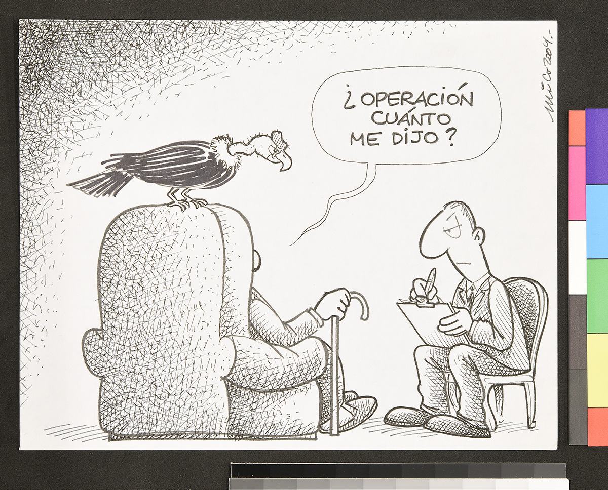 Dibujos dos hombres vestidos de traje caminando mientras conversan. Pasan junto a una muralla con varios panfleto de campañas políticas.