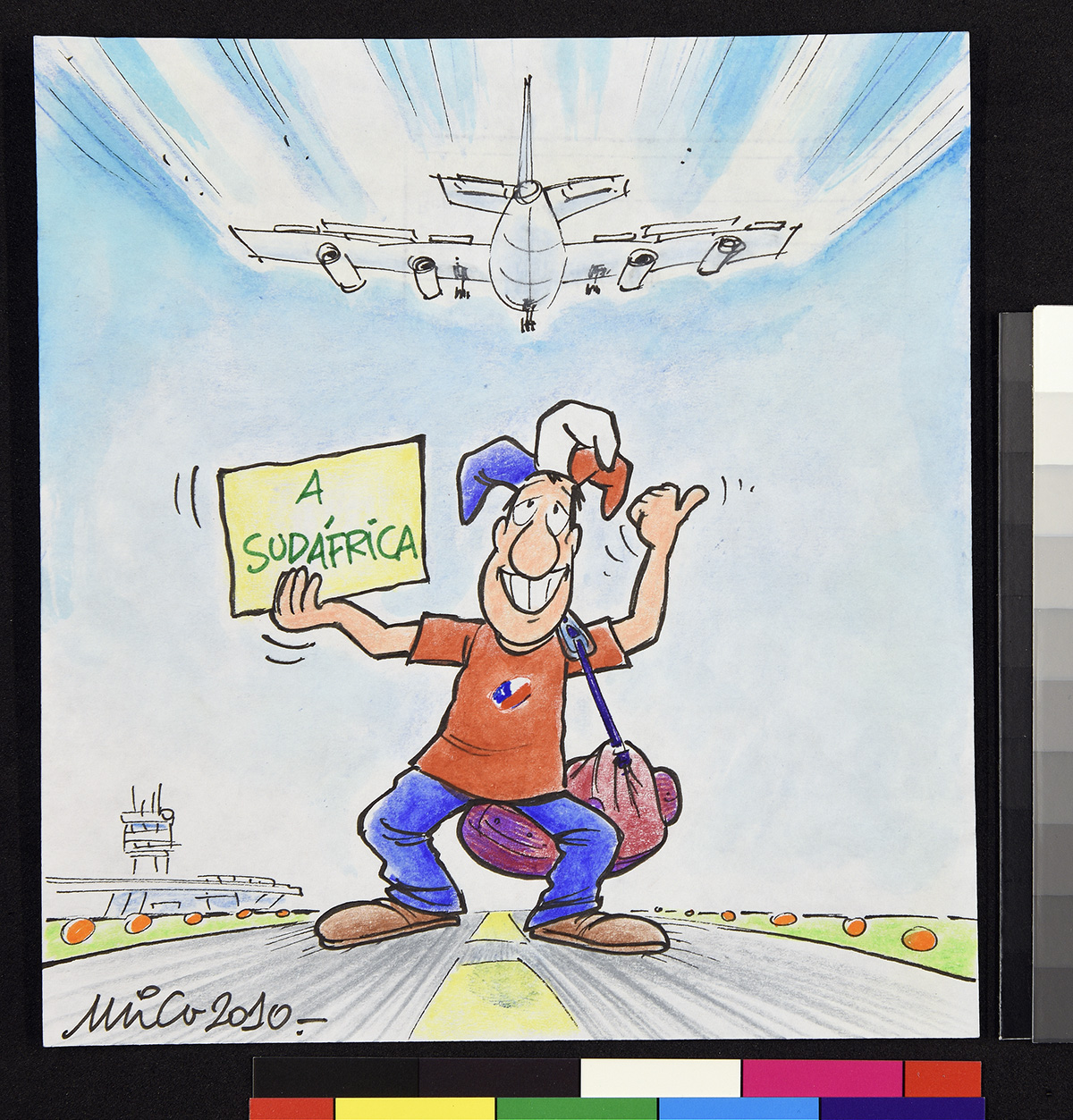 Dibujo de una mujer de pie y sujetando con sus manos un periódico, conversa con un hombre de traje en la calle.