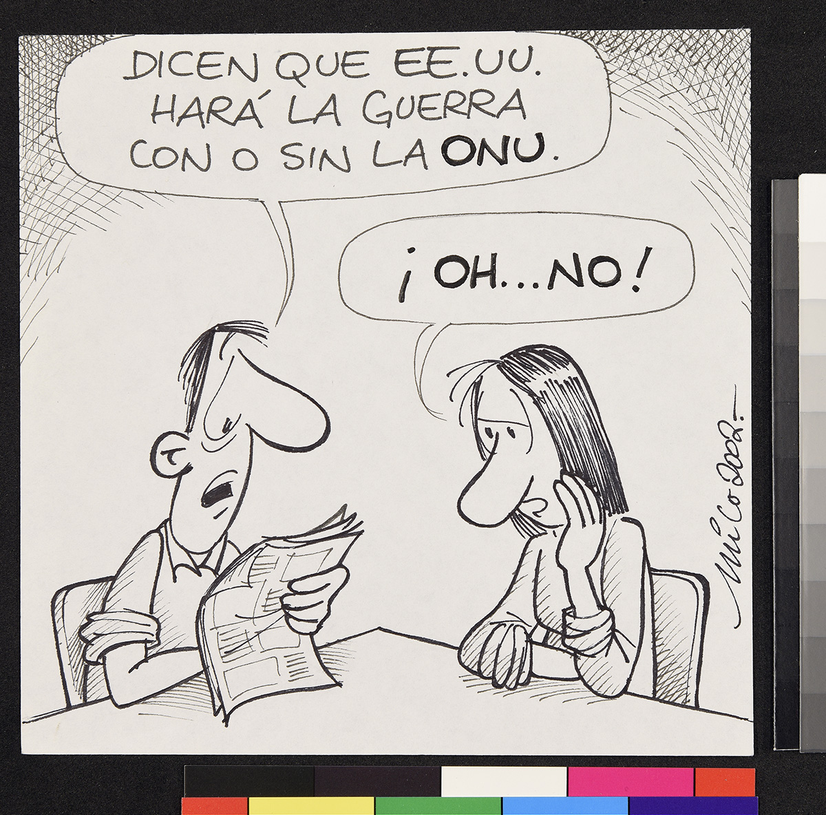 Dibujo de dos hombres con corbata y casco de seguridad. Se encuentran en una habitación de alto voltaje . uno de ellos aprieta botones en una máquina mientras otros sostiene una puerta del suelo y saca con su mano un ratón que muerde un cable.