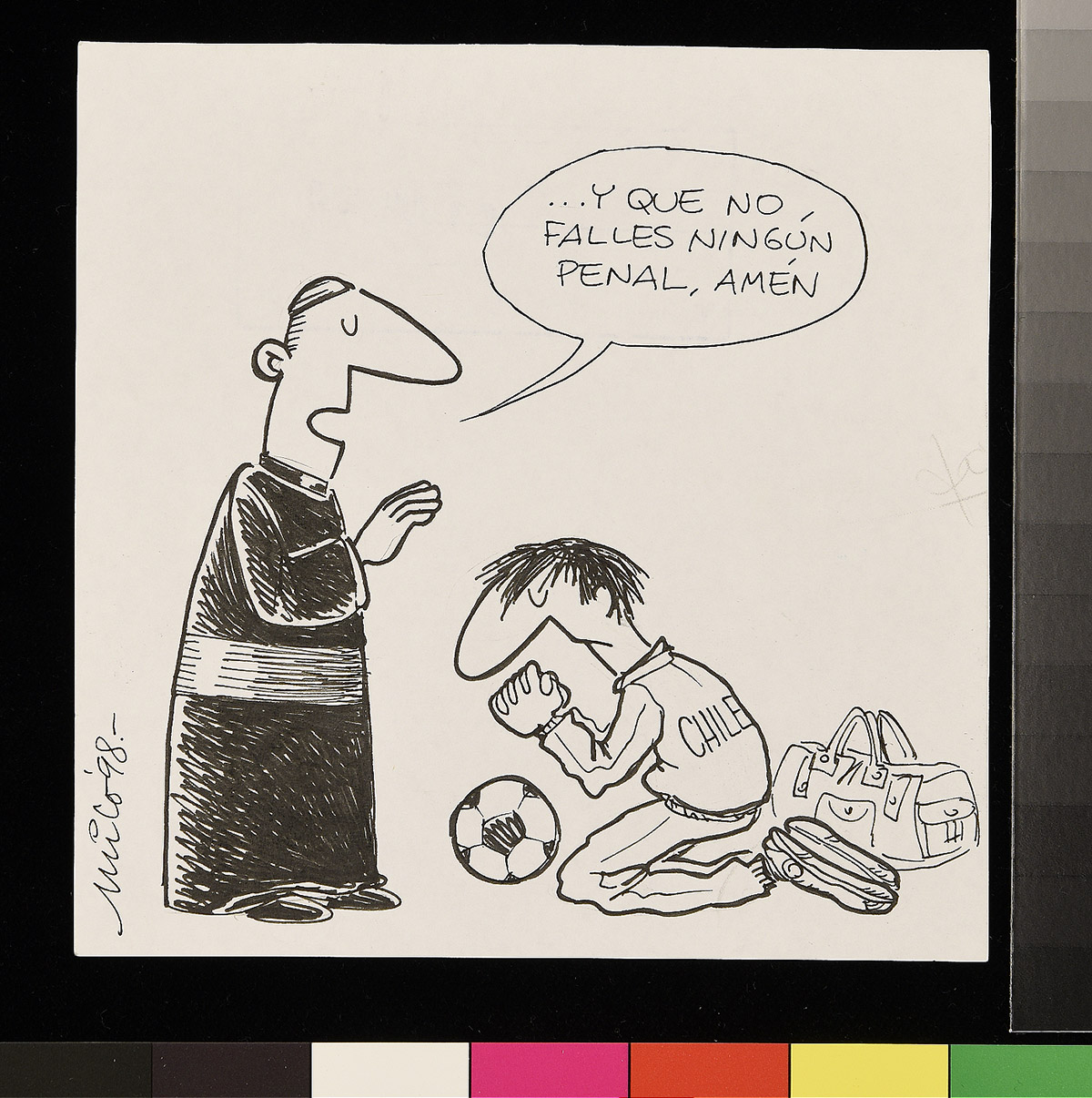 Dibujo de dos hombres, vestidos como hinchas de la selección chilena de fútbol, que conversan sentados frente a una mesa, junto a un televisor.