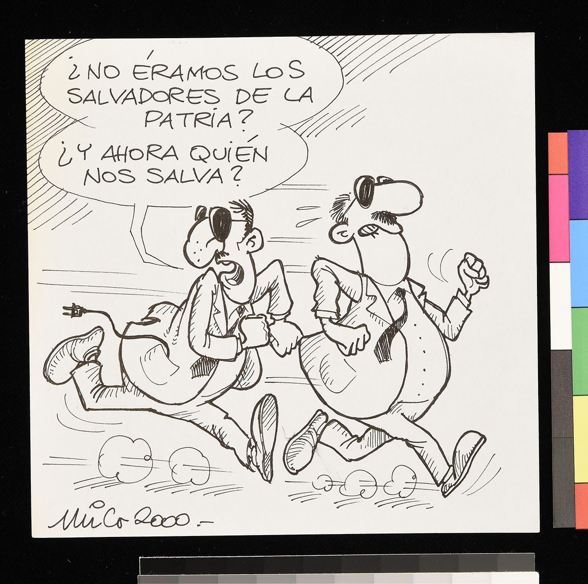 Dibujo de un avión en una pista de aterrizaje, que es perseguido por manifestantes con carteles.