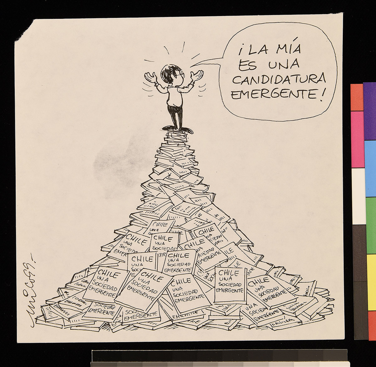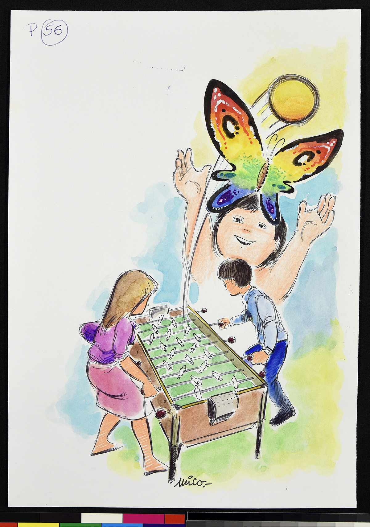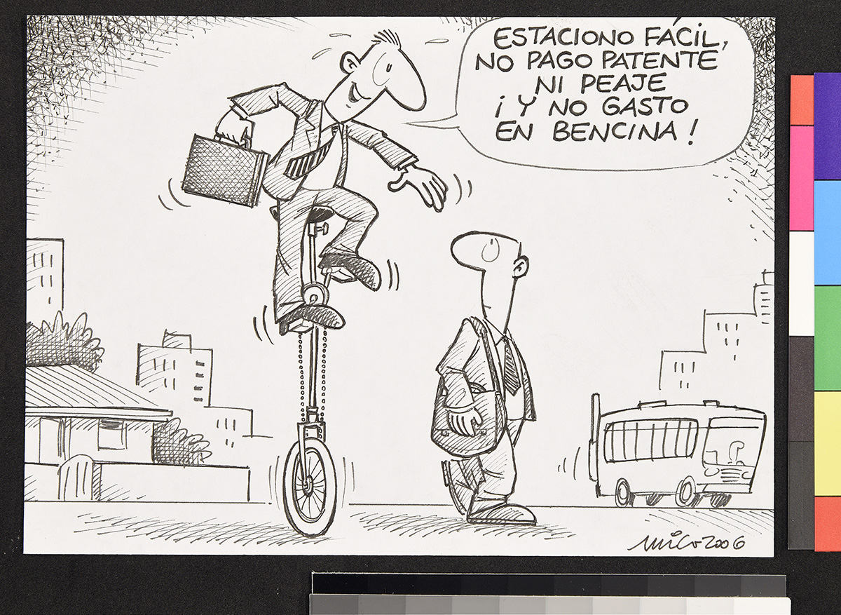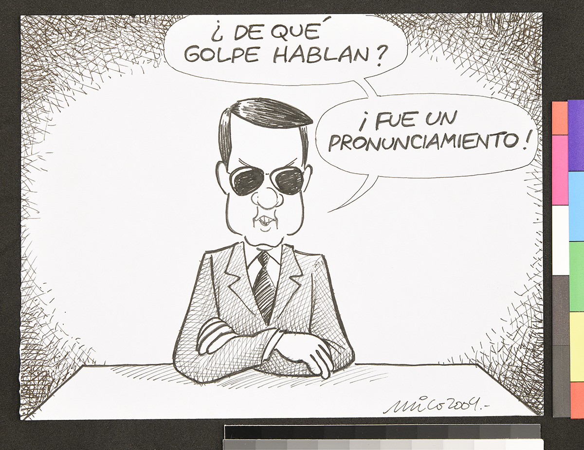 Dibujo de una persona abriendo una maleta que expulsa un polvo rojo, detrás de él hay un gato