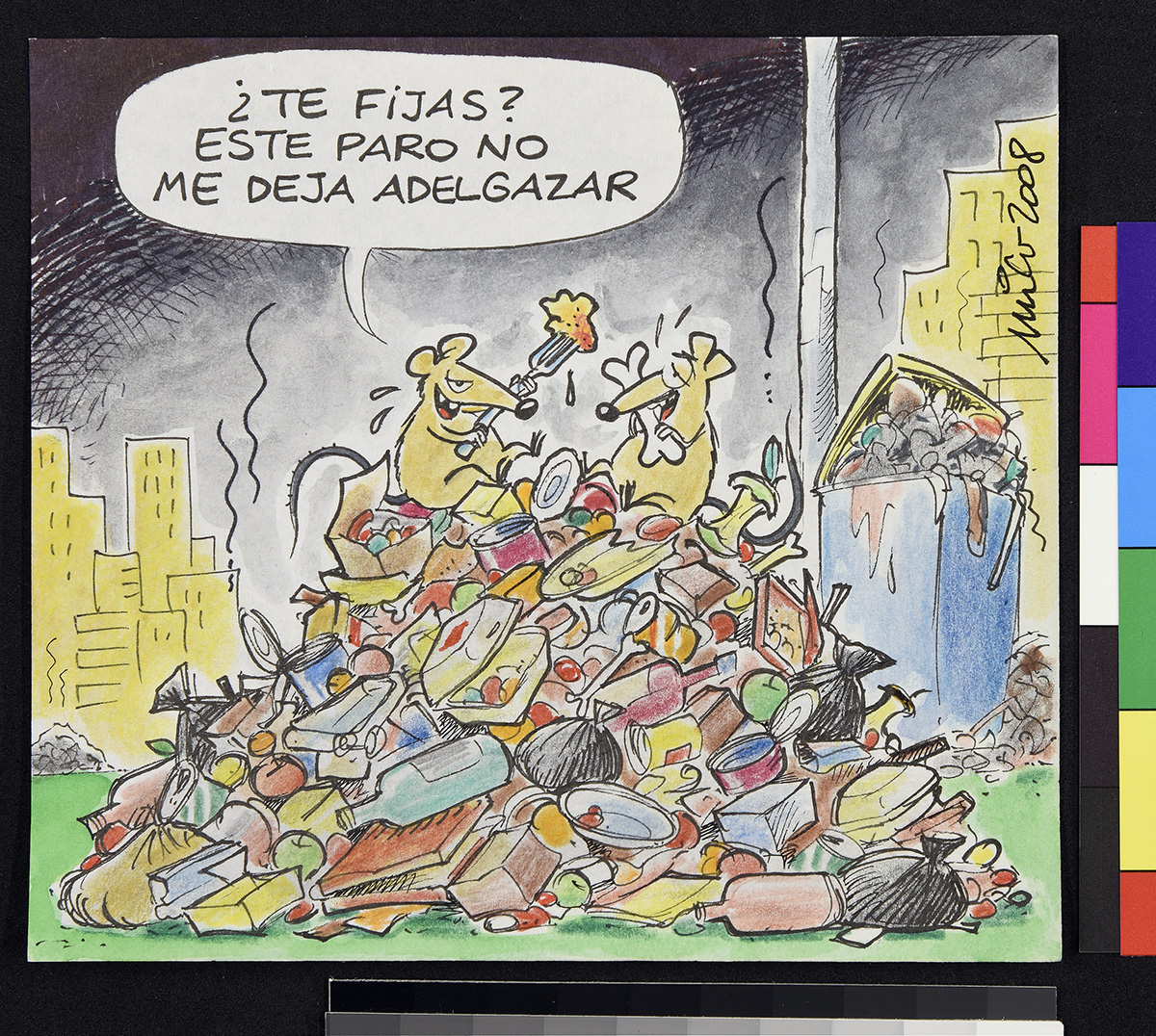 Dibujo de un hombre que tiene sus piernas abiertas y se inclina hacia su rodilla derecha, llevando en sus manos una botella de alcohol y una copa, además de un sombrero de fiesta en la cabeza.