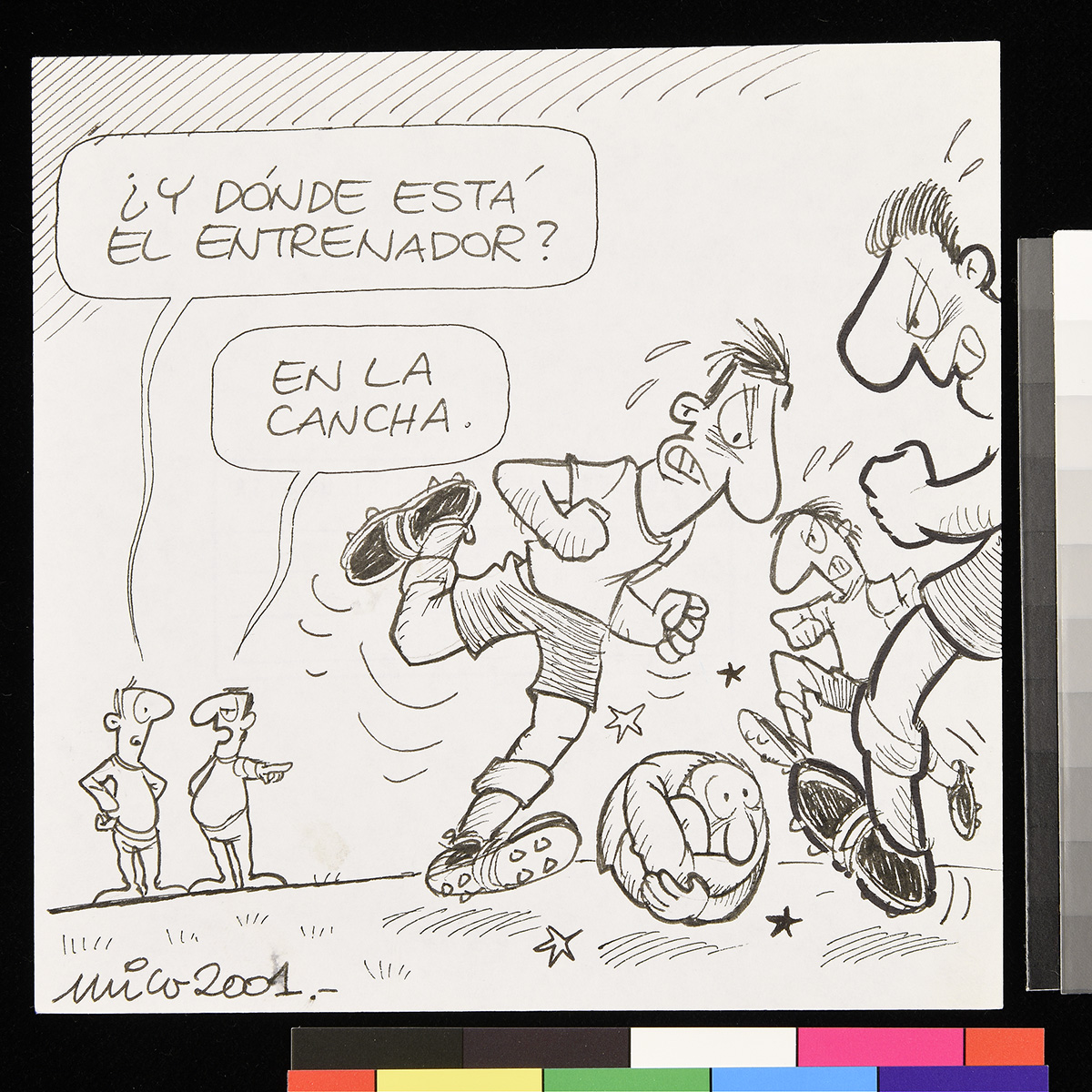 Dibujo de un soldado llevando muchas armas y municiones sobre el cuerpo, que en su chaleco antibalas tiene escrito “Looser and winner” y flamea una pequeña bandera de Estados Unidos que sostiene en su mano izquierda. Se encuentra en una zona de guerra.