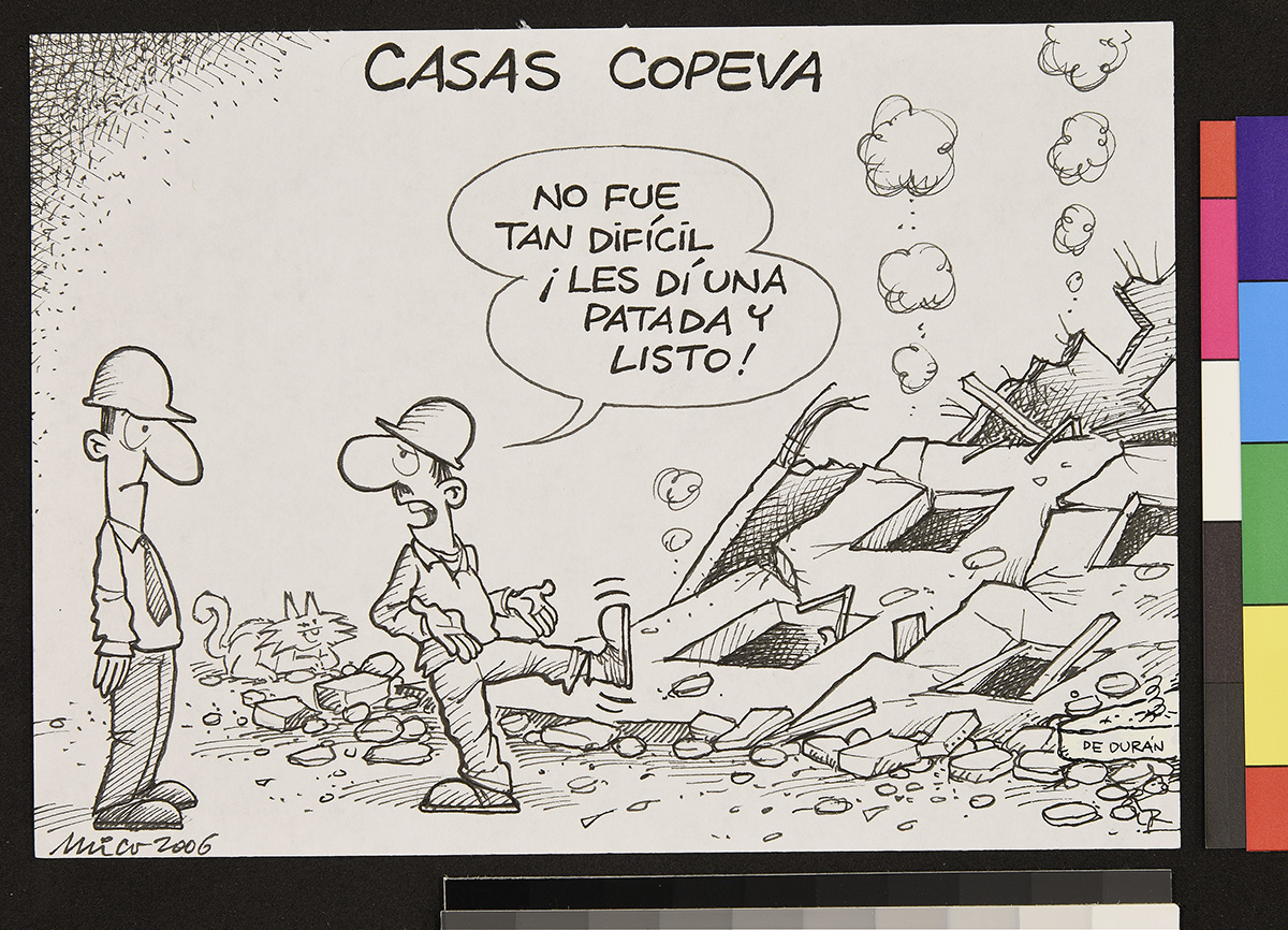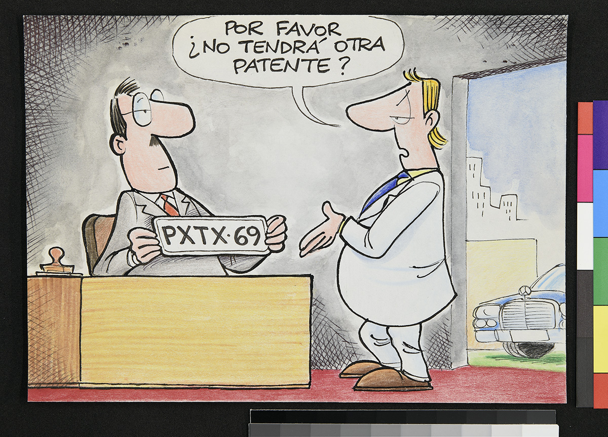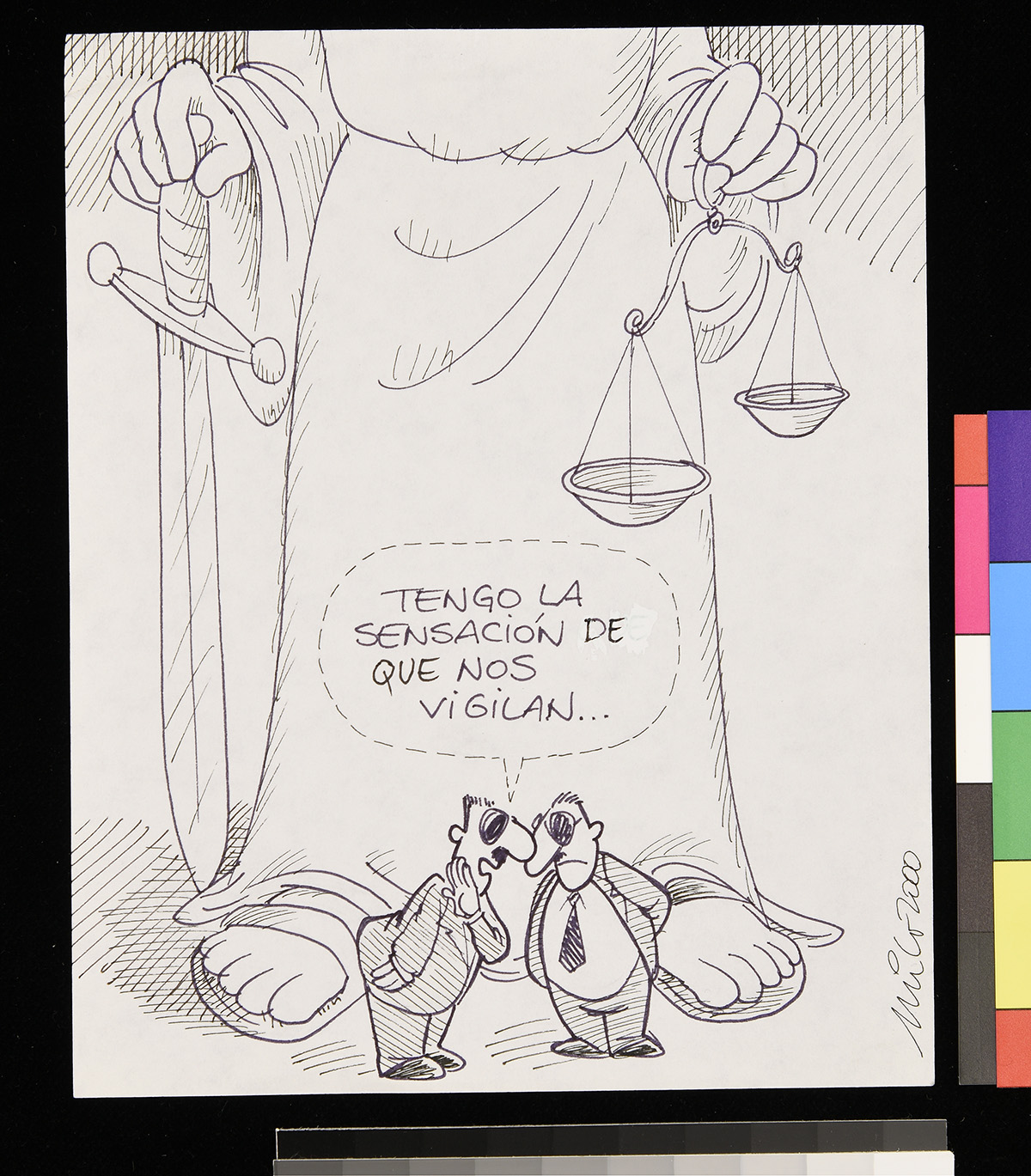 Dibujo de dos hombres vestidos con trajes de prisioneros, con números en el pecho. Uno de ellos sostiene un papel y un lápiz mientras se lo muestra a otro que está sentado.