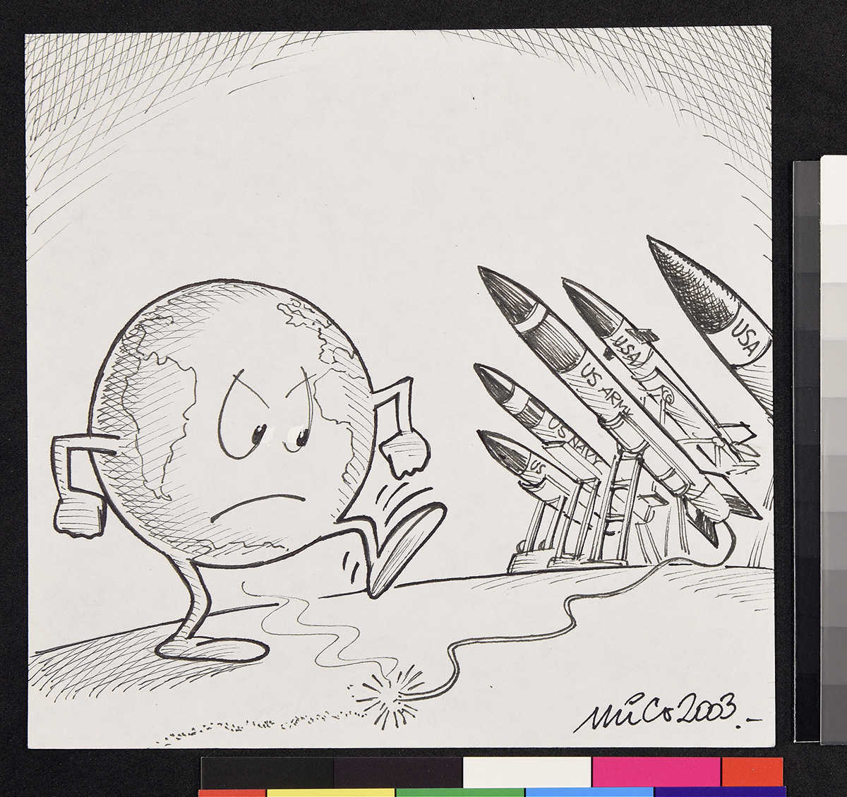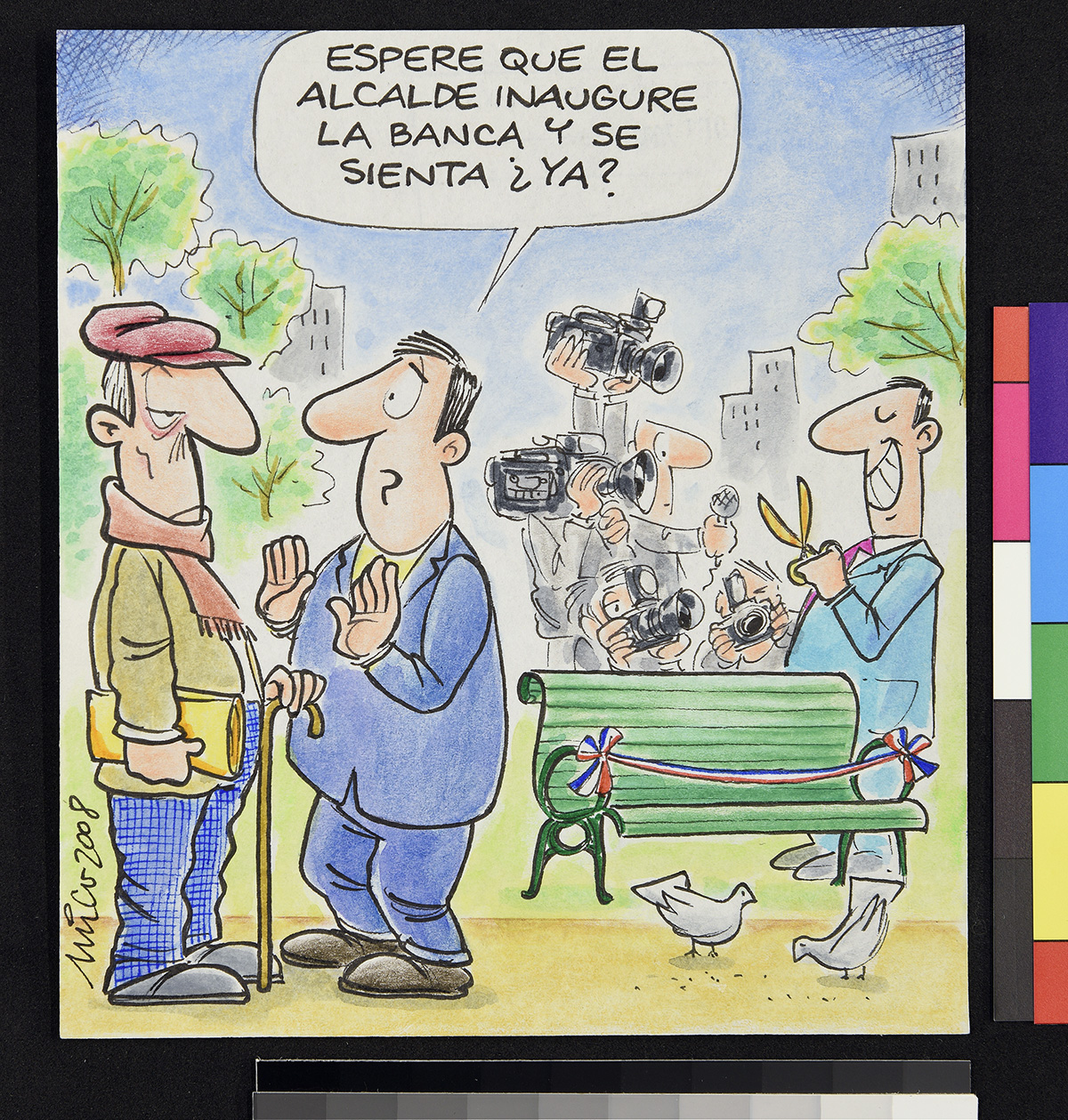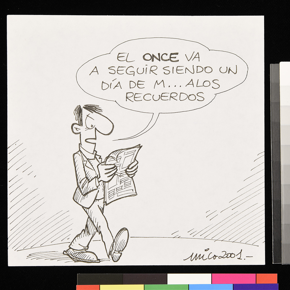 Dibujo de dos hombres vestidos con trajes de prisioneros, con números en el pecho. Uno de ellos sostiene un papel y un lápiz mientras se lo muestra a otro que está sentado.