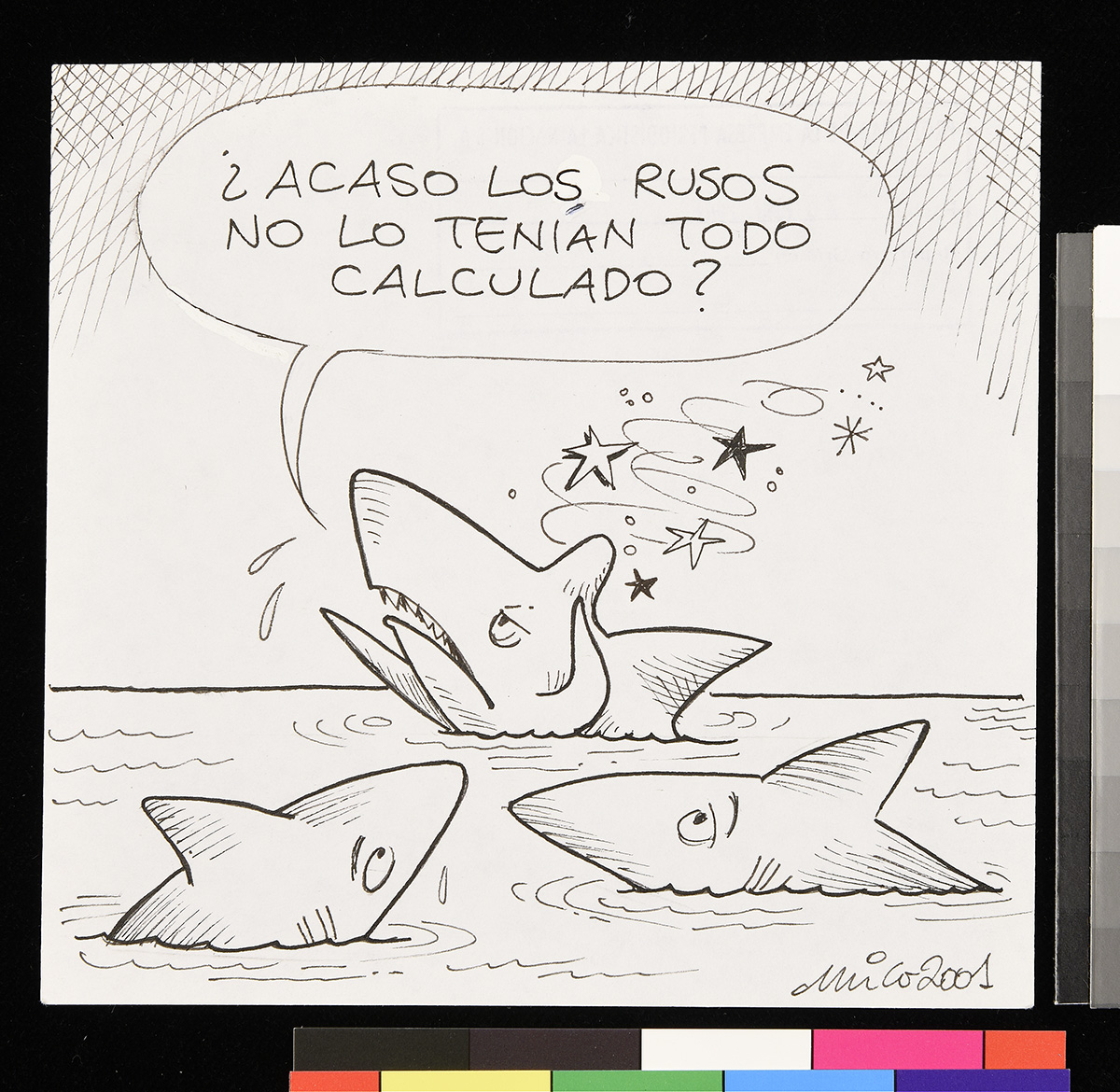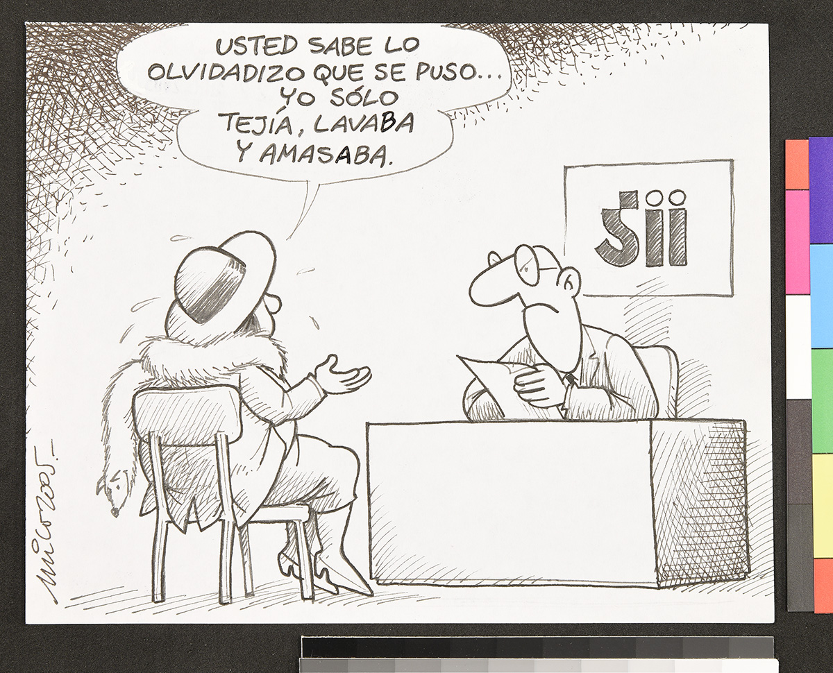 Dibujo de dos ladrones que salen corriendo de una caja con el botín en sus manos. Uno de ellos admita una lupa que lleva en su mano izquierda.
