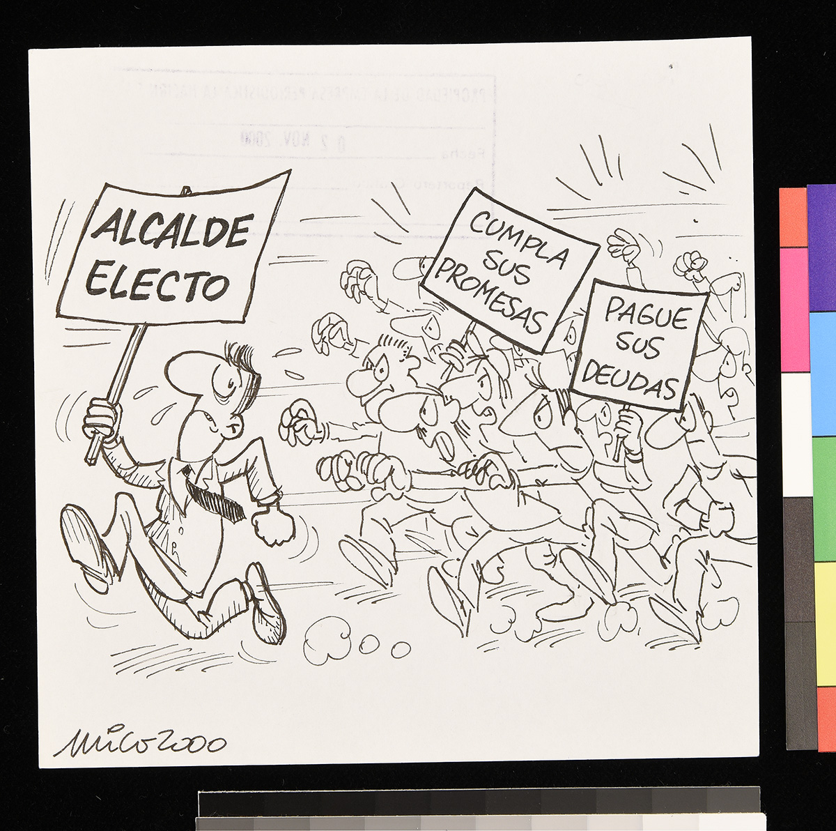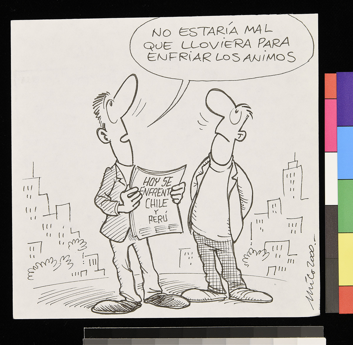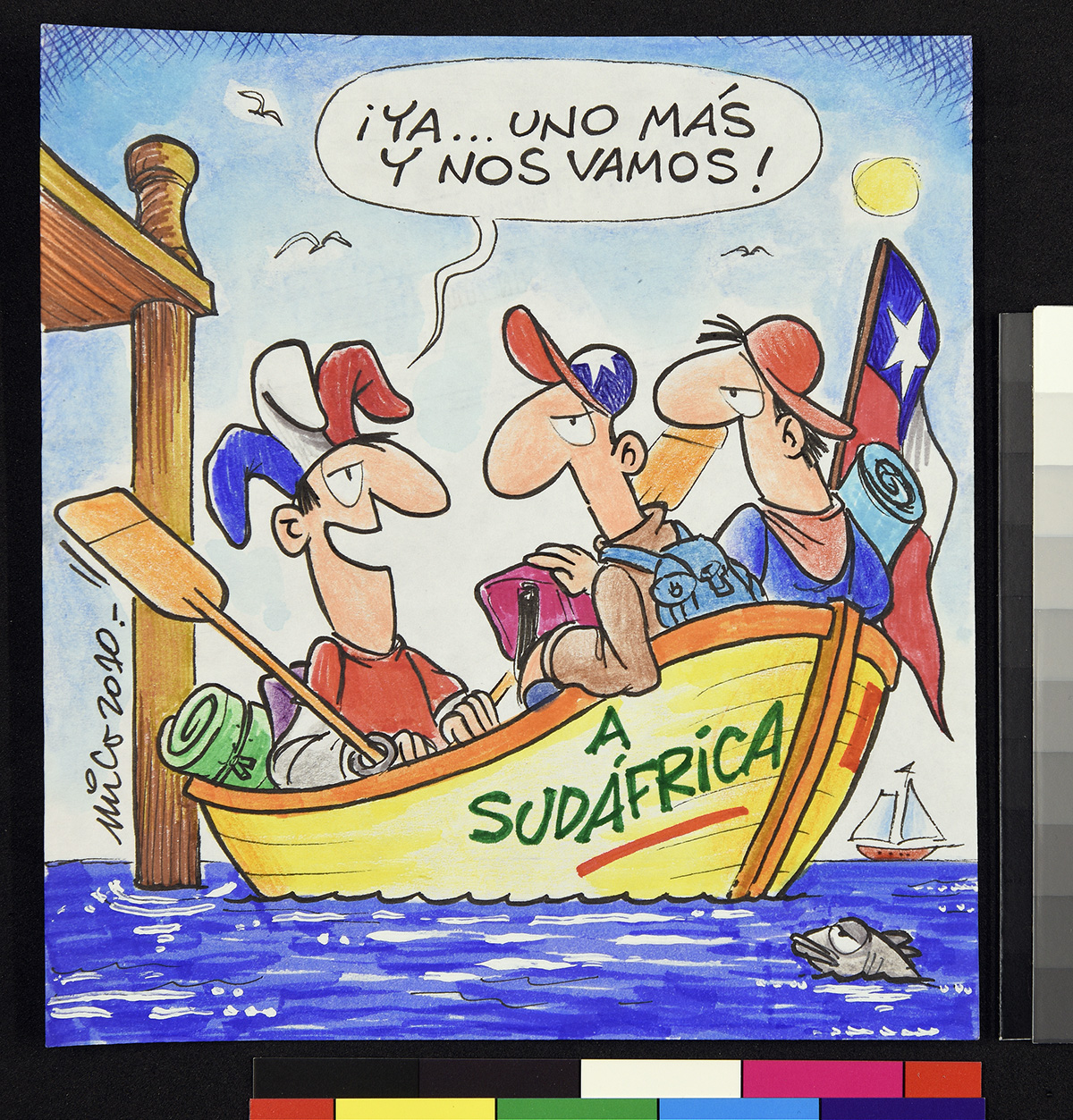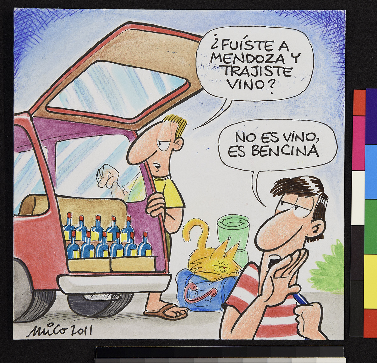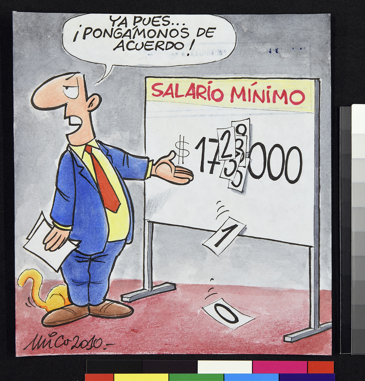 Dibujo de dos hombres que estos tienen cada uno las piernas de otro sujeto que hace de carretilla, sujetando entre sus manos una rueda mientras sus otros compañeros lo arrastran. En el fondo otro hombre con casco de seguridad conversar con alguien fuera del cuadro.