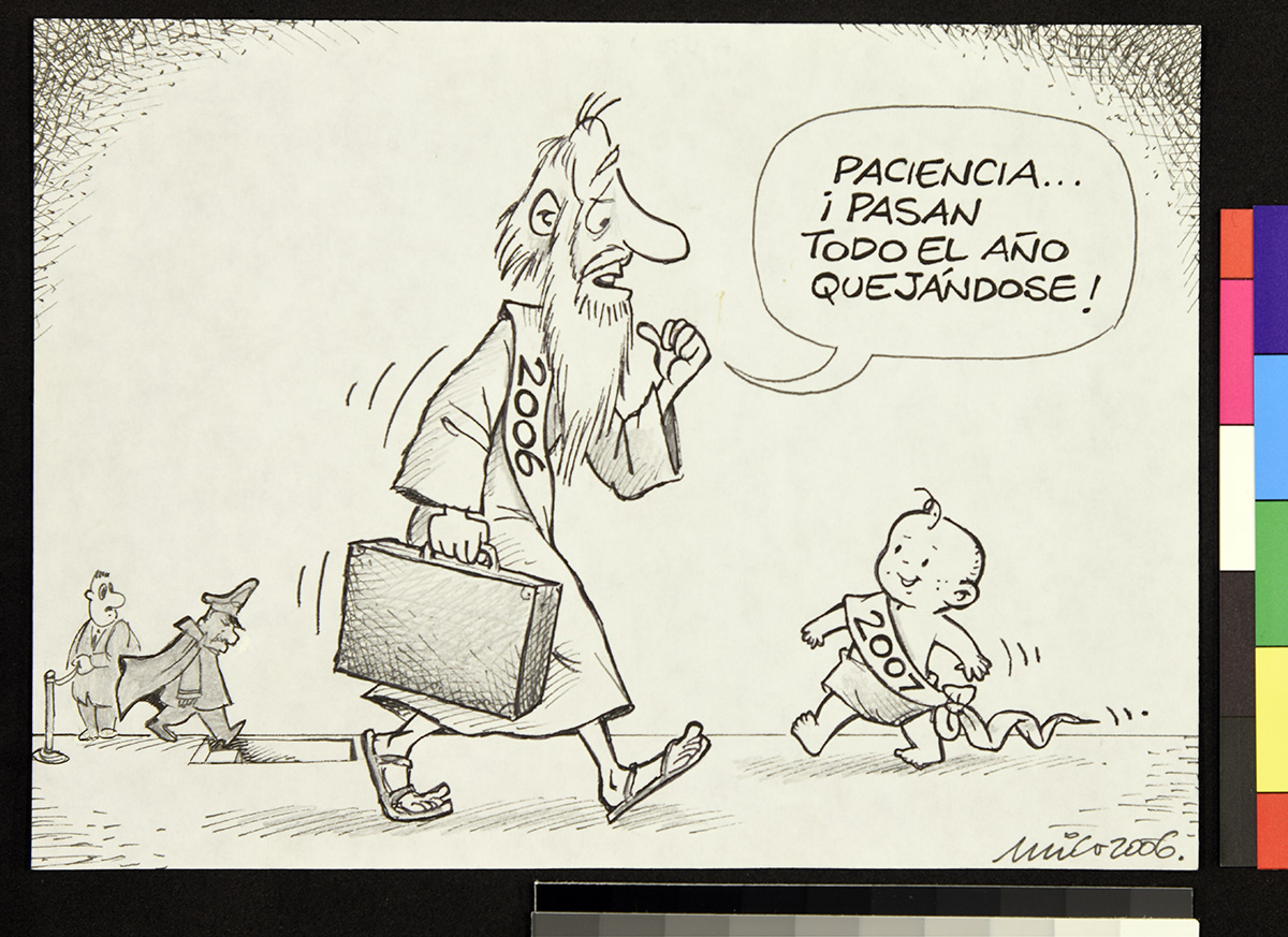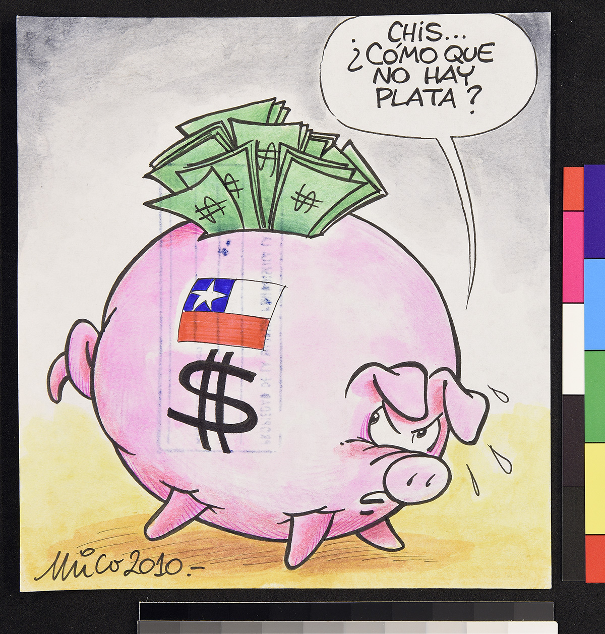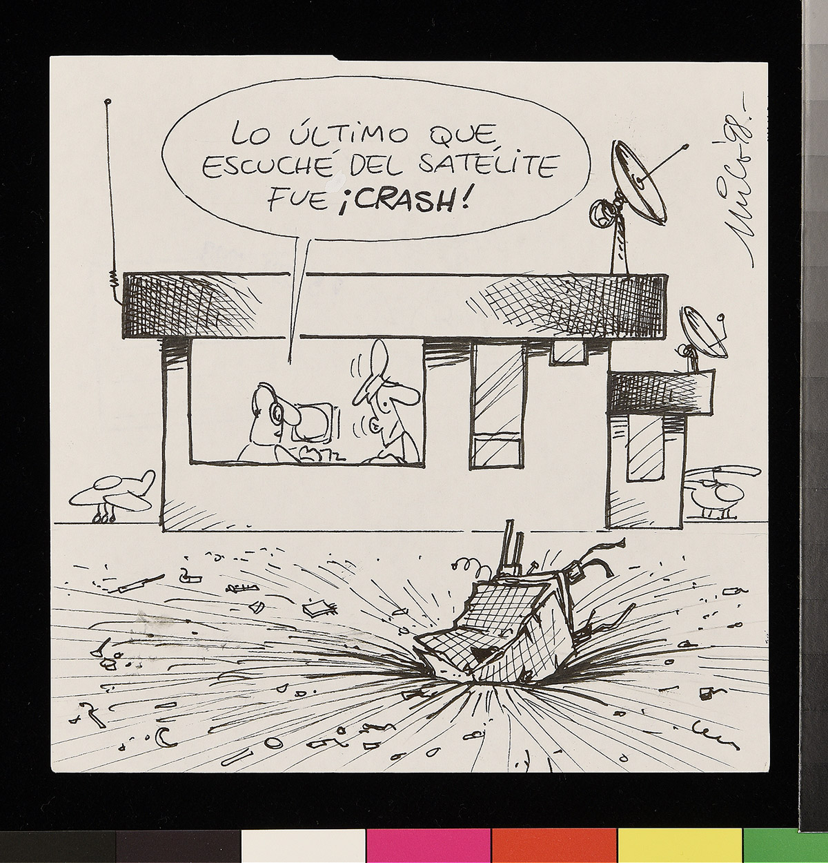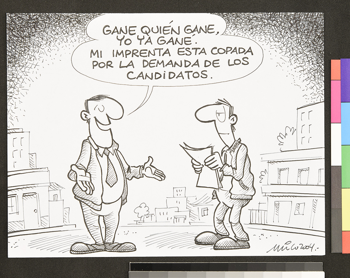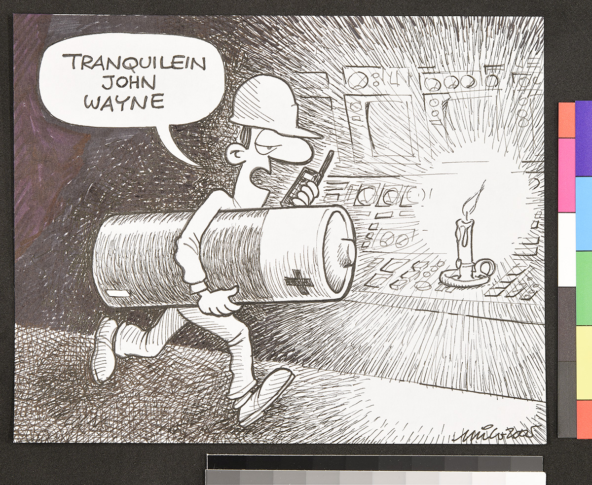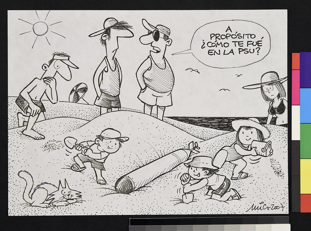 Dibujo de dos hombres que estos tienen cada uno las piernas de otro sujeto que hace de carretilla, sujetando entre sus manos una rueda mientras sus otros compañeros lo arrastran. En el fondo otro hombre con casco de seguridad conversar con alguien fuera del cuadro.