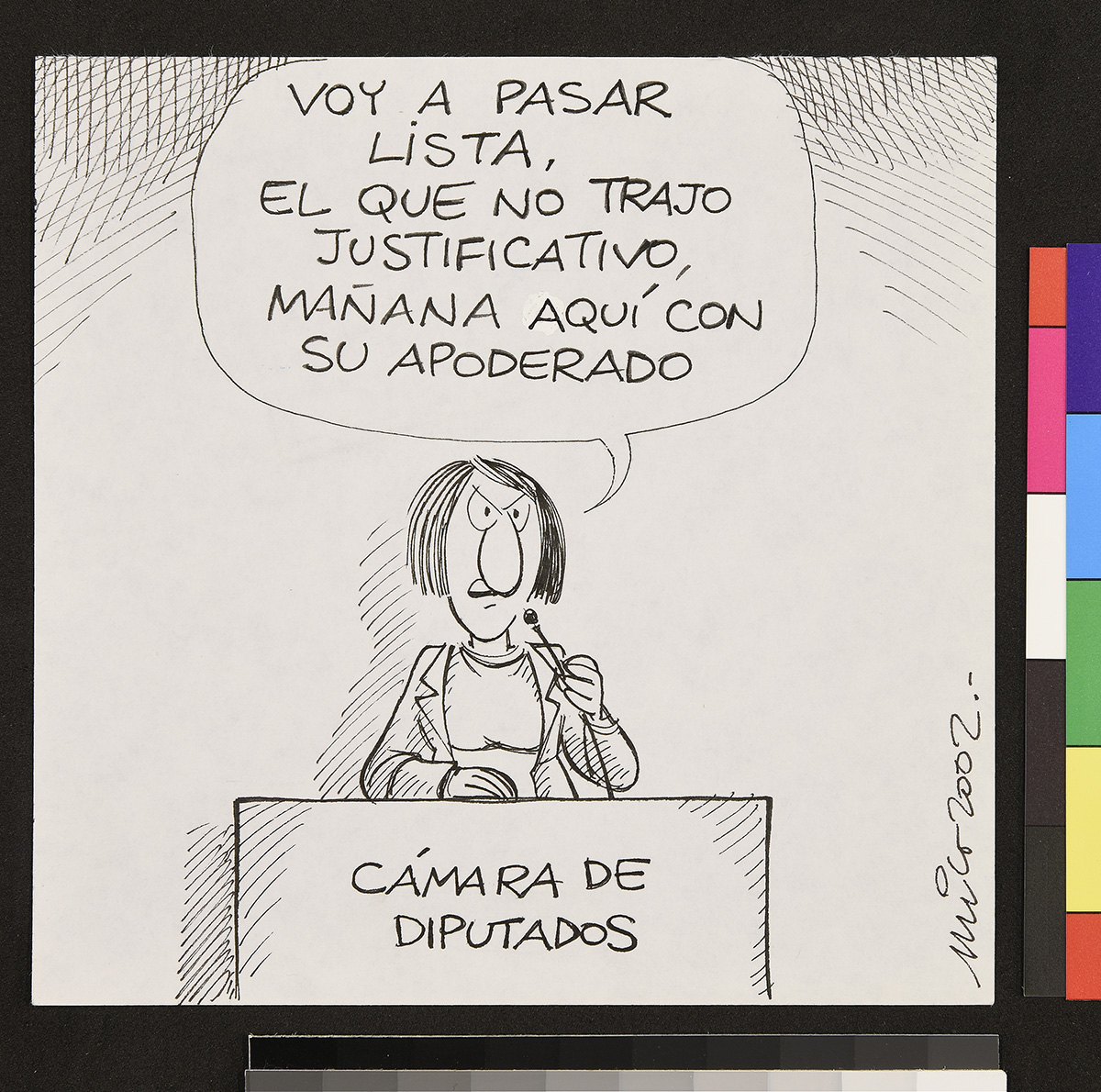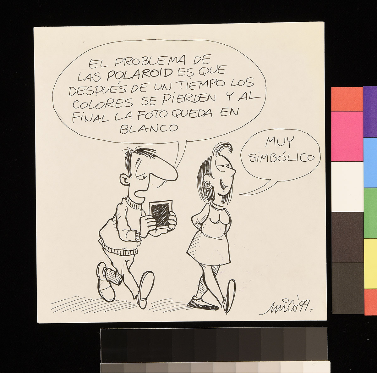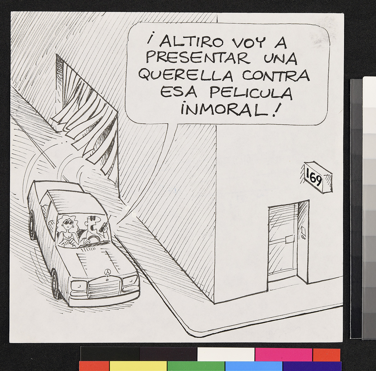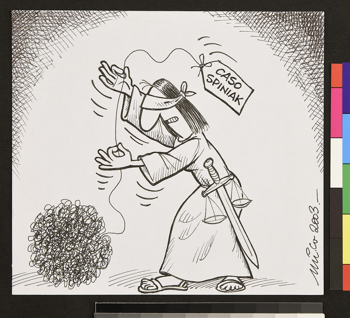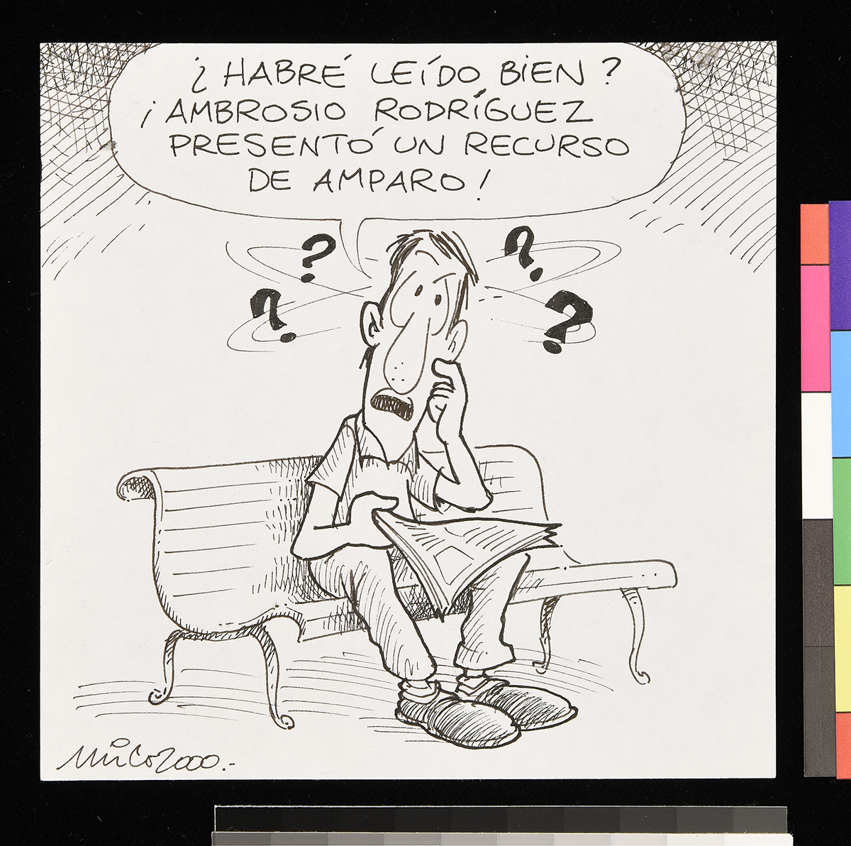 Dibujo de dos hombres que estos tienen cada uno las piernas de otro sujeto que hace de carretilla, sujetando entre sus manos una rueda mientras sus otros compañeros lo arrastran. En el fondo otro hombre con casco de seguridad conversar con alguien fuera del cuadro.