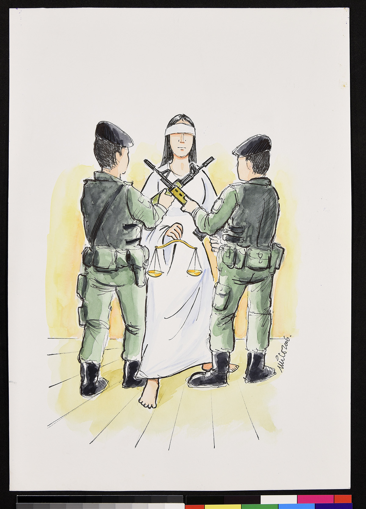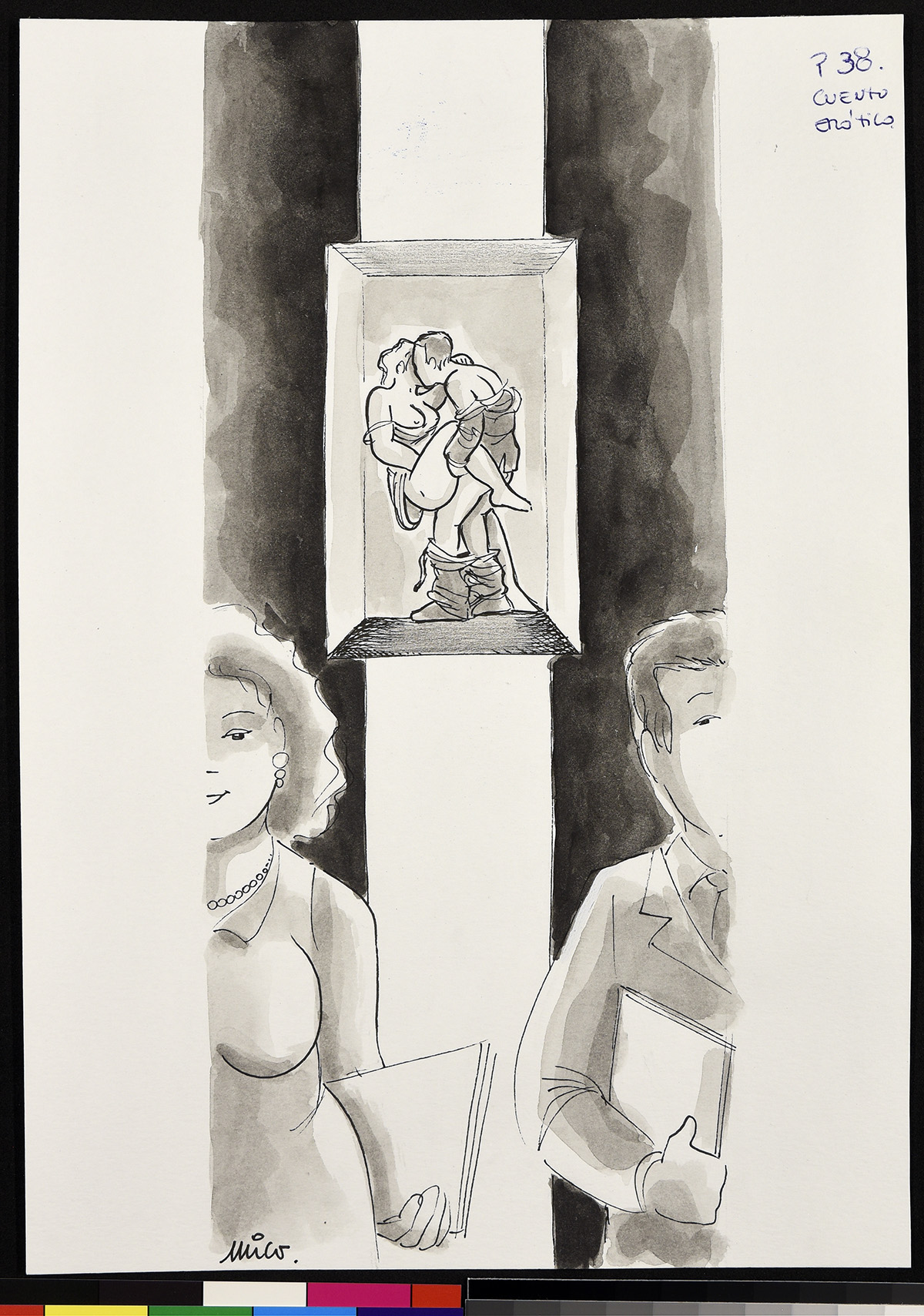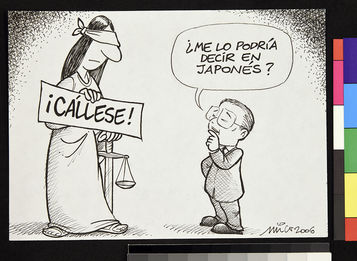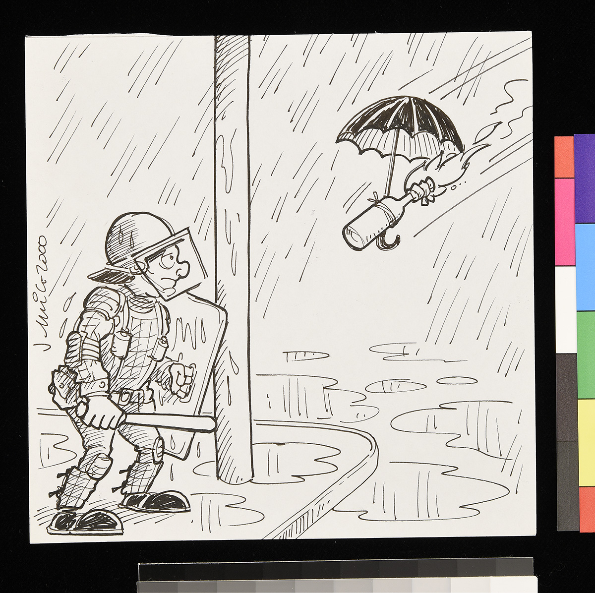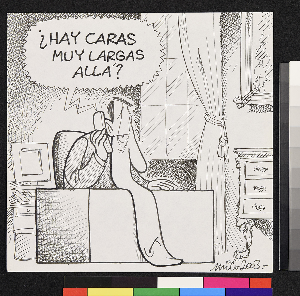 Dibujo de dos hombres que estos tienen cada uno las piernas de otro sujeto que hace de carretilla, sujetando entre sus manos una rueda mientras sus otros compañeros lo arrastran. En el fondo otro hombre con casco de seguridad conversar con alguien fuera del cuadro.