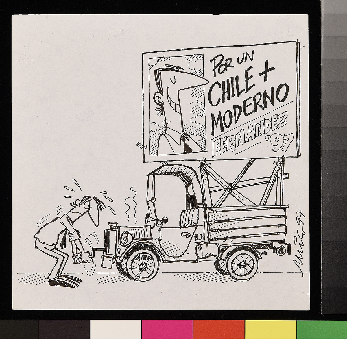 Dibujo de un fantasma que tiene sus manos esposadas sosteniendo varios papeles que dicen “Facturas”. Está al lado de dos Carabineros que están de pie.