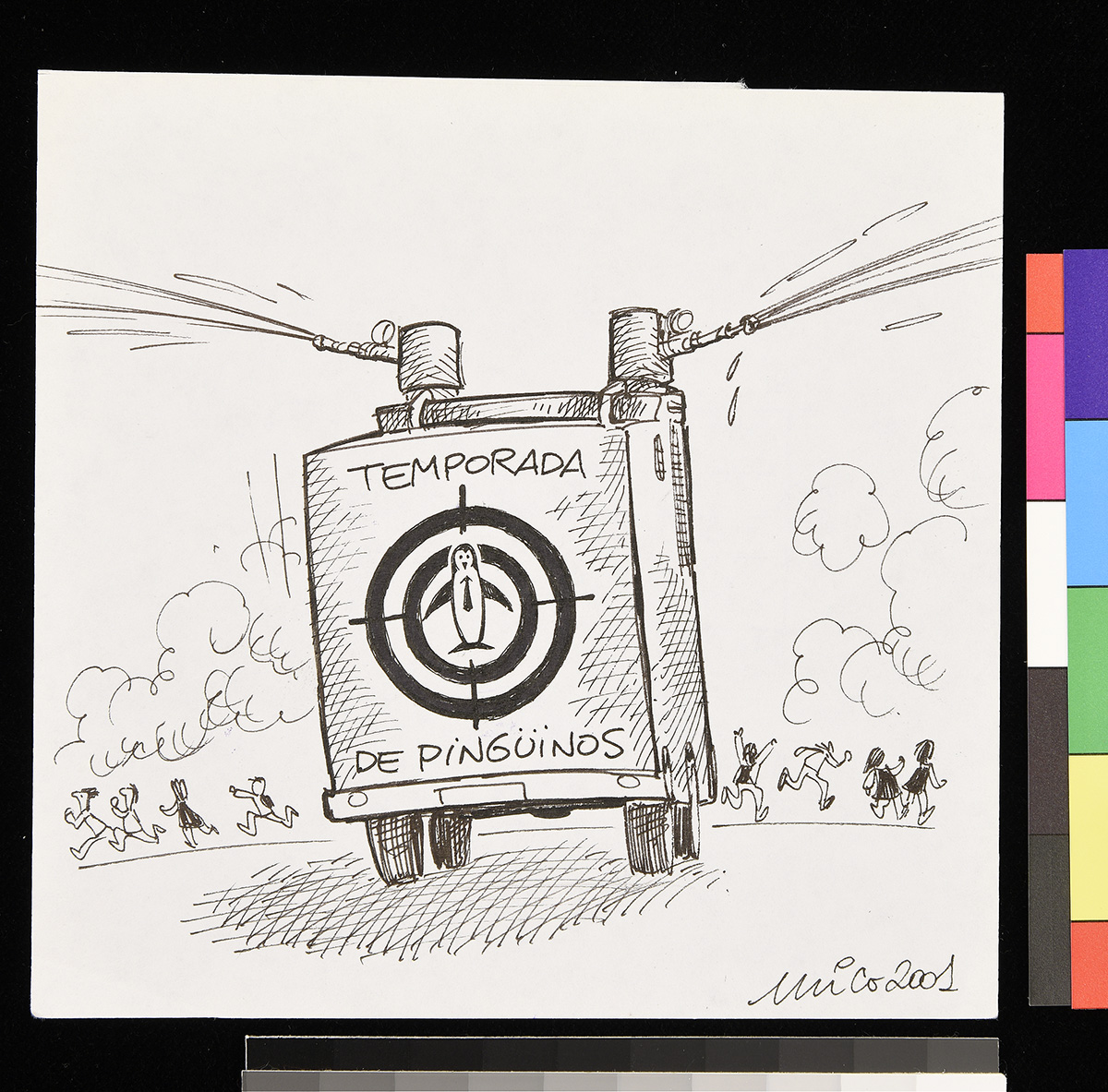 Dibujo de tres mujeres, una sentada frente a un escritorio y las otras dos de pie, que miran molestas hacia el interior de una habitación.