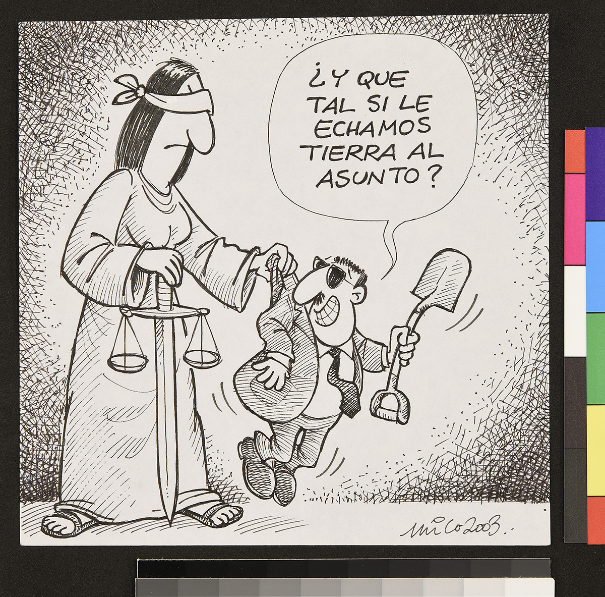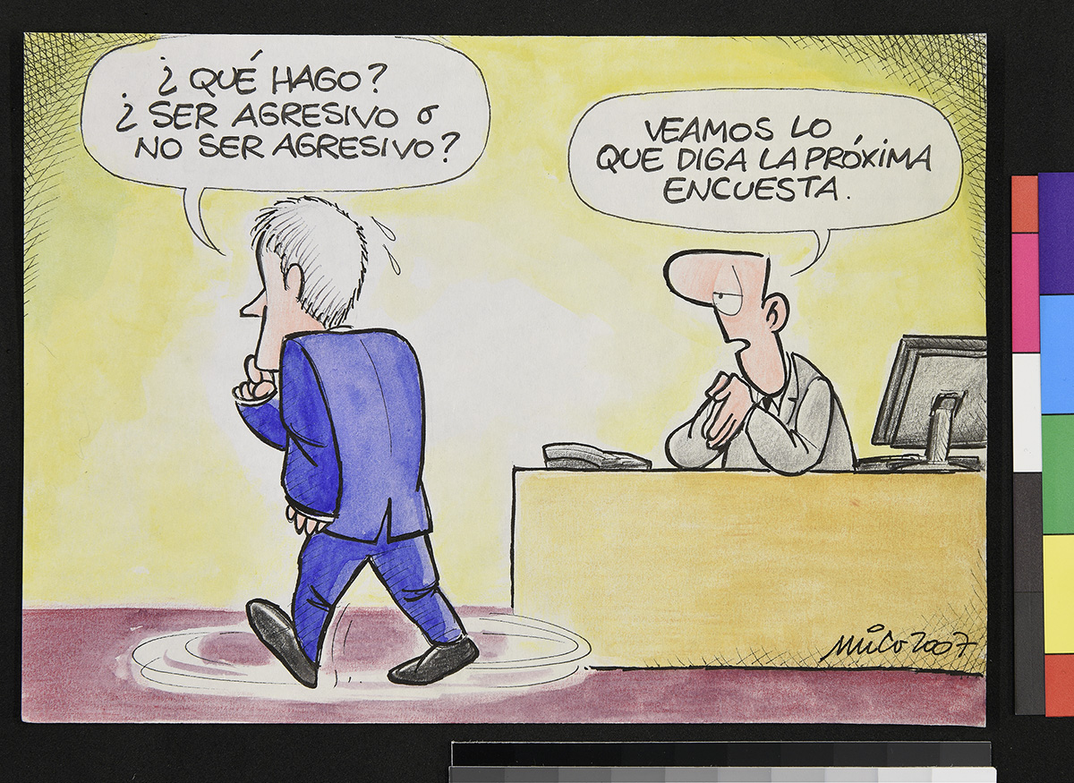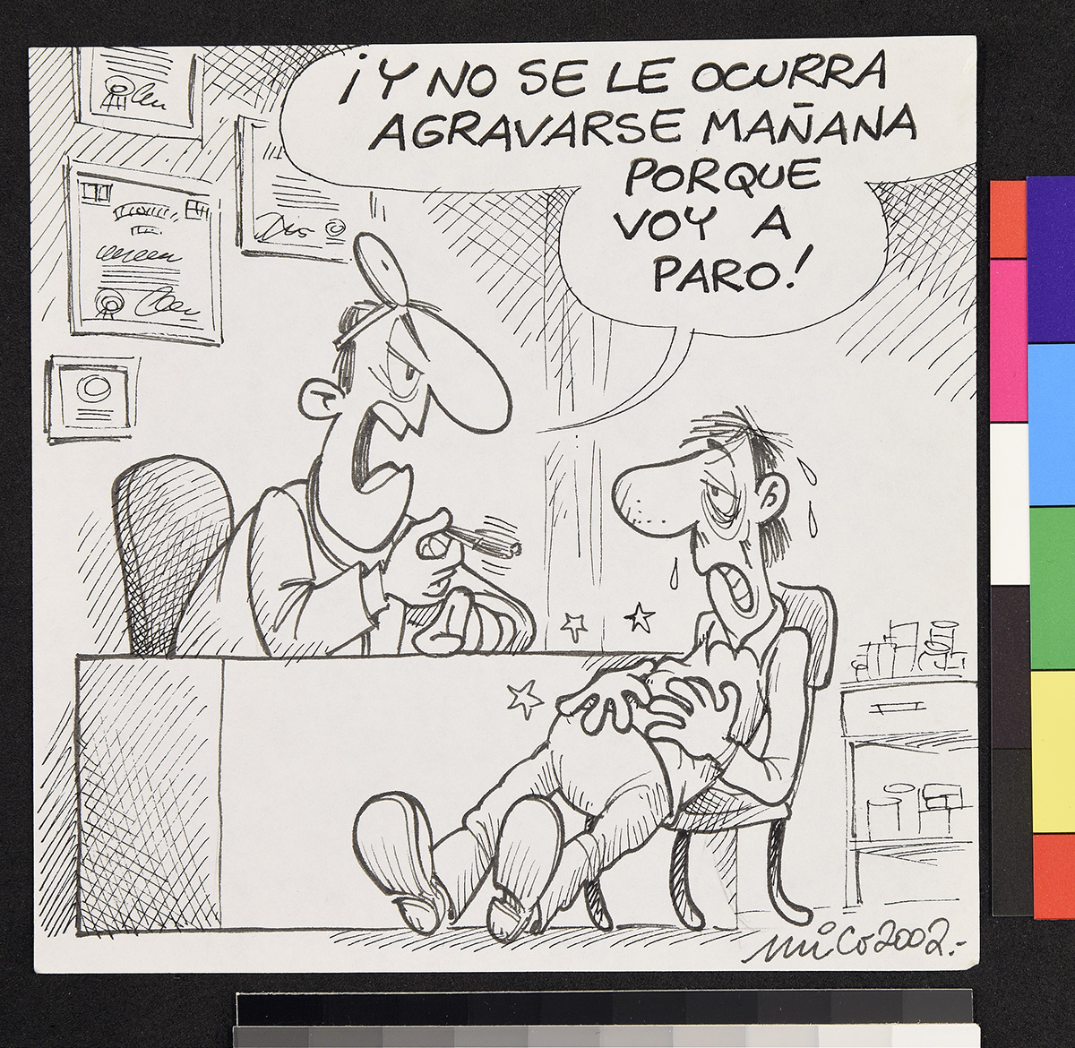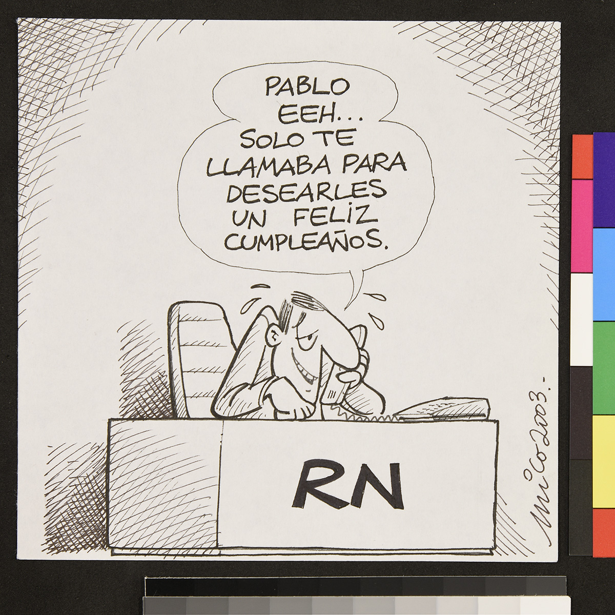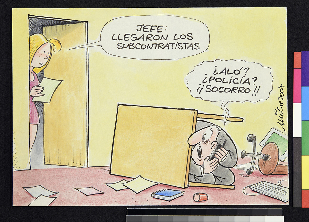 Dibujo de un hombre con un peinado, lentes oscuros y con varios piercing en su rostro que está sentado frente a un escritorio. En la parte frontal del mueble se encuentran dos letreros con anuncios para la atención a clientes.