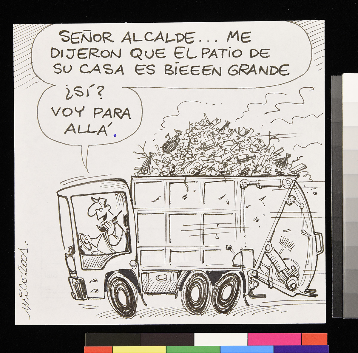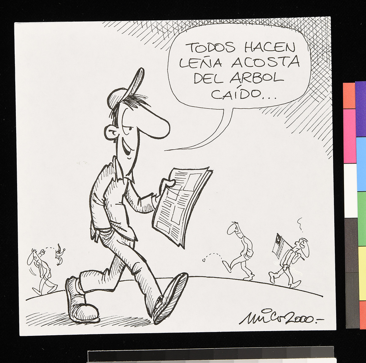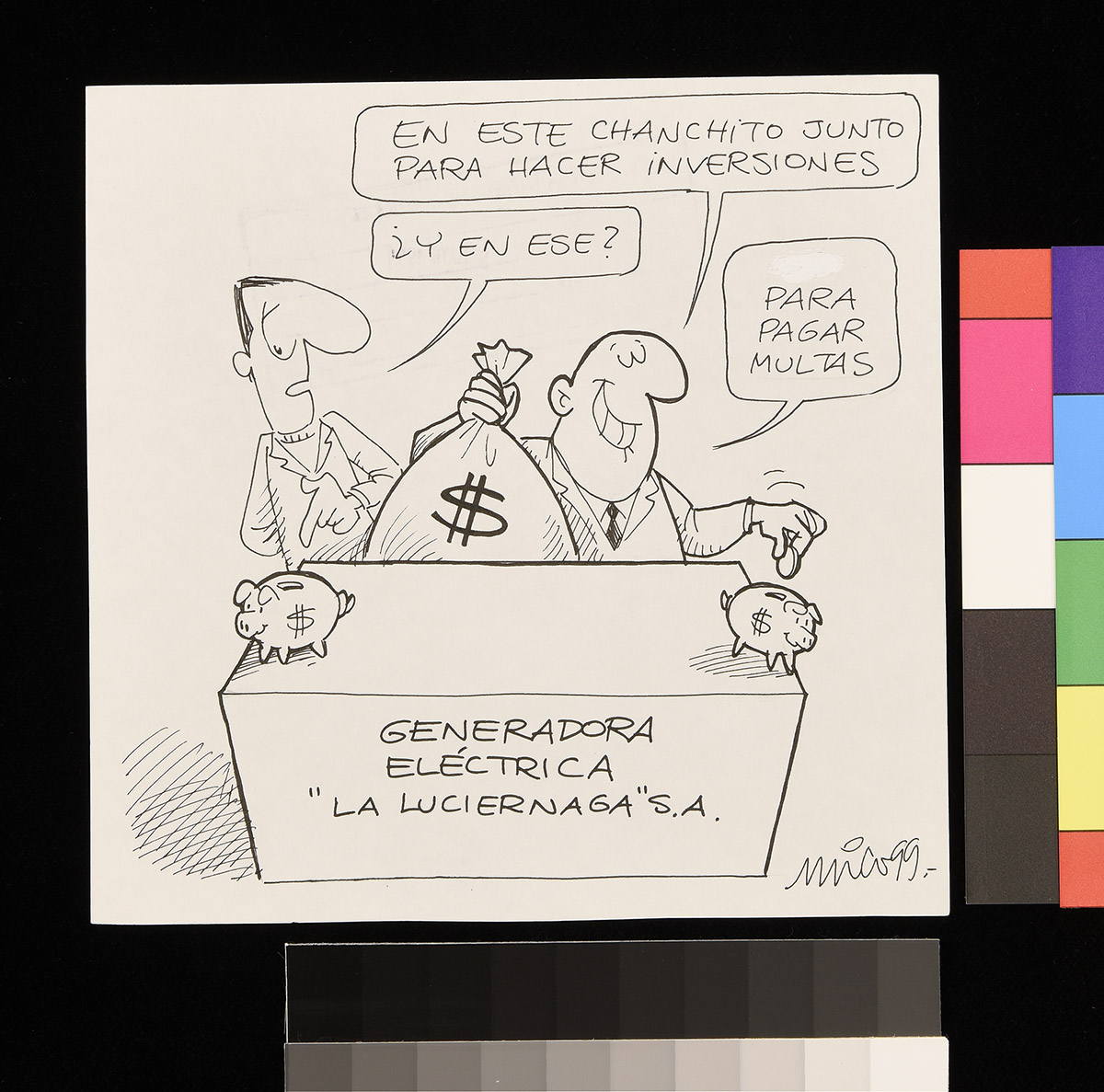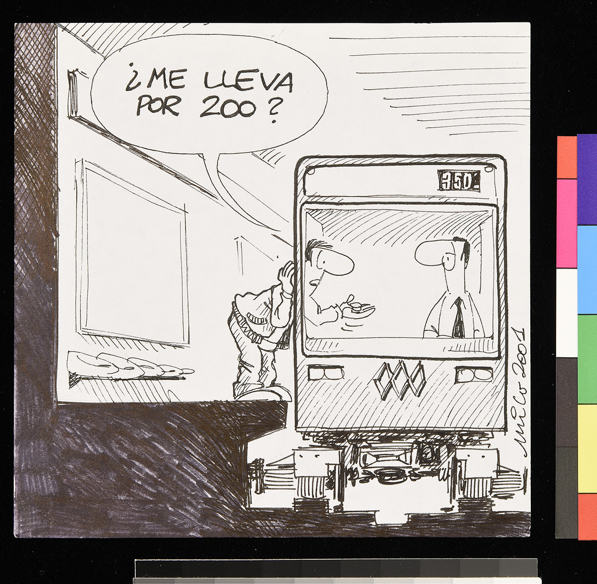 Dibujo de un hombre con un peinado, lentes oscuros y con varios piercing en su rostro que está sentado frente a un escritorio. En la parte frontal del mueble se encuentran dos letreros con anuncios para la atención a clientes.