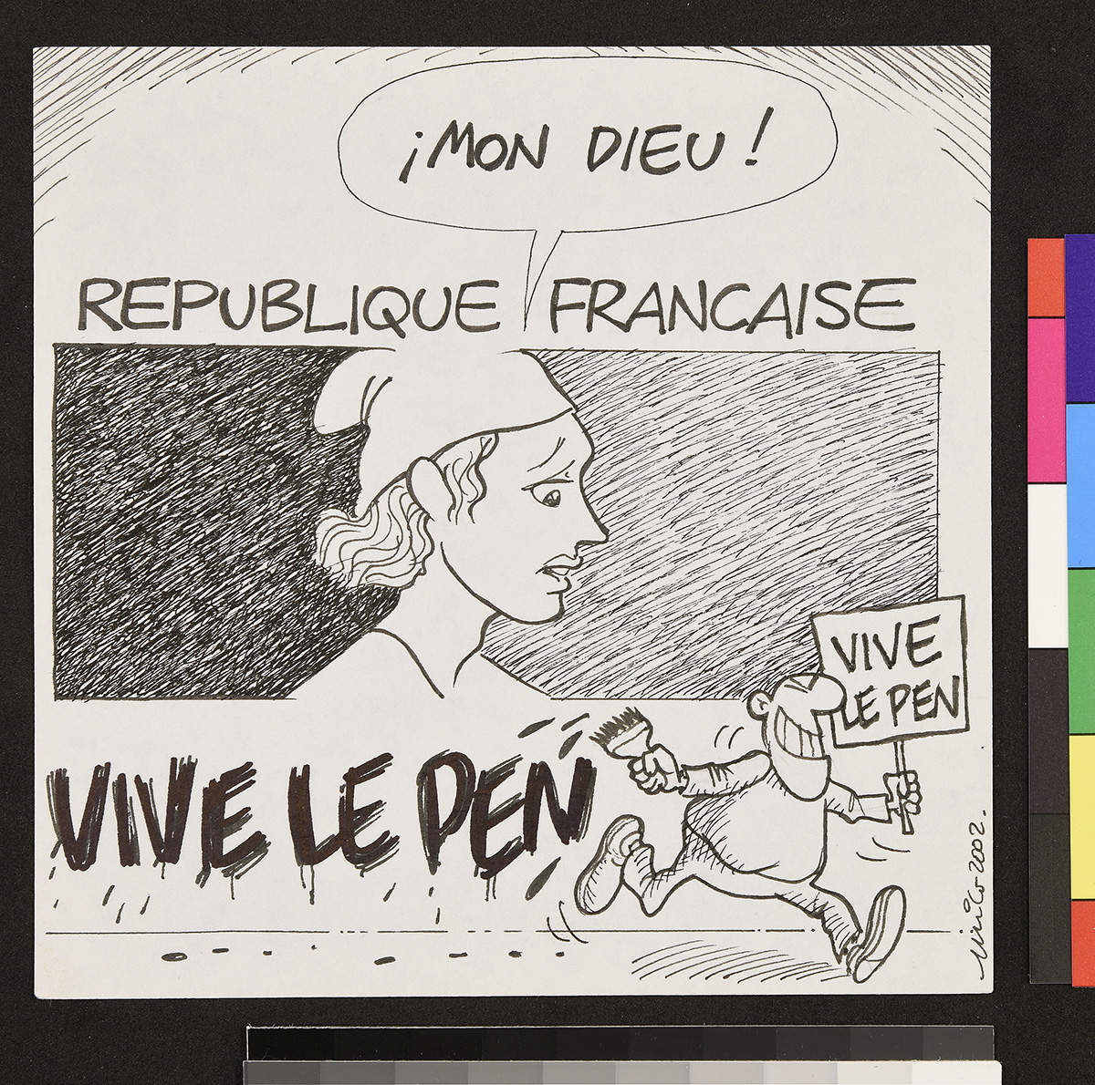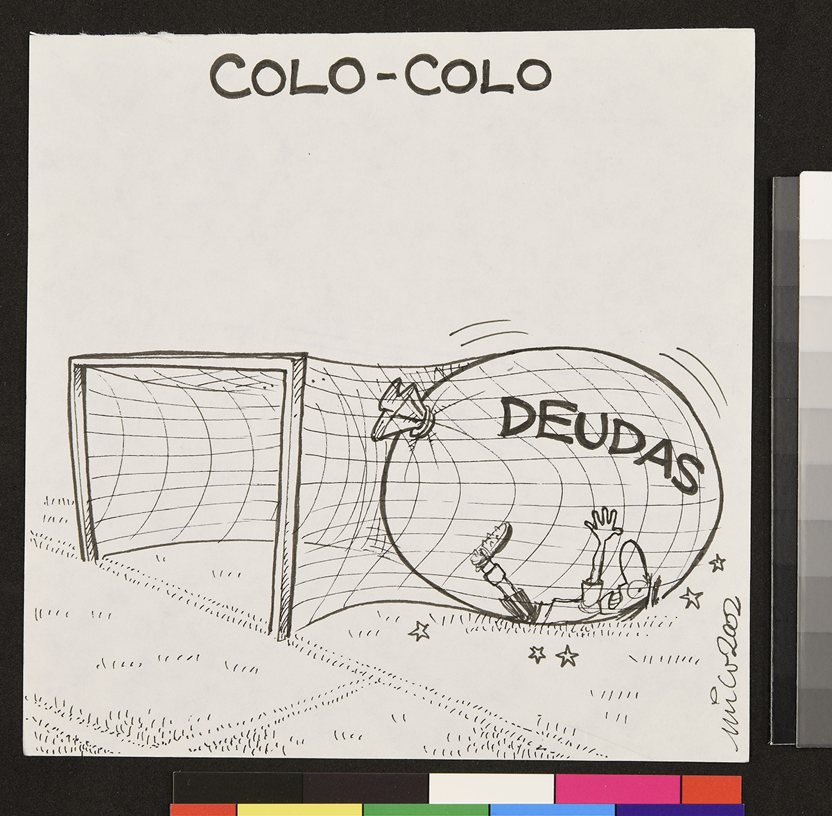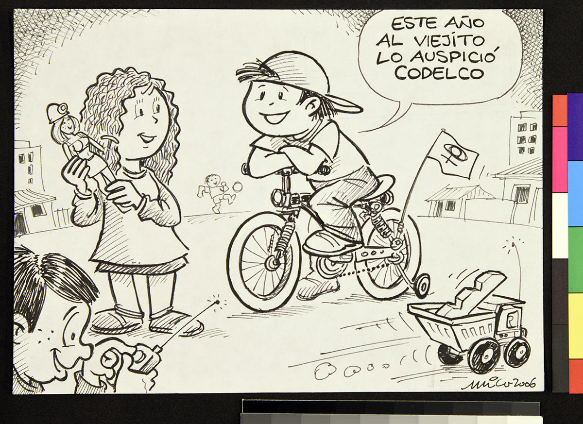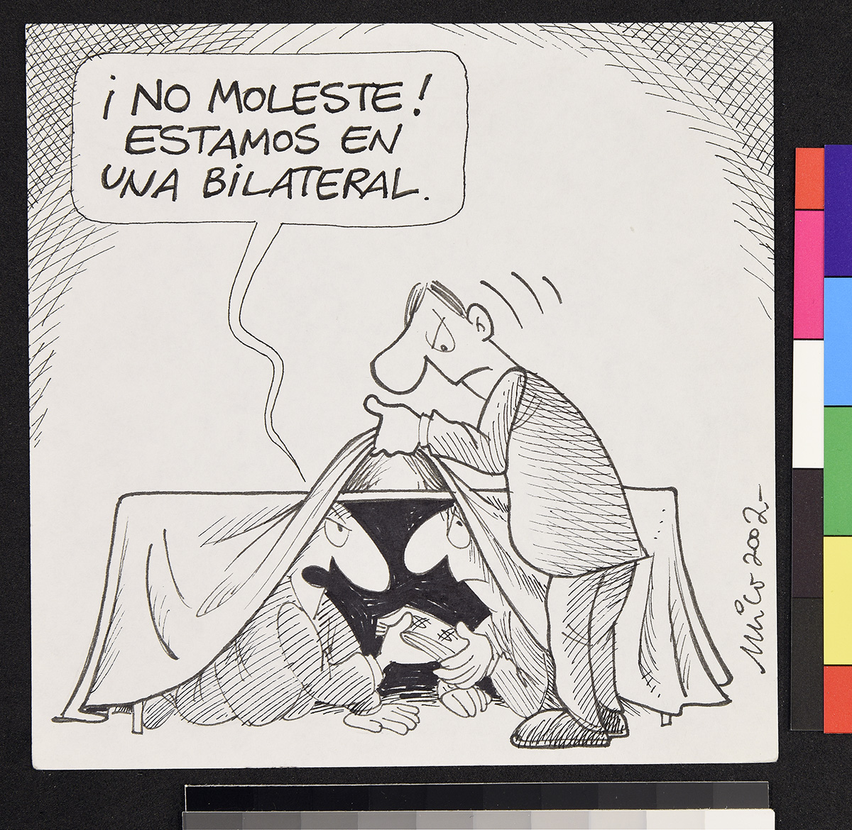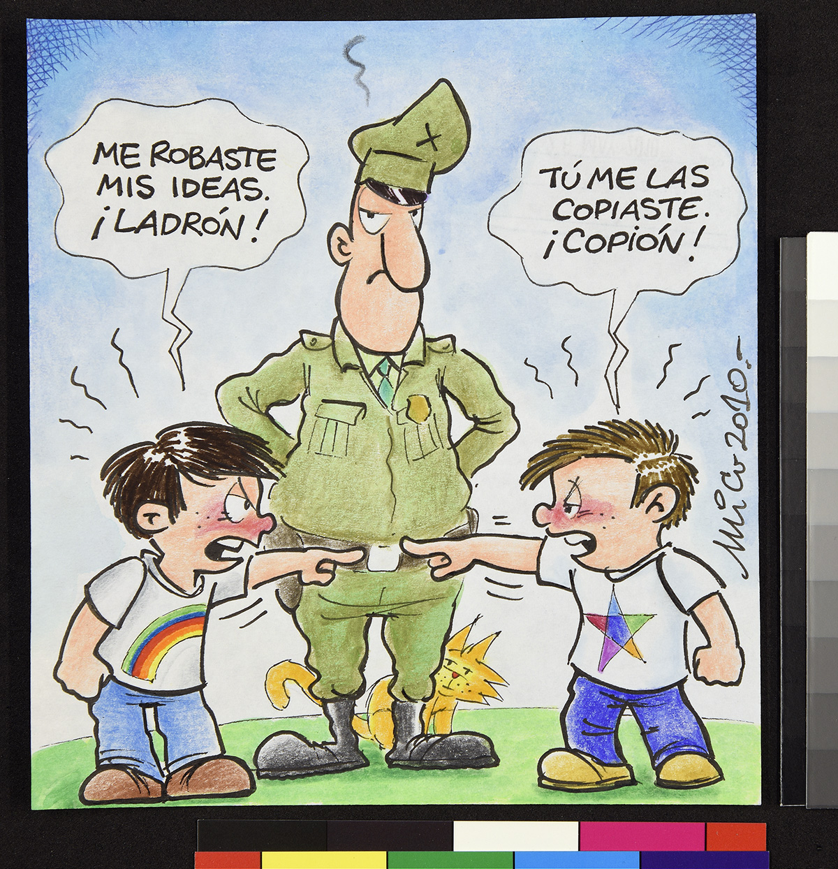 Dibujo de un hombre con un peinado, lentes oscuros y con varios piercing en su rostro que está sentado frente a un escritorio. En la parte frontal del mueble se encuentran dos letreros con anuncios para la atención a clientes.