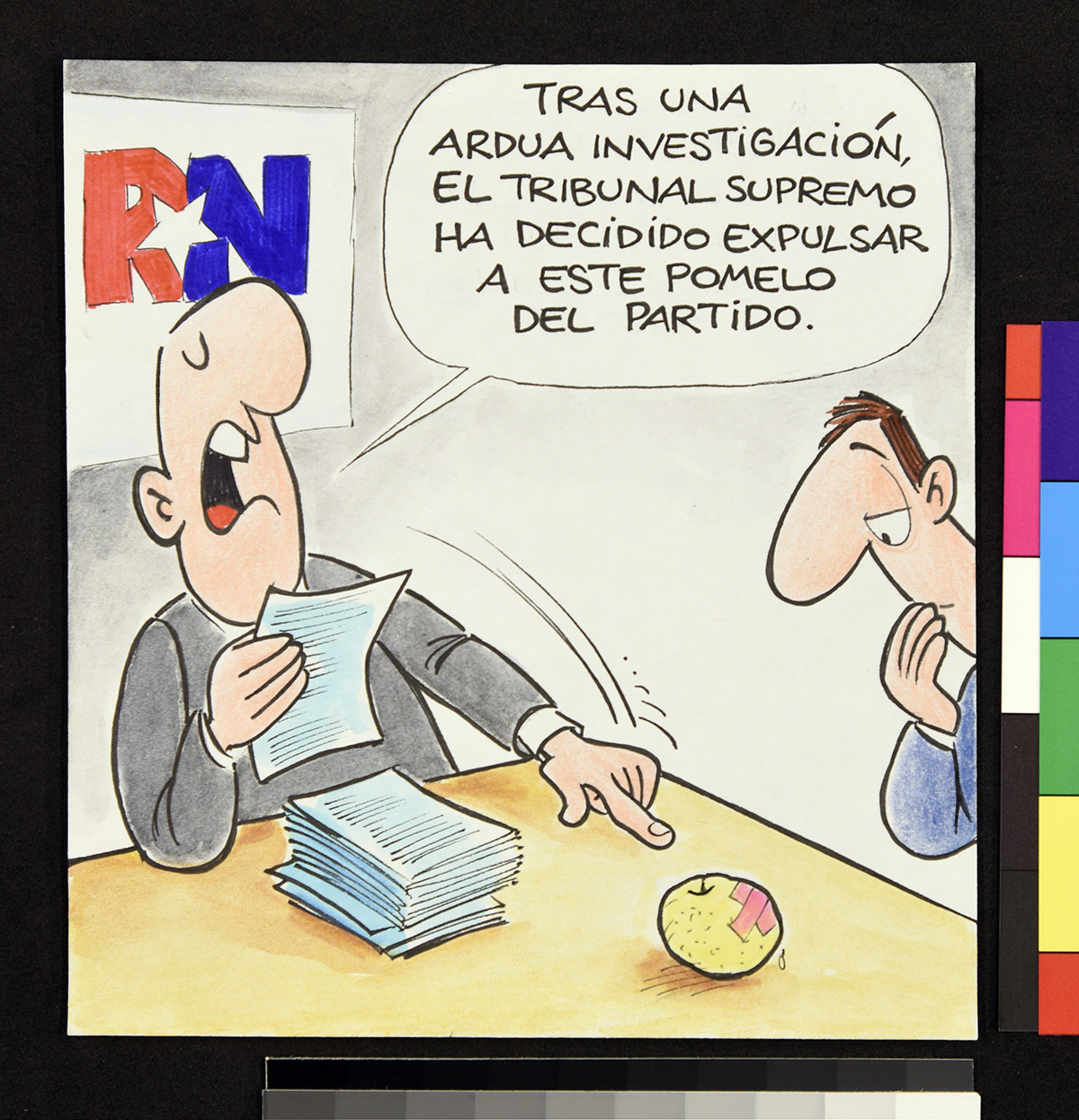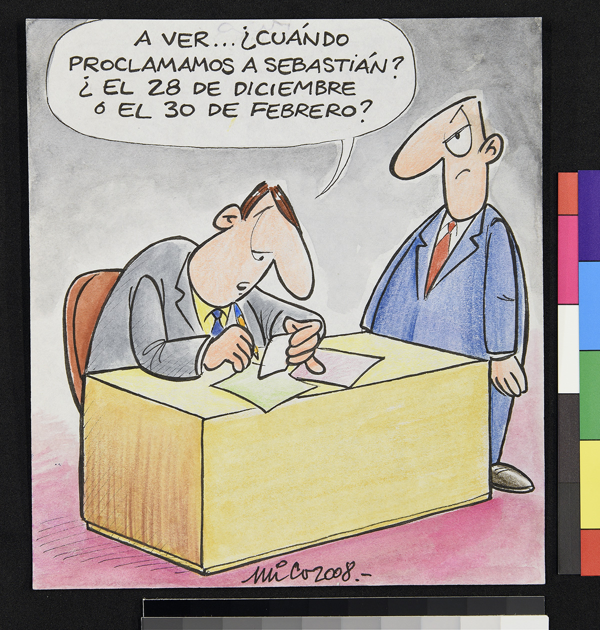 Dibujo de un hombre que asoma su cabeza por la puerta de una carpa. Se encuentra rodeado de árboles recién talados.