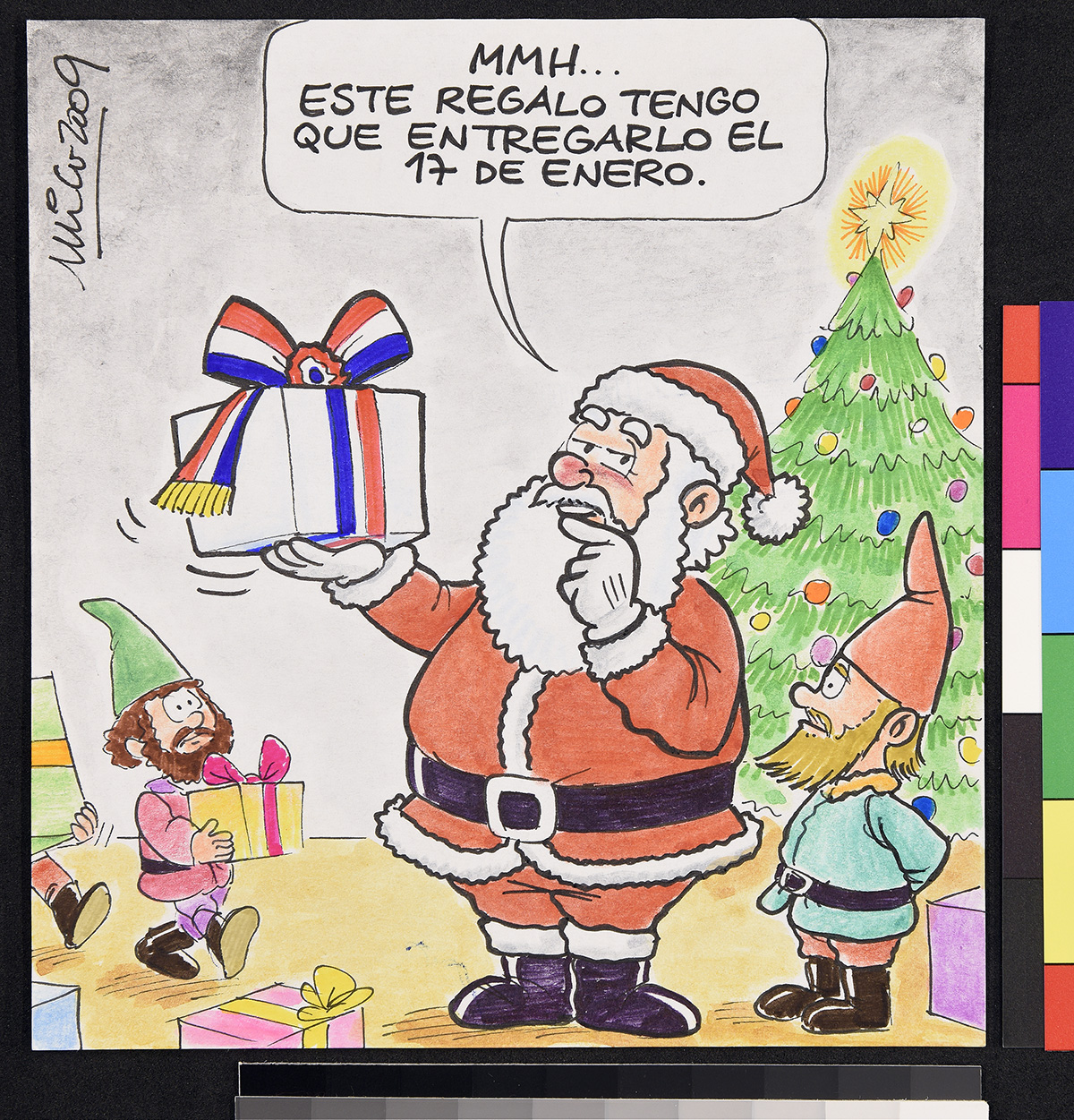Dibujo del viejito pascuero con un regalo envuelto con la banda presidencial