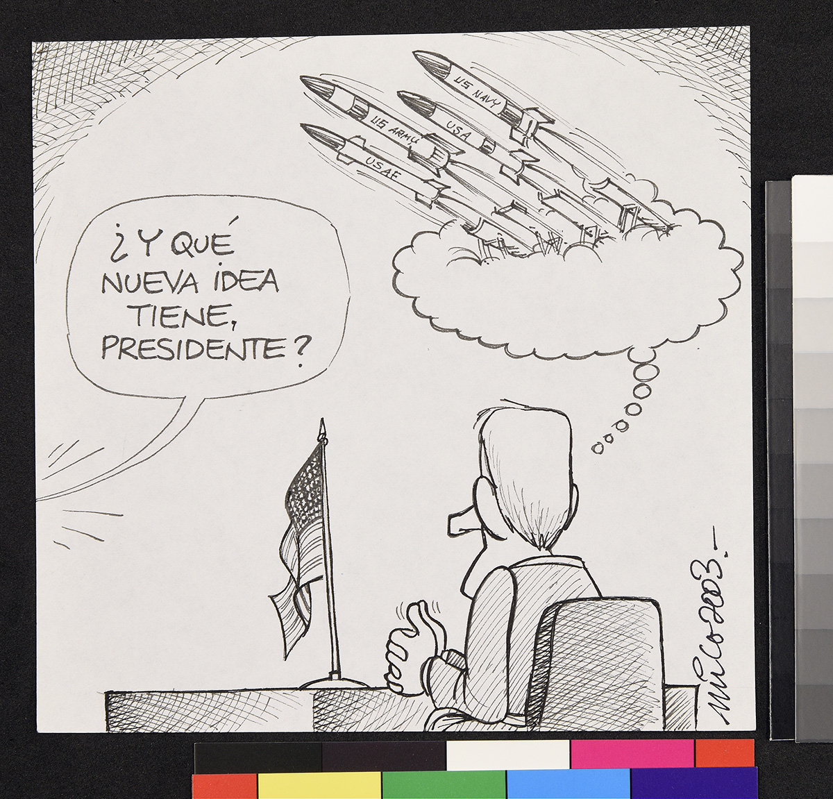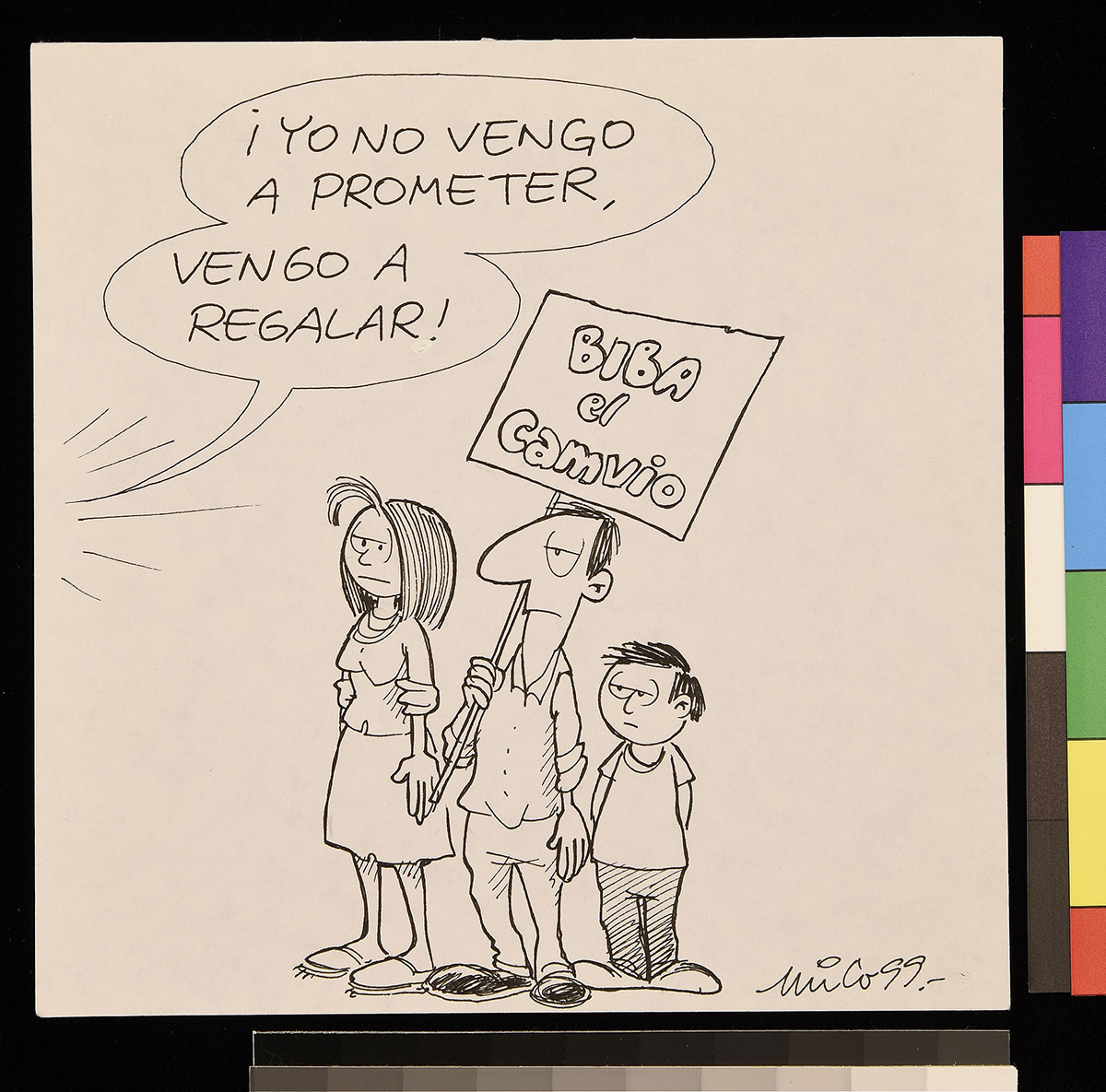 Dibujo de un hombre que arrastra un carrito de madera, donde tiene un letrero que dice “Necesito trabajar”. Se encuentra de frente con un camión con su conductor dentro. En el techo se encuentra un letrero que dice “Necesito rebajas, descuentos, créditos.”
