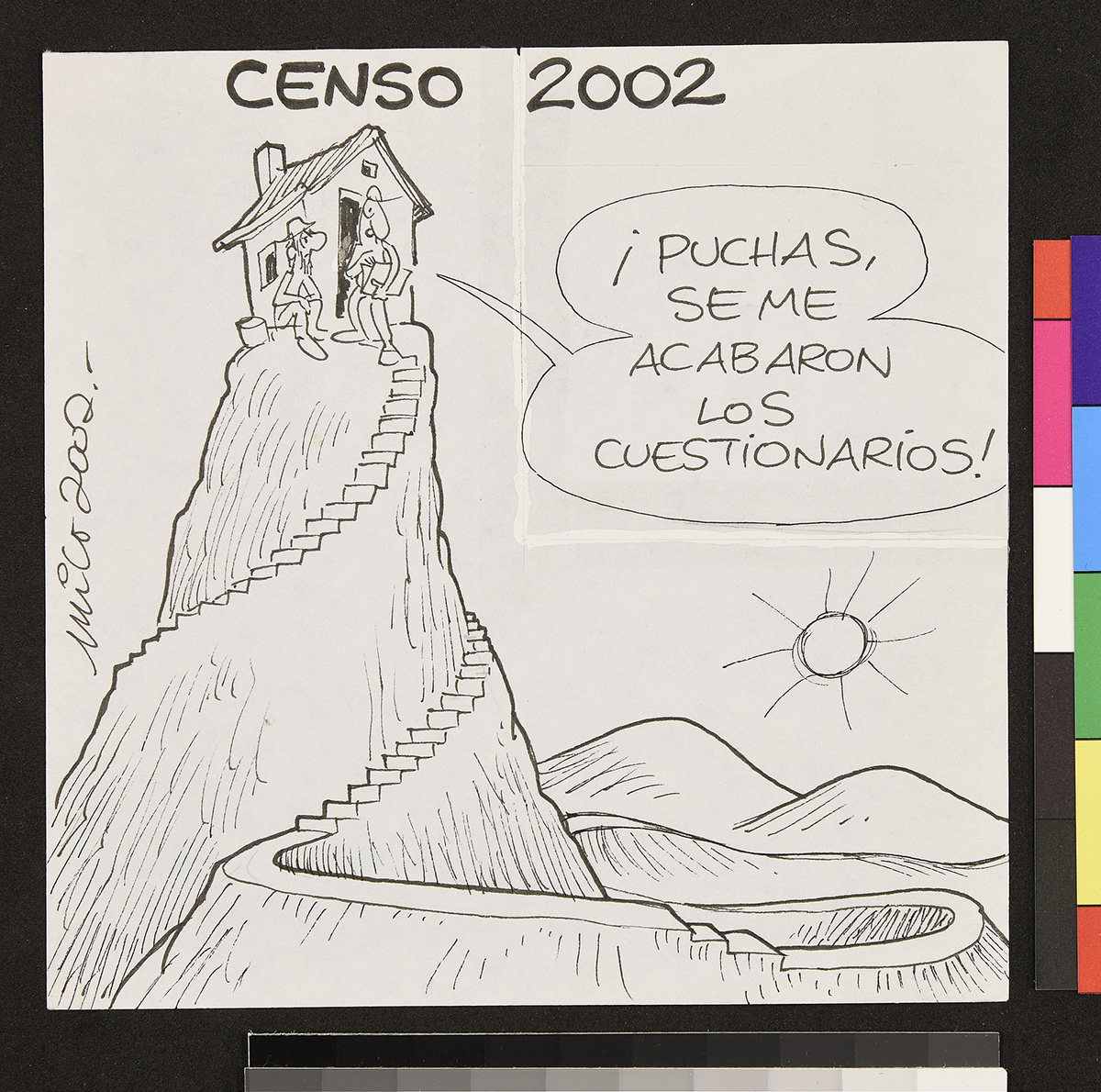 Dibujo de un Carabinero que se encuentra de pie, frente a otro hombre que le habla mientras intenta sostener una puerta para que no se abra.