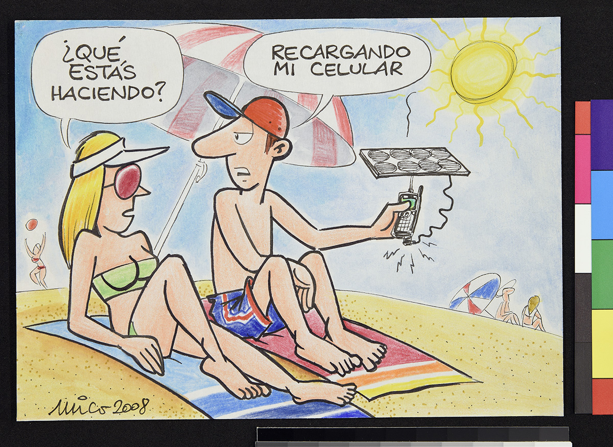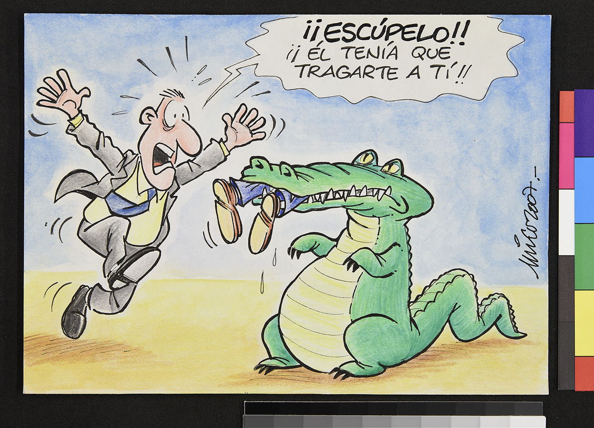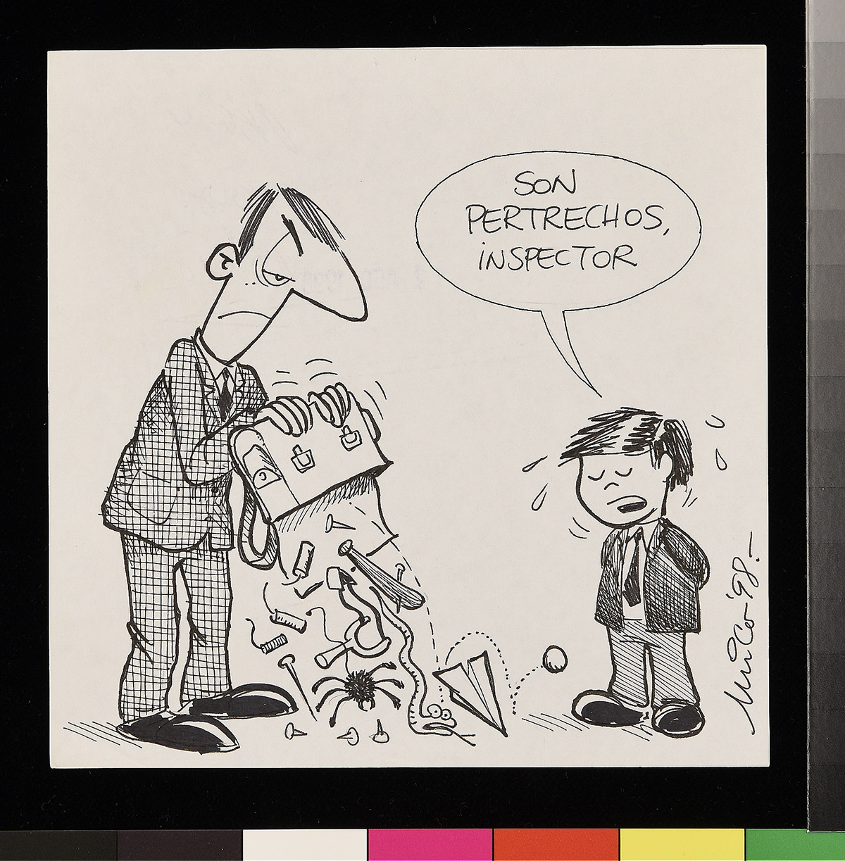 Dibujo de un hombre sentado frente a una mesa, que apuntan con su mano izquierda un panfleto político que está pegado en la muralla.