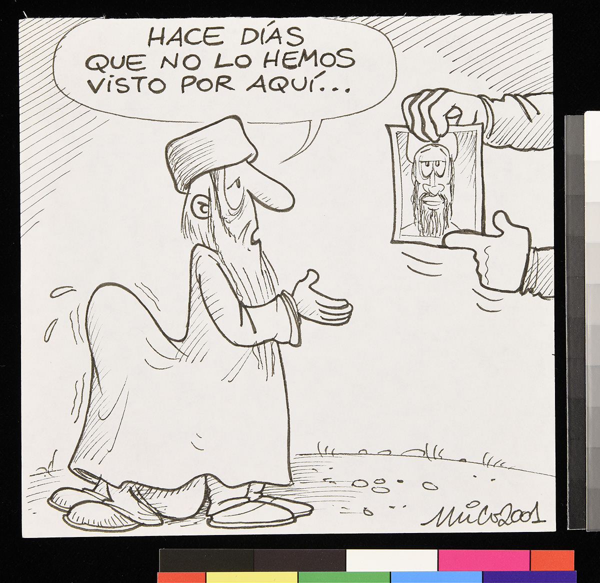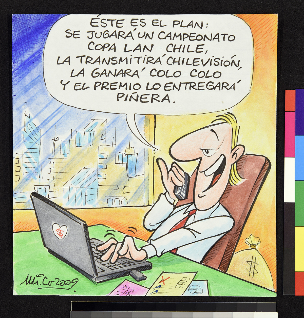 Dibujo de un hombre con traje y entre sus manos lleva un indio pícaro y al abrir golpea con un con un puño a otro hombre en la cara.