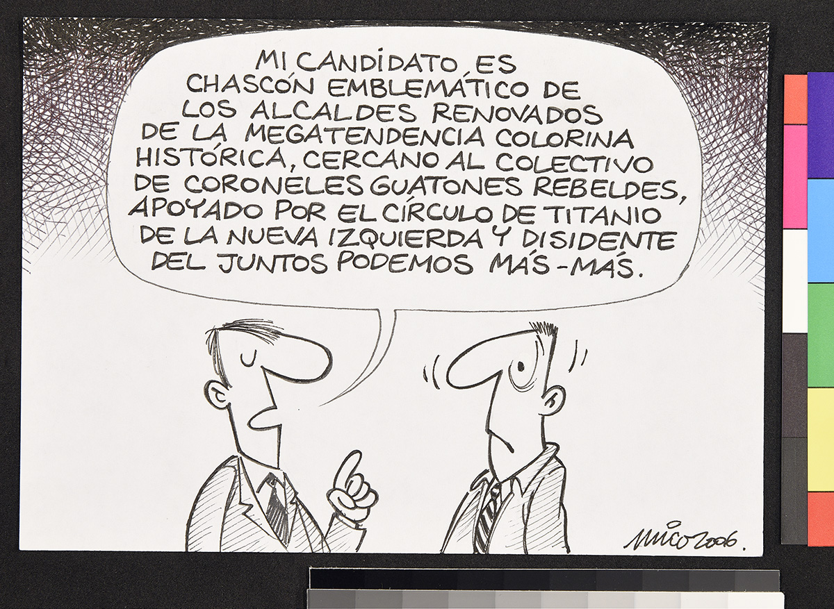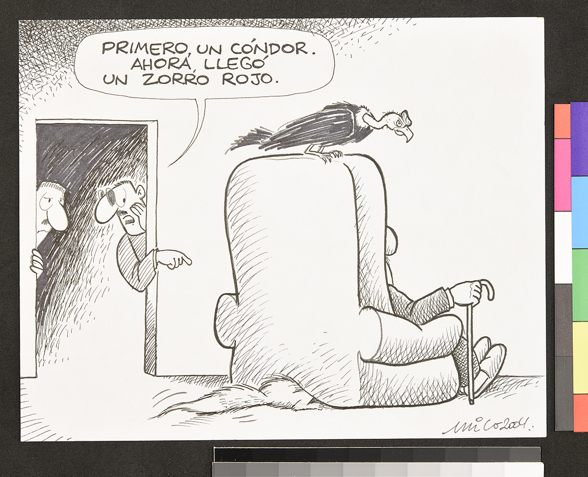 Dibujo de dos hombres que intentan transformar las esquinas de una gran esvástica. Otro hombre en la esquina inferior de la caricatura, un hombre modifica una esvástica dibujada en un papel que sostiene en sus manos.
