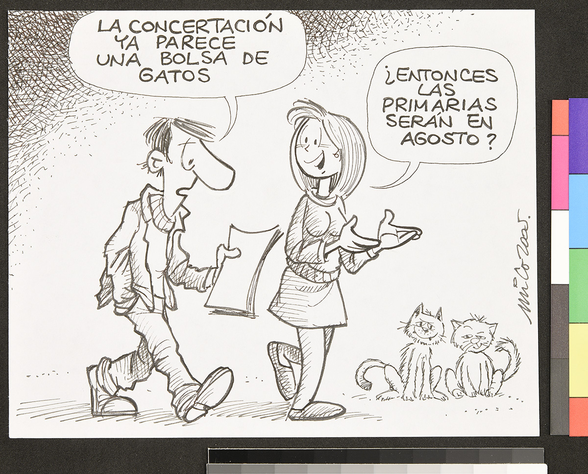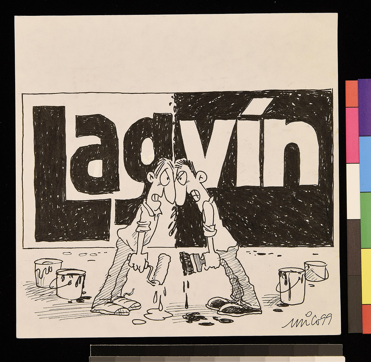 Dibujo de dos personas que están junto a una obra colgada en una muralla.