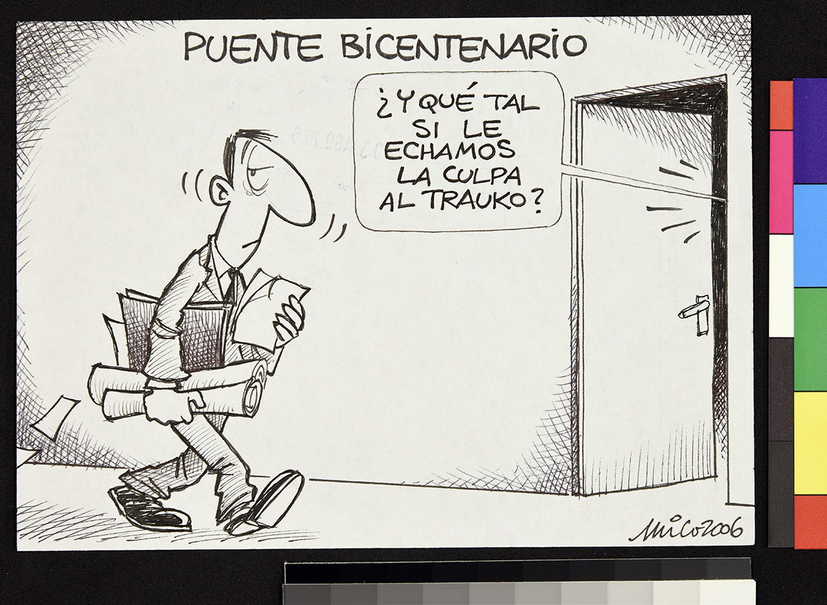 Dibujo de dos hombres sentados cada uno frente a un escritorio. El primero de los hombres está en un escritorio de donde se lee “Pago de cheques” y el otro se encuentra en un escritorio donde se lee “Pago de coimas”.
