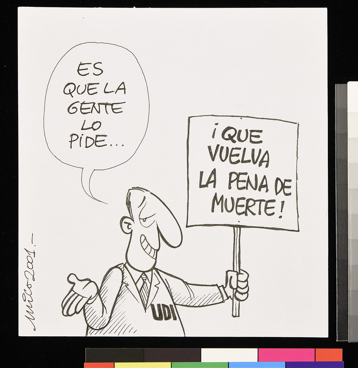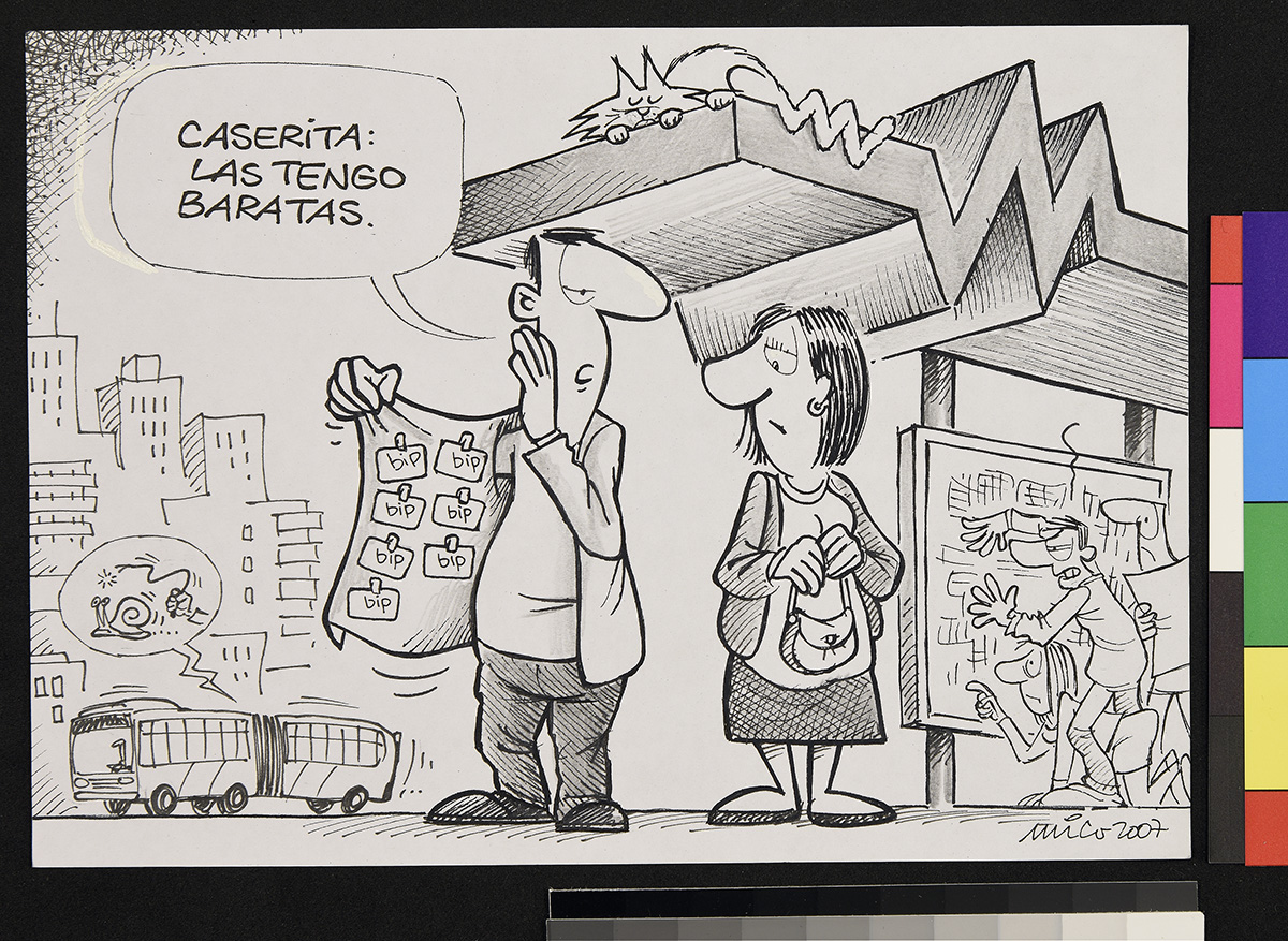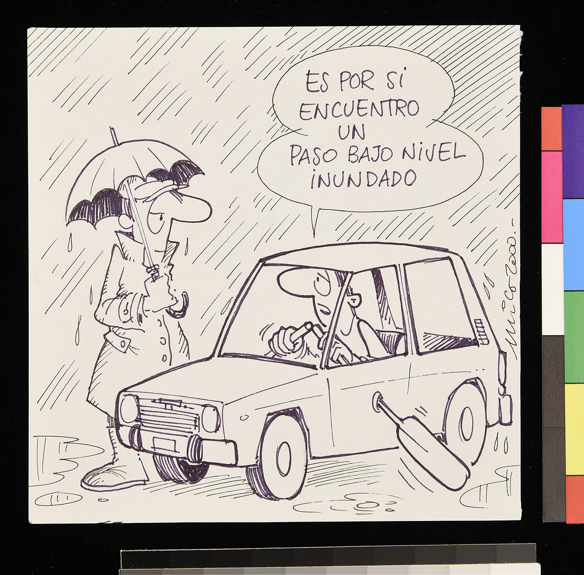 Dibujo de un hombre con un paraguas que mira a otro que está en la parte del piloto en un automóvil, mientras llueve.