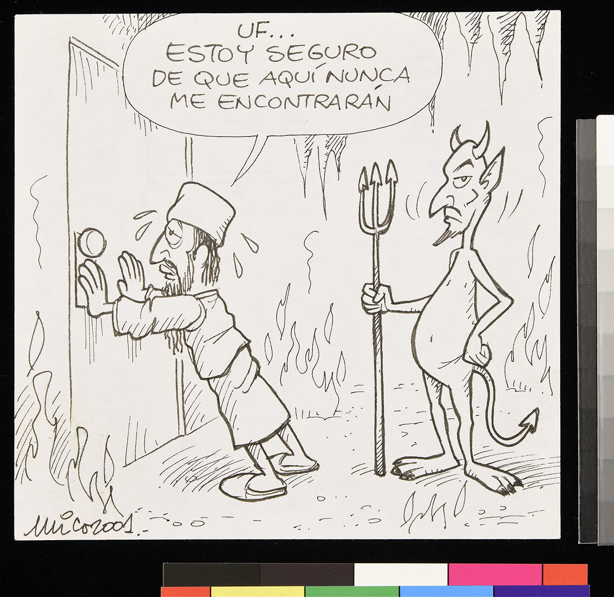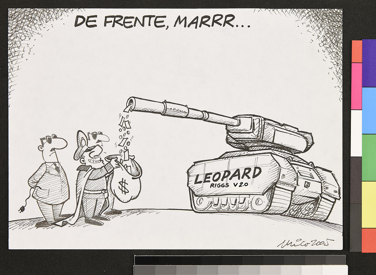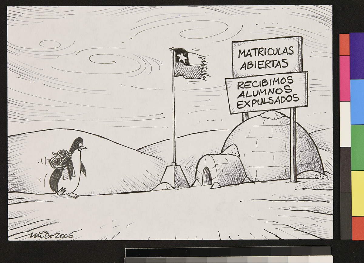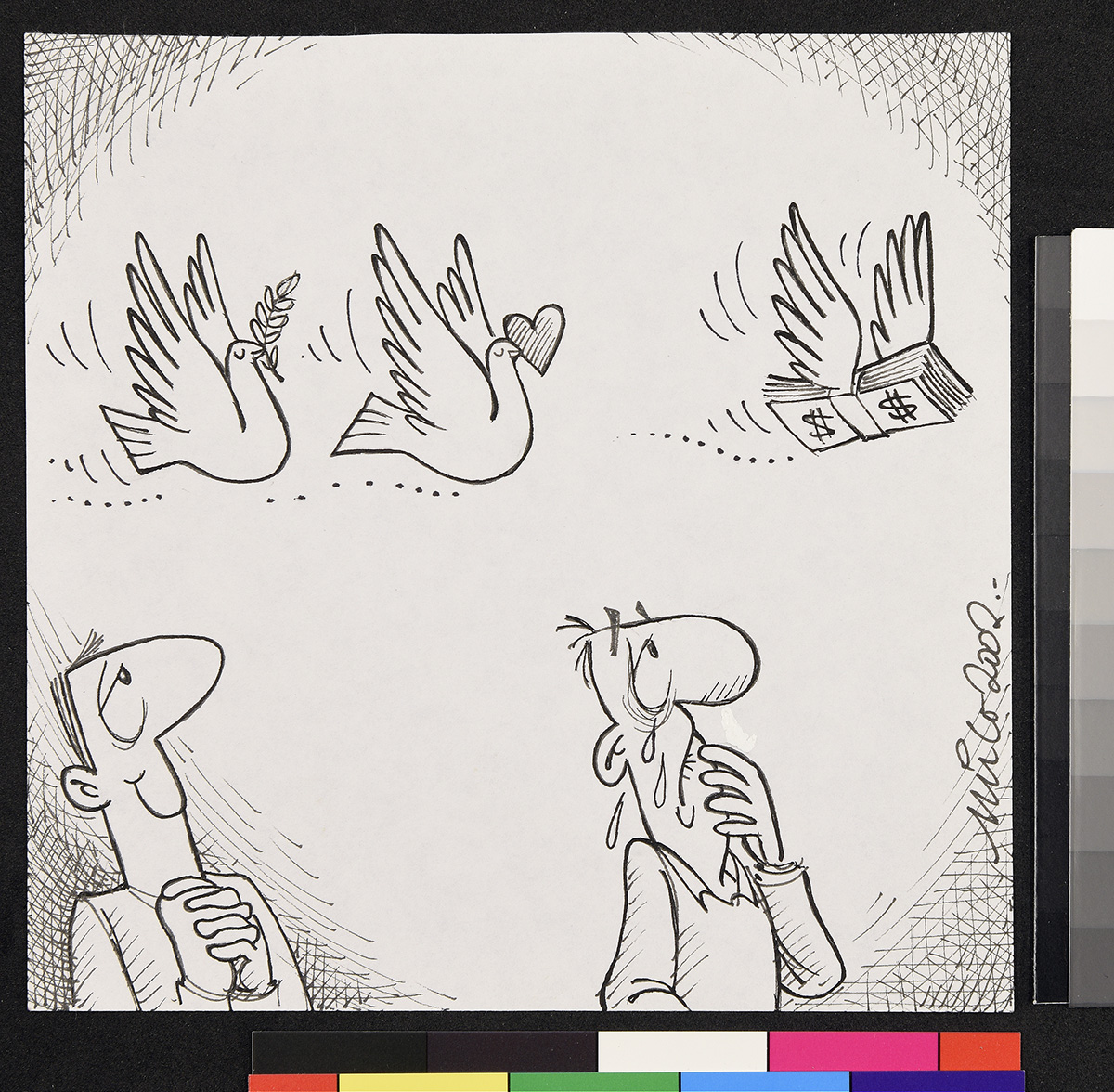 Dibujo de un hombre de pie, que sostiene un papel en sus manos que es atravesada por un cohete y una bala lanzada de direcciones opuestas. El hombre ocupa un sombrero que dice “ONU”.
