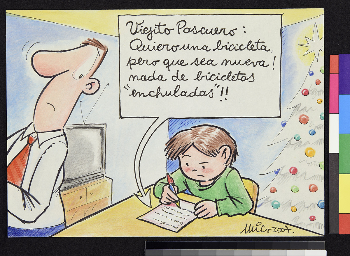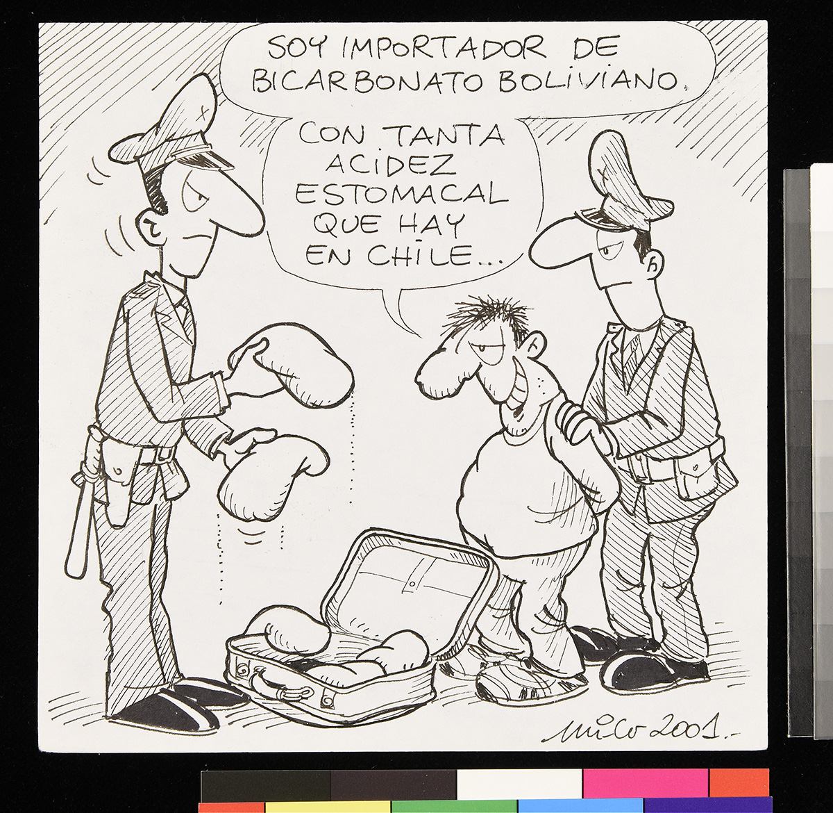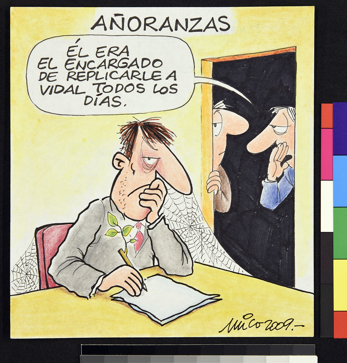 Dibujo de un hombre de pie, que sostiene un papel en sus manos que es atravesada por un cohete y una bala lanzada de direcciones opuestas. El hombre ocupa un sombrero que dice “ONU”.