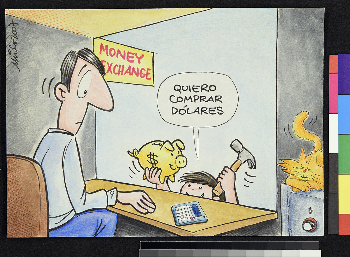 Dibujo de un hombre que está apoyando su espalda en un árbol, mientras esta sentado en el cesped. A su lado se encuentra una pancarta de propaganda política y frente a él un hombre de pie con sus manos en la cadera.
