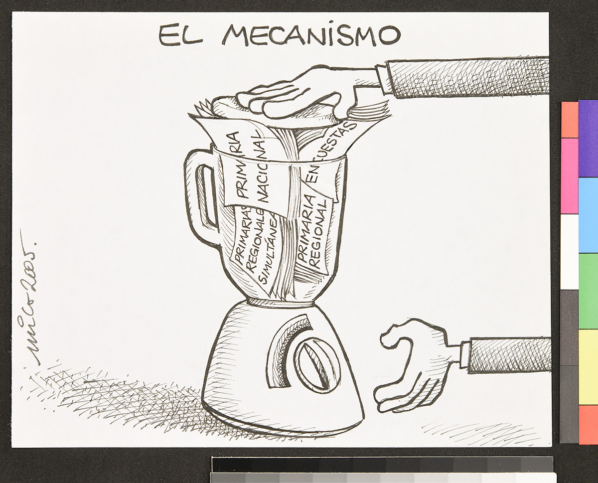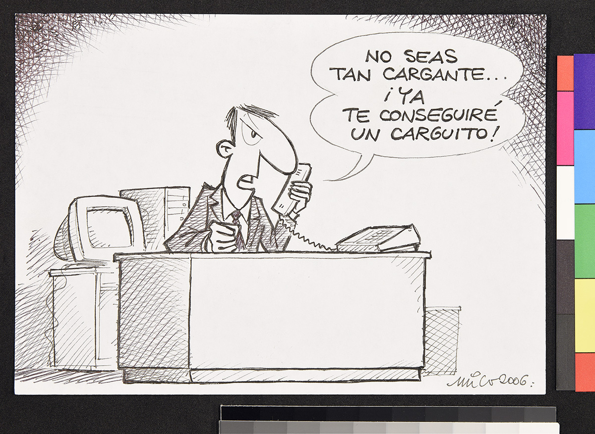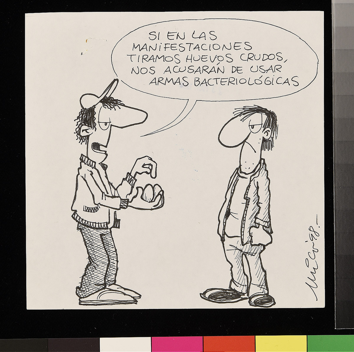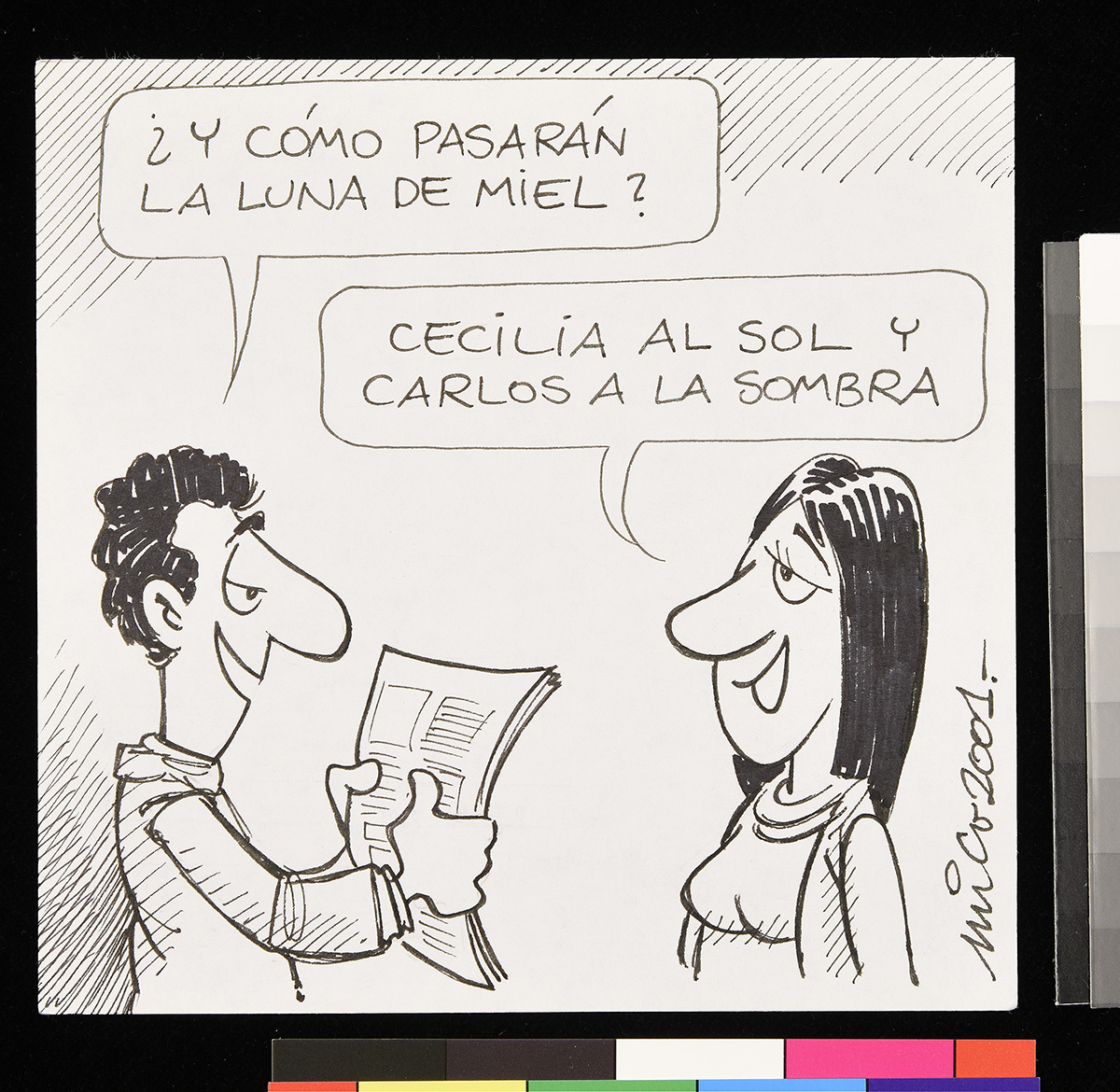 Dibujo de un hombre con casco de seguridad con linterna y lentes oscuros, que trata de cubrir su rostro con sus manos de varias cámaras de televisión que lo rodean.