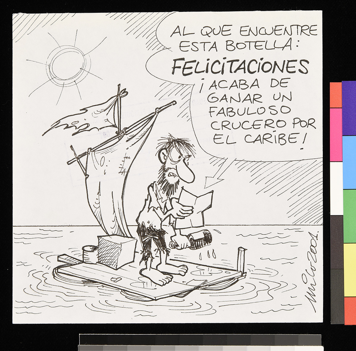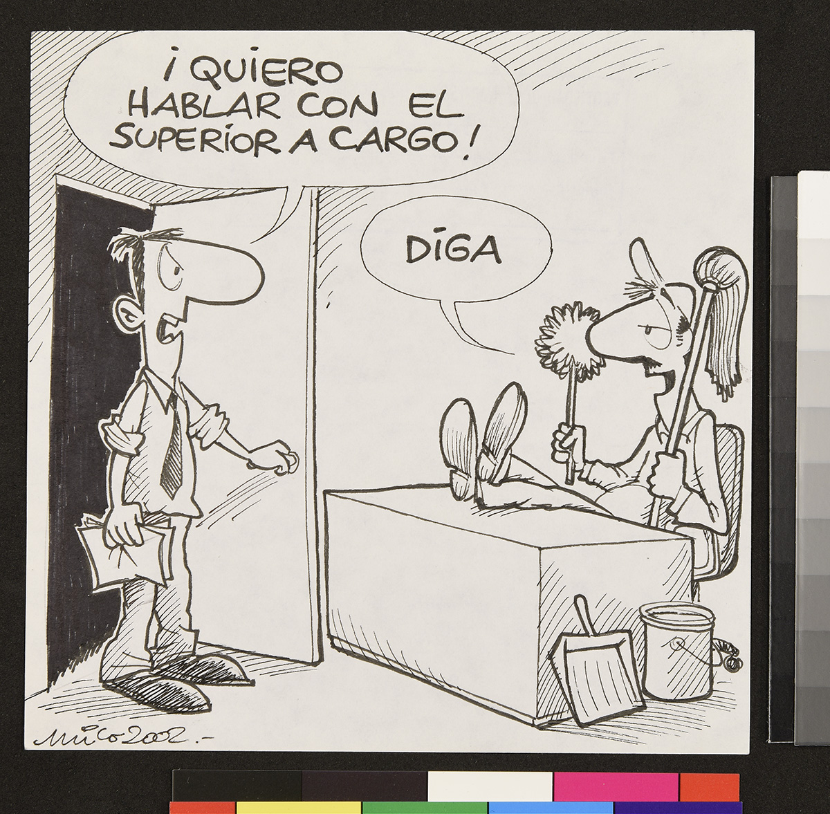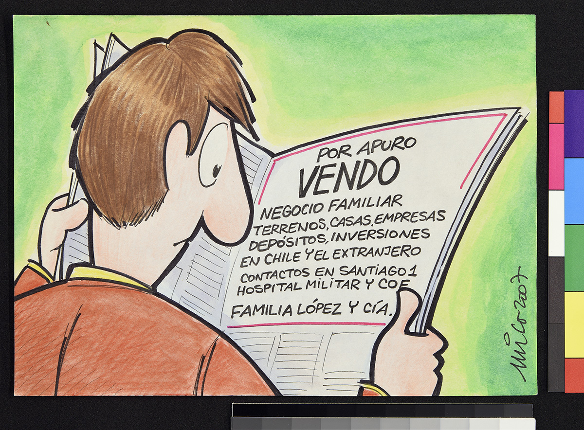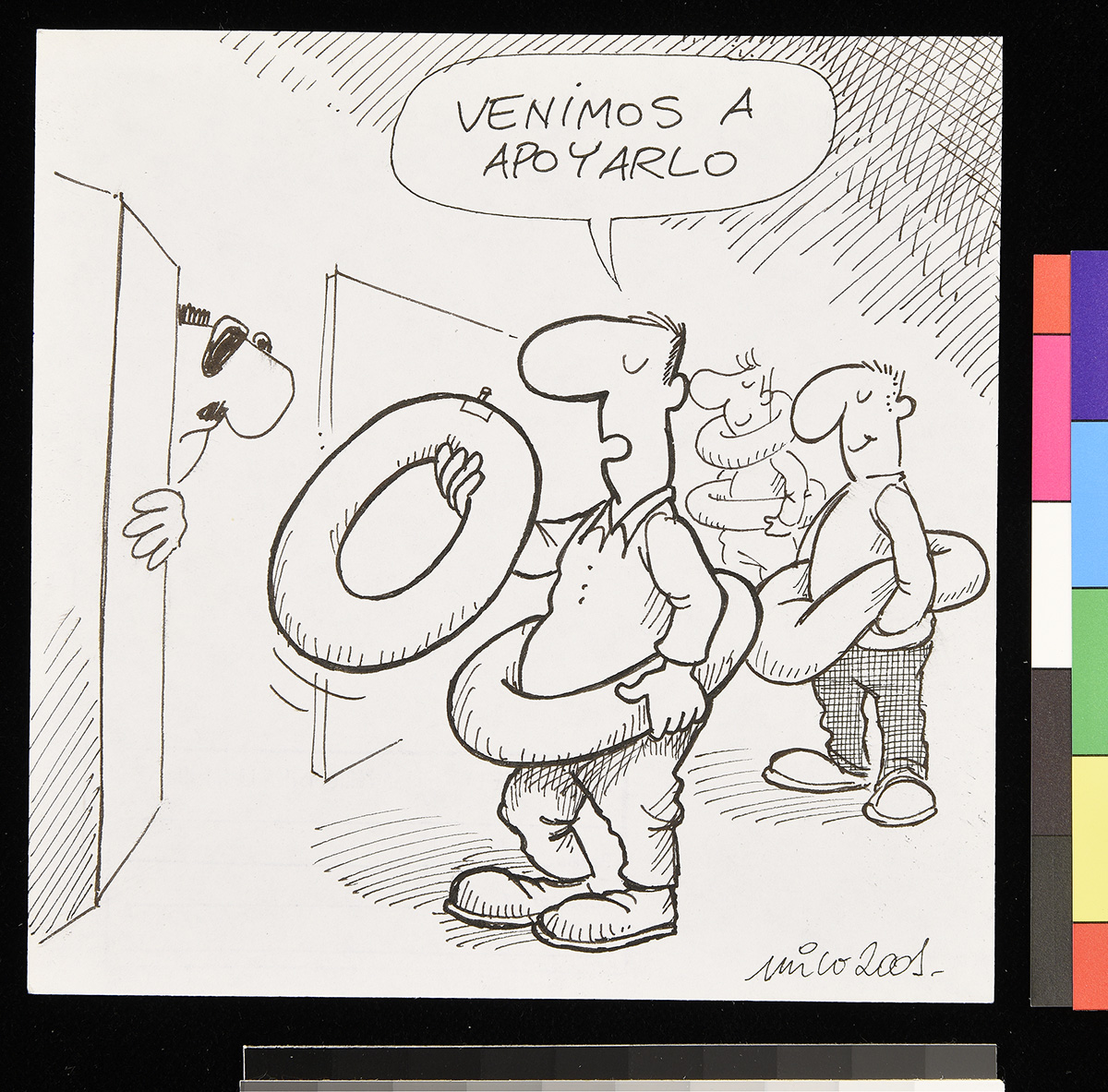 Dibujo de un hombre de lentes, que tiene en sus manos dos grandes pastillas. Se encuentra sentado frente a un escritorio, donde están encimas un mazo de madera y un libro. En el frente se lee “Lex”.