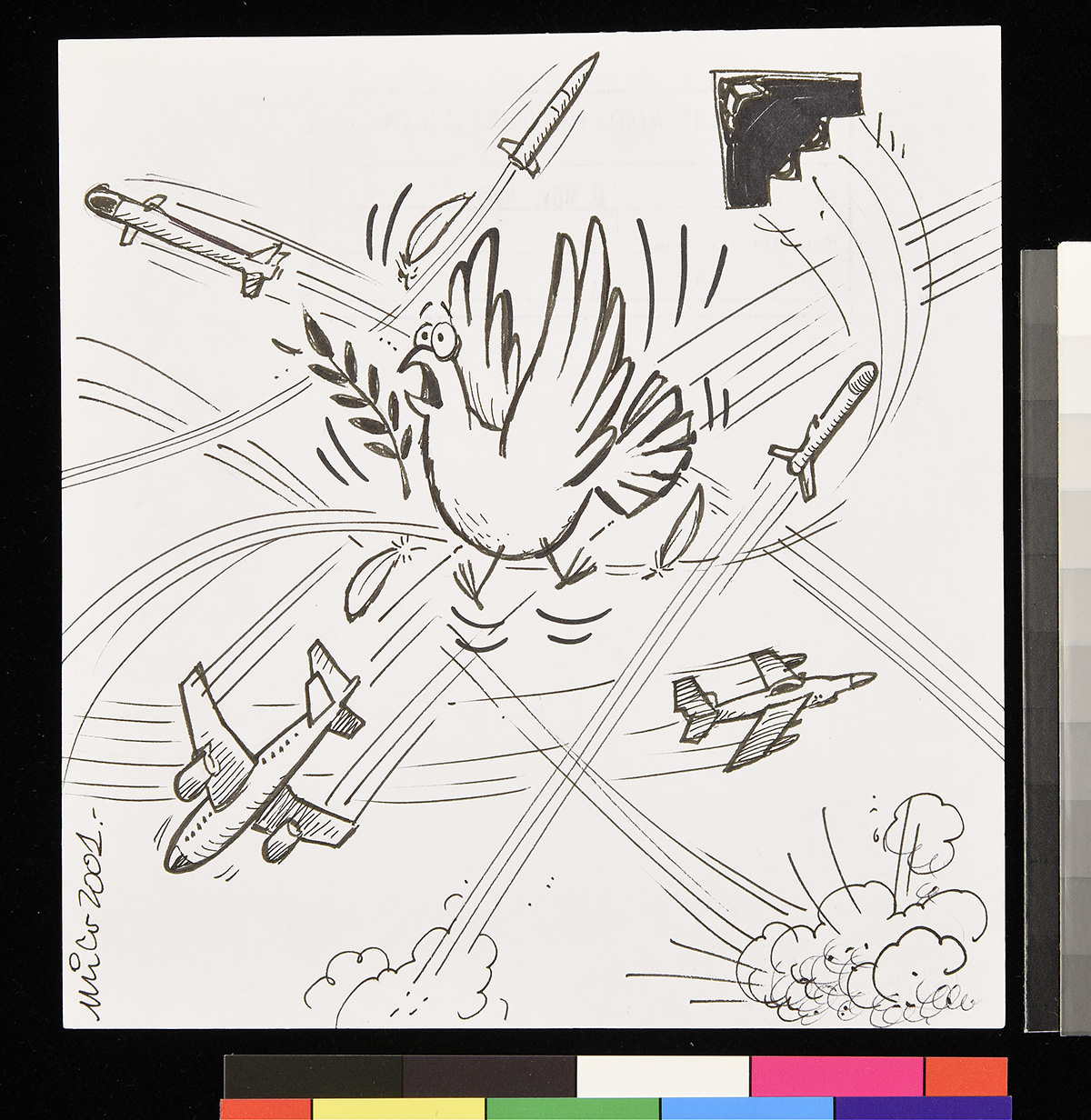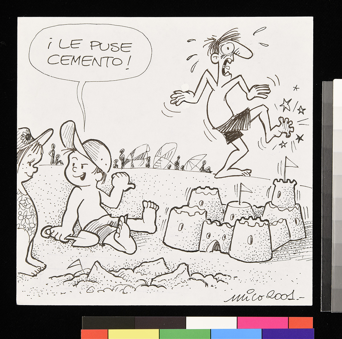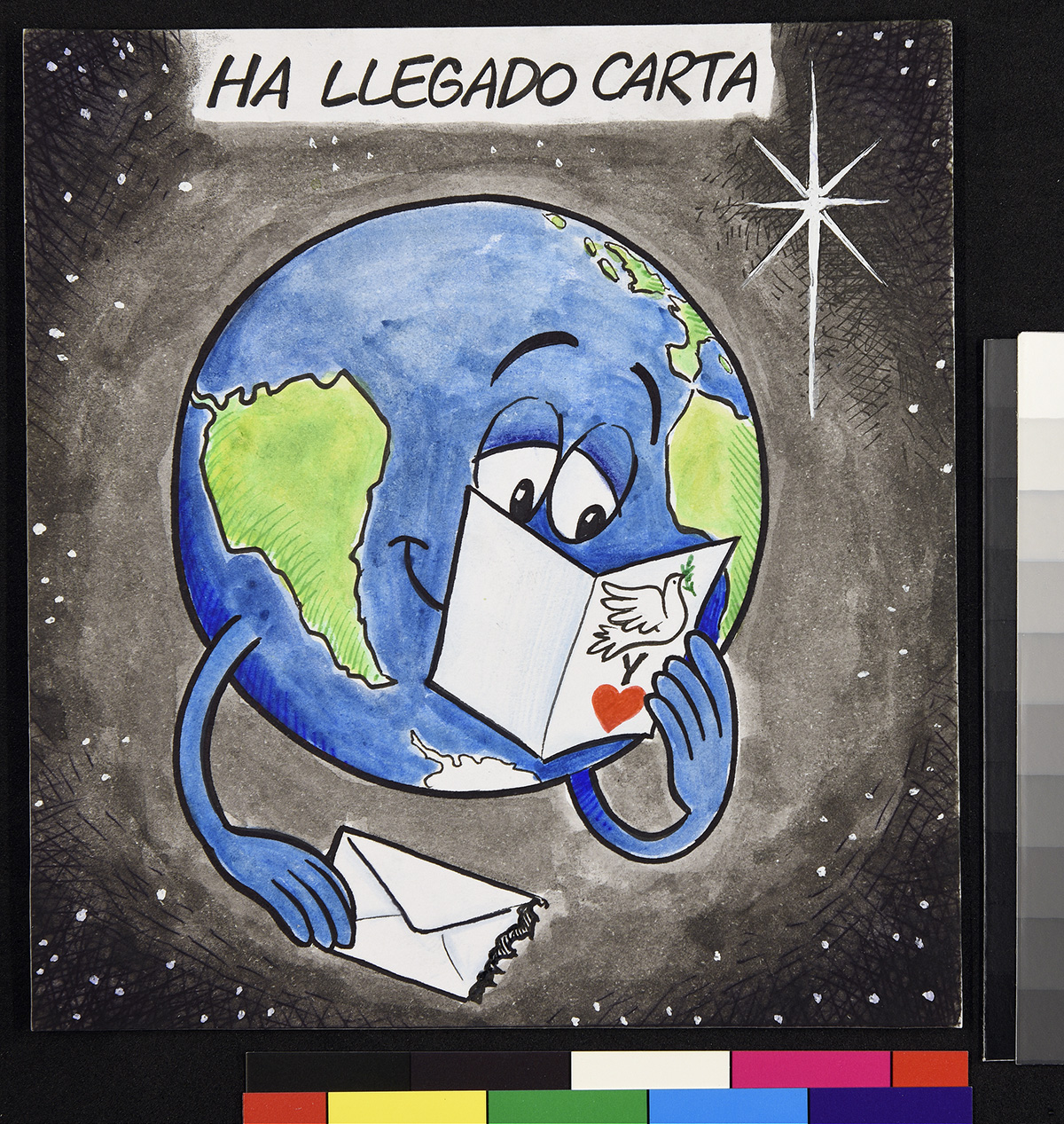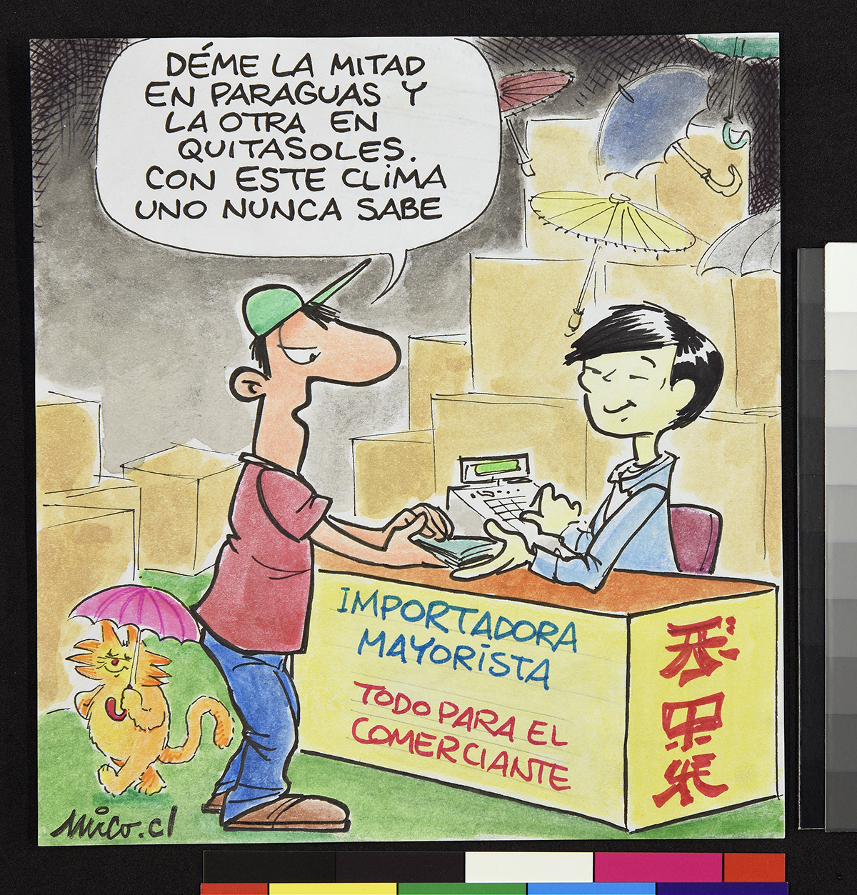 Dibujo de un hombre de lentes, que tiene en sus manos dos grandes pastillas. Se encuentra sentado frente a un escritorio, donde están encimas un mazo de madera y un libro. En el frente se lee “Lex”.