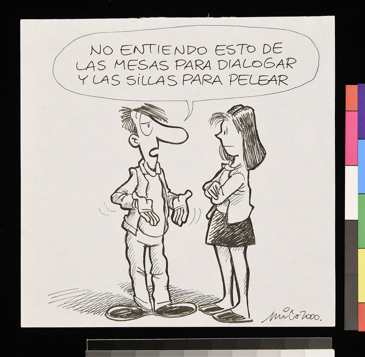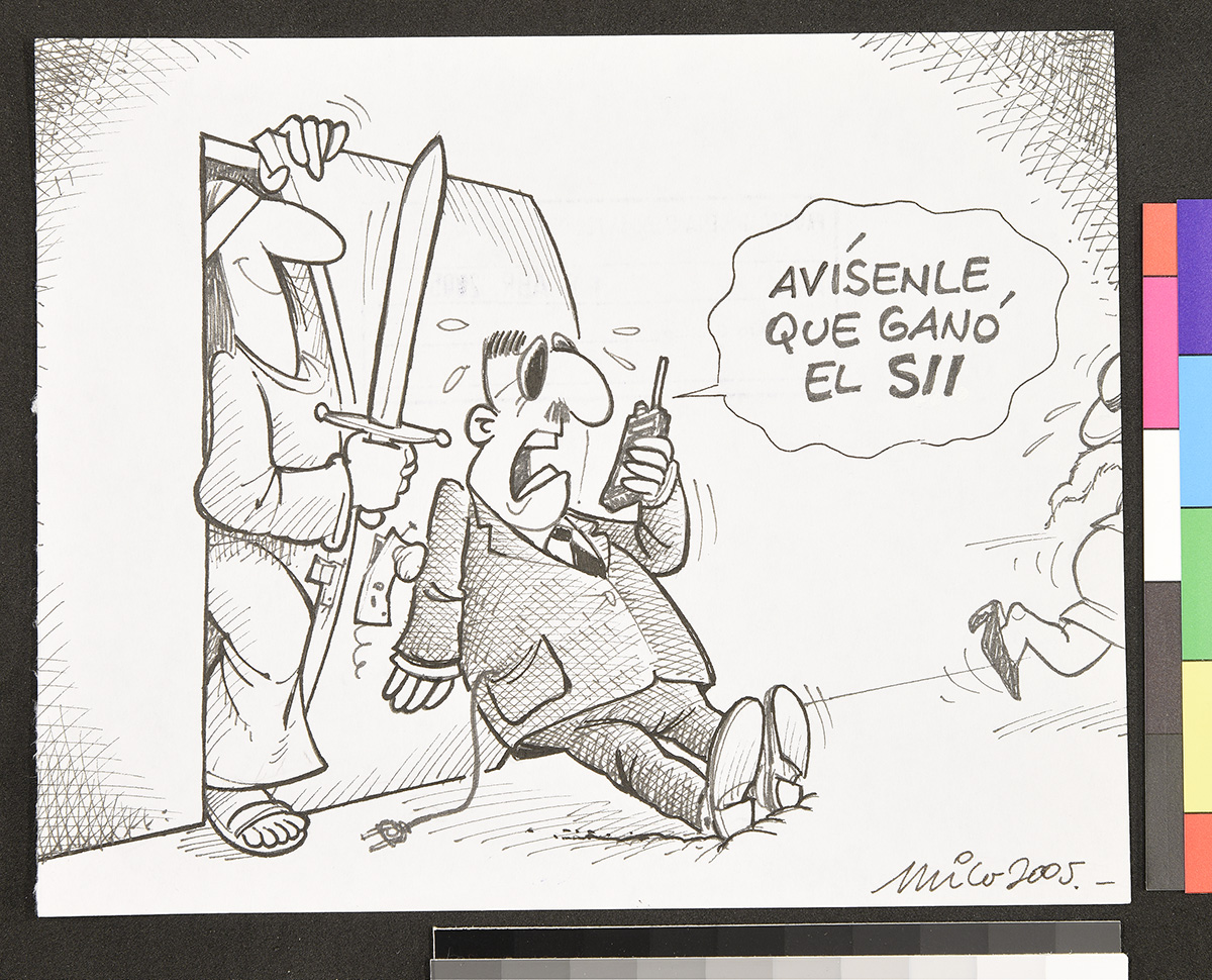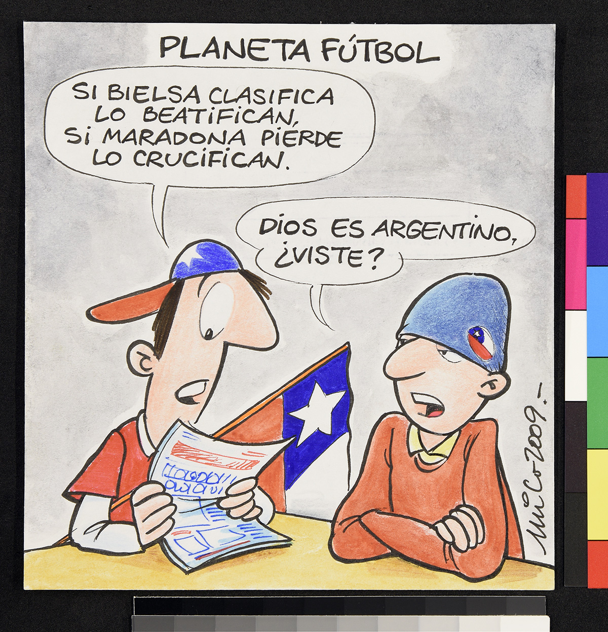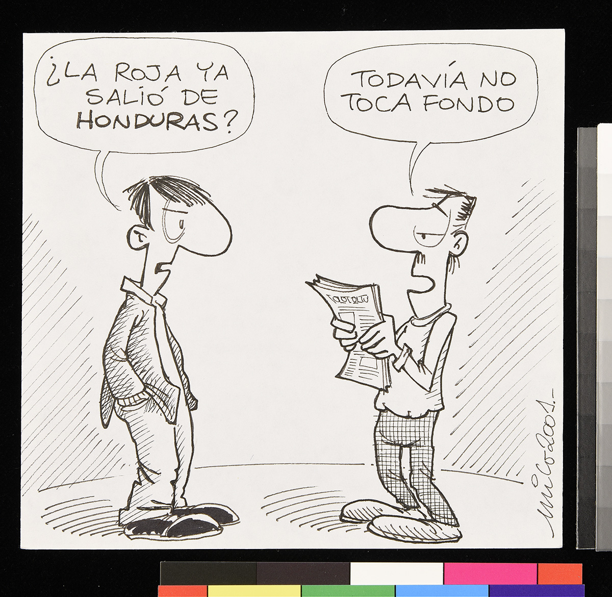 Dibujo de un hombre sobre un flotador en el mar, junto a otros flotadores que contienen comida y una televisión que trasmite un partido de fútbol. Una mujer detras de el hombre lo mira de forma disgustada.
