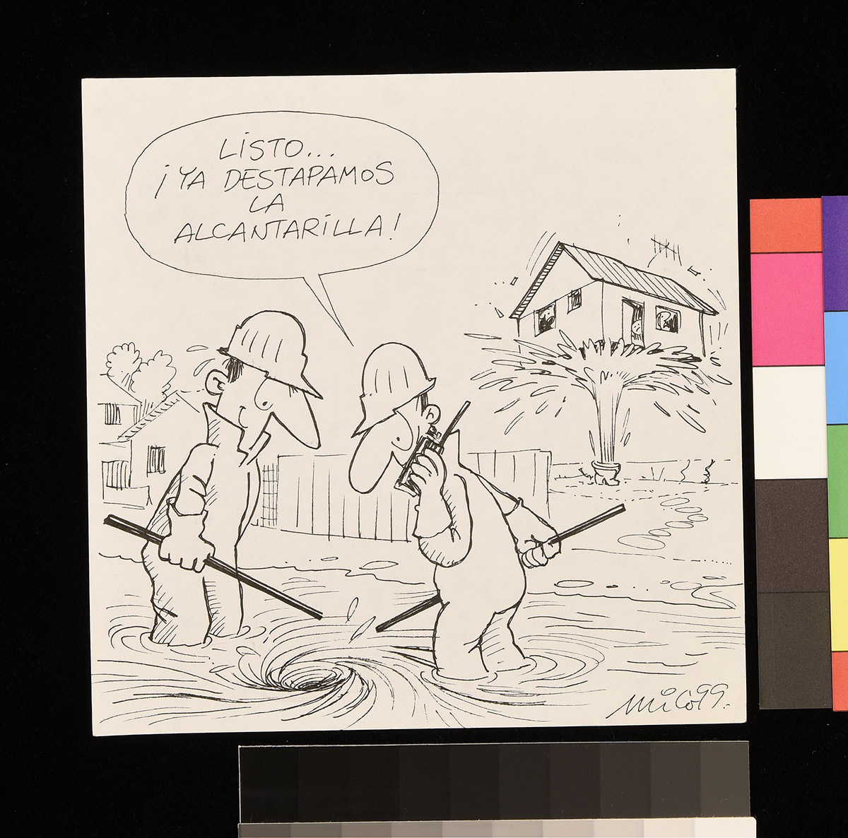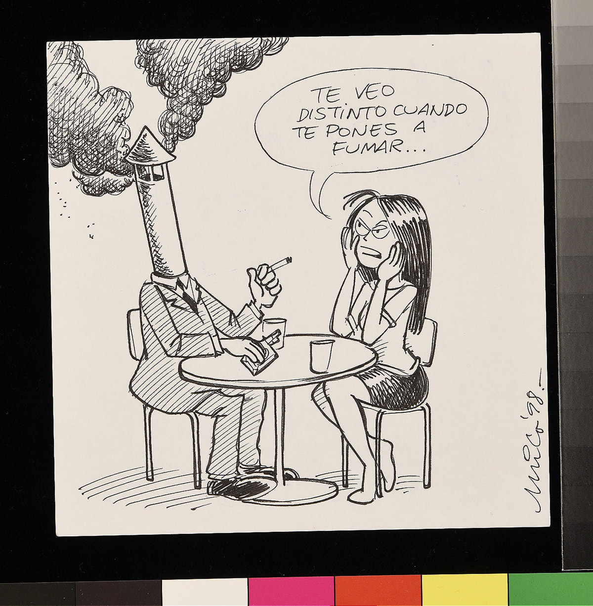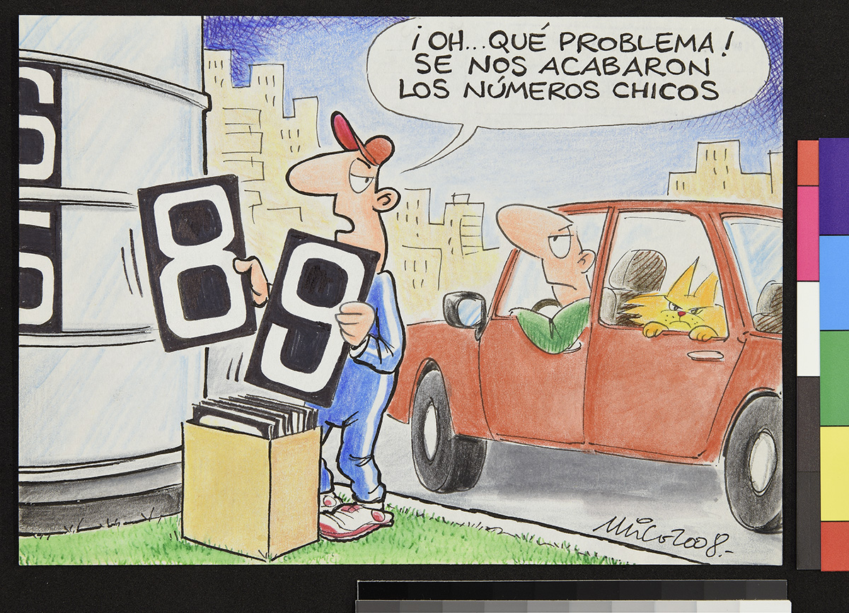 Dibujo de un hombre sobre un flotador en el mar, junto a otros flotadores que contienen comida y una televisión que trasmite un partido de fútbol. Una mujer detras de el hombre lo mira de forma disgustada.