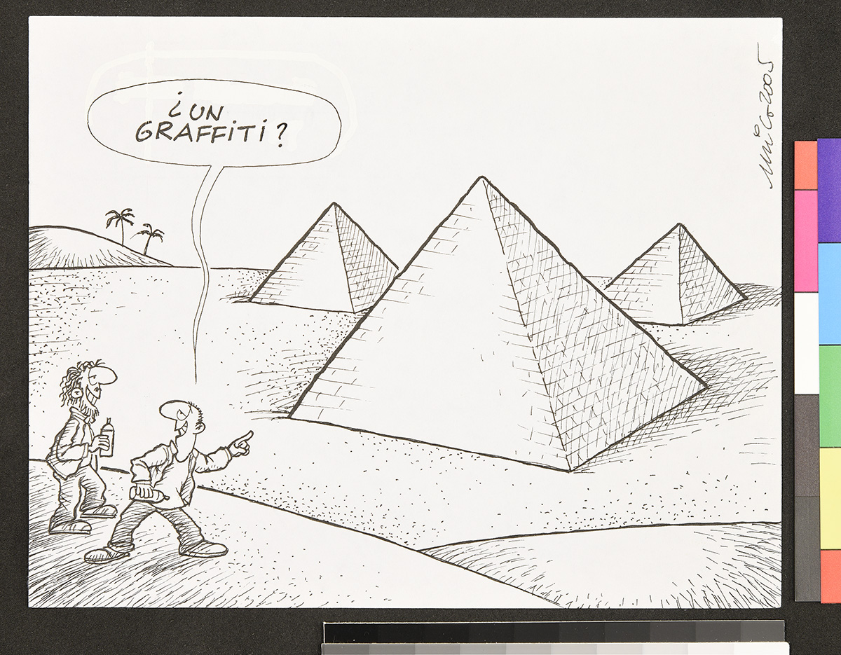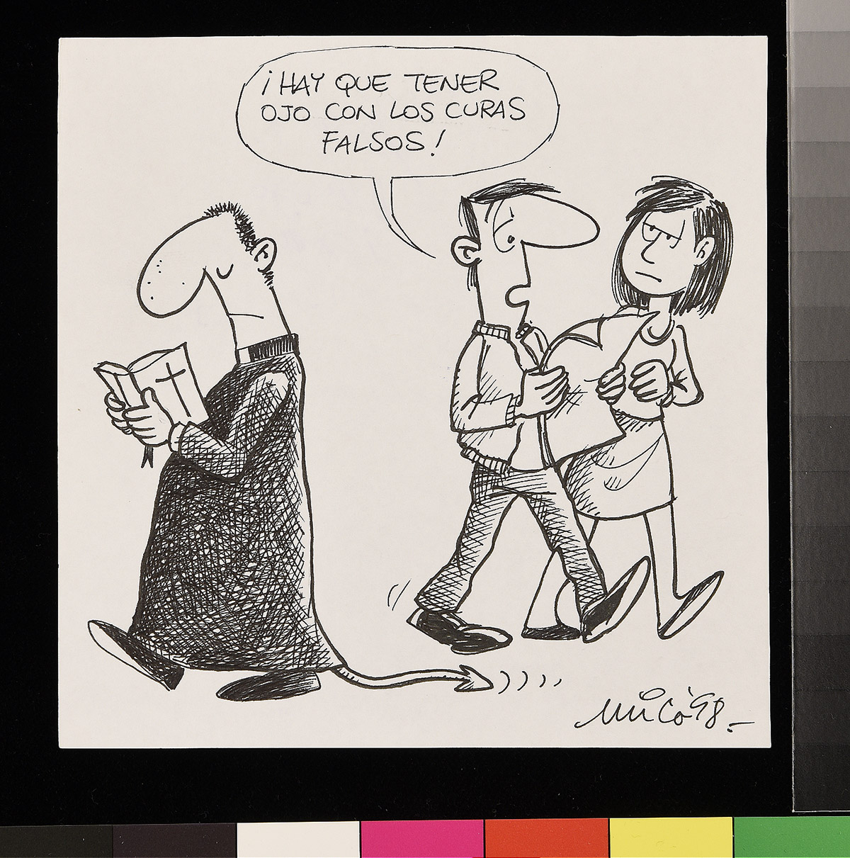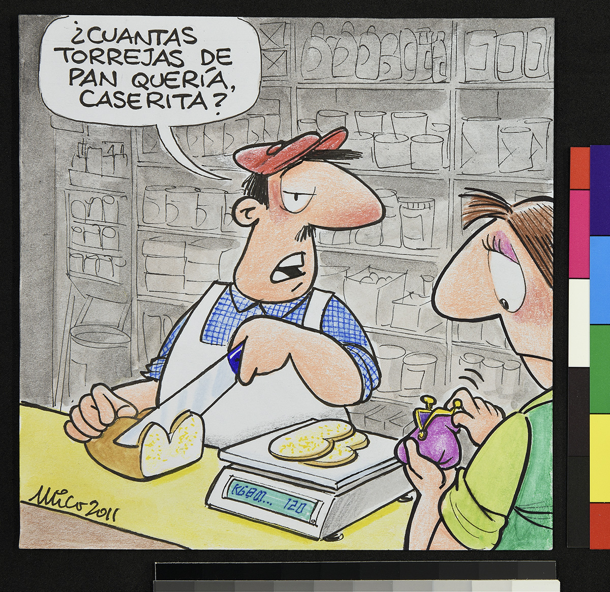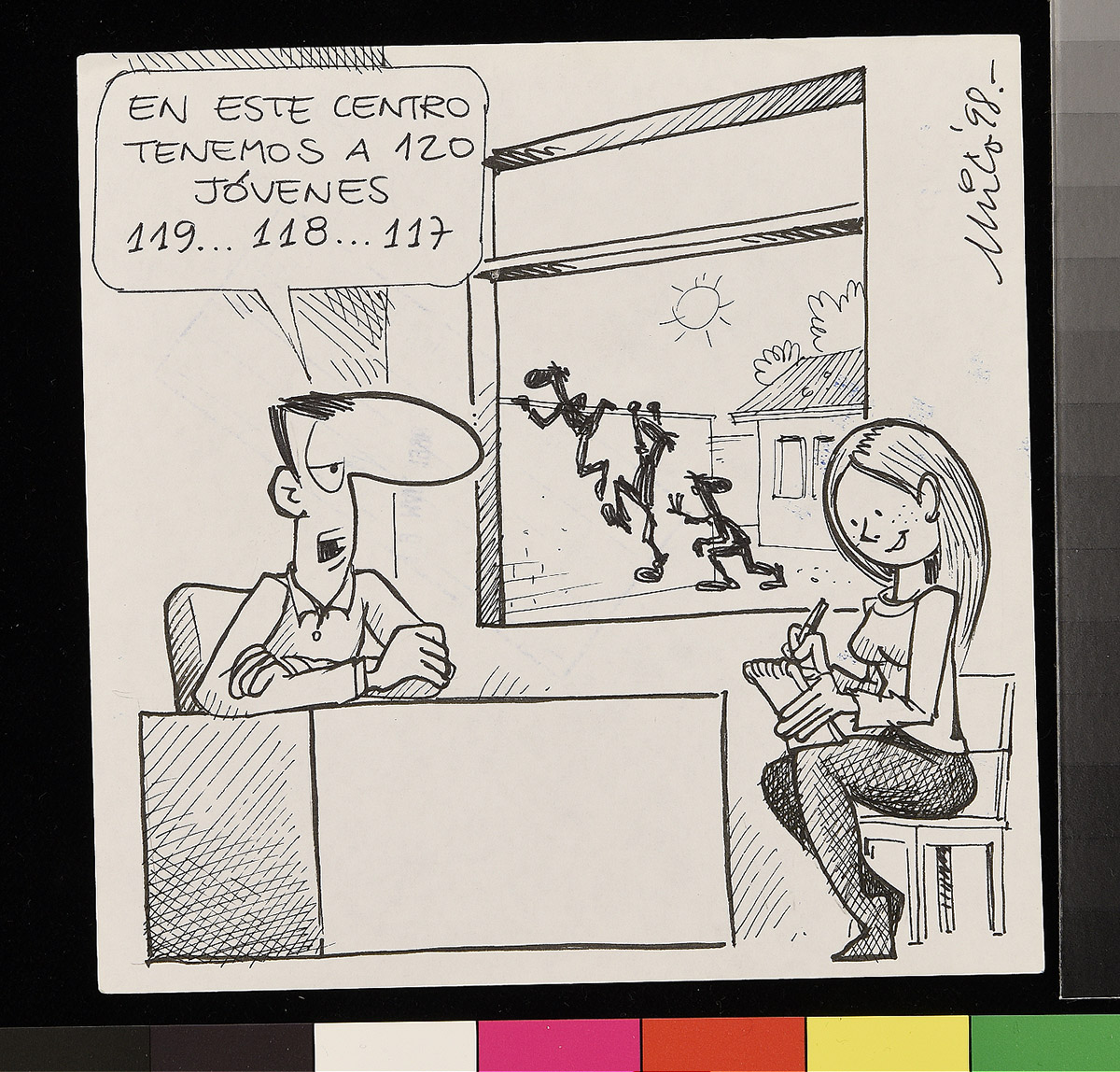 Dibujo de un hombre sobre un flotador en el mar, junto a otros flotadores que contienen comida y una televisión que trasmite un partido de fútbol. Una mujer detras de el hombre lo mira de forma disgustada.