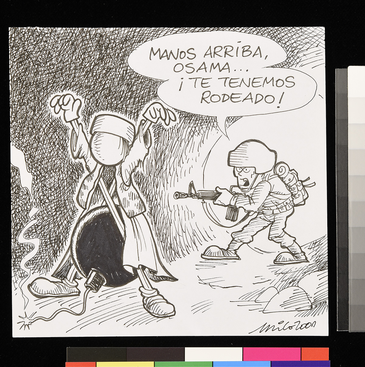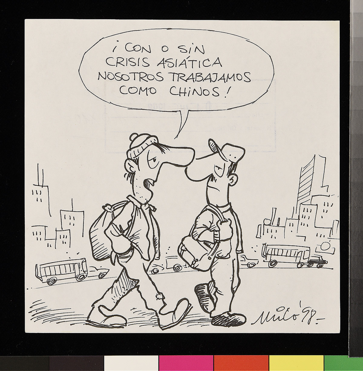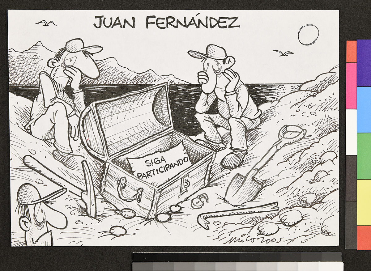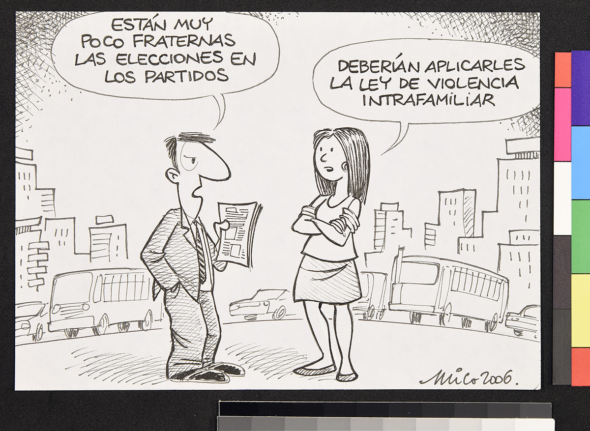 Dibujo de una mujer mayor que habla por teléfono desde una cabina secreta para votar. Al costado izquierdo de la caricatura se ven a dos mujeres que son vocales de mesa.