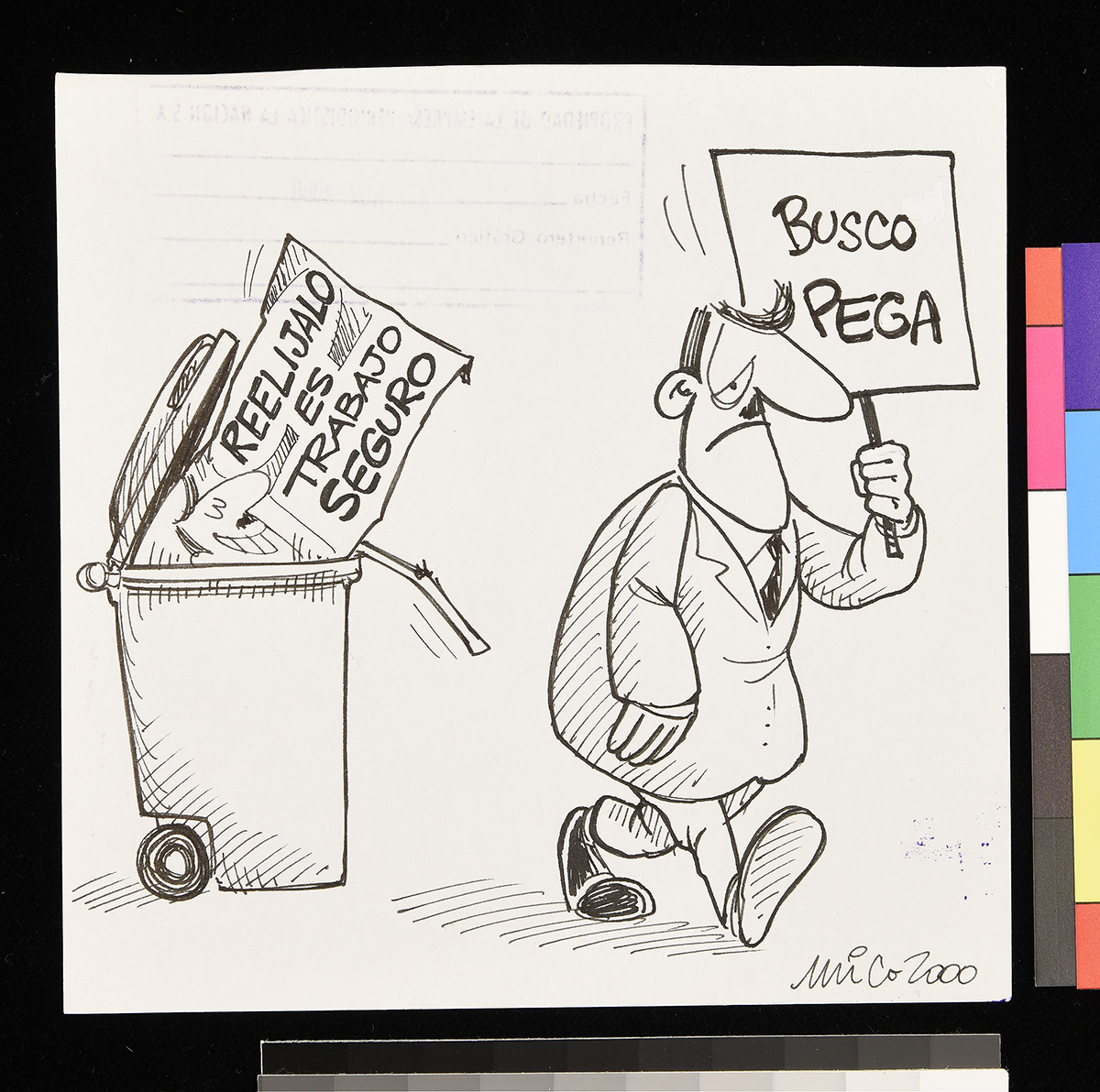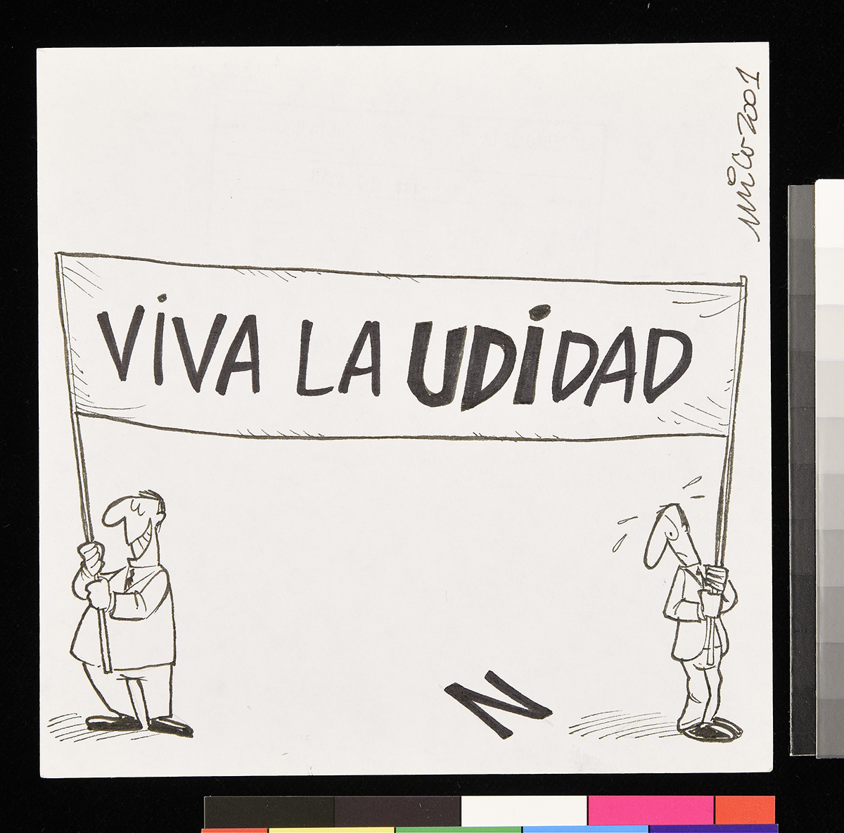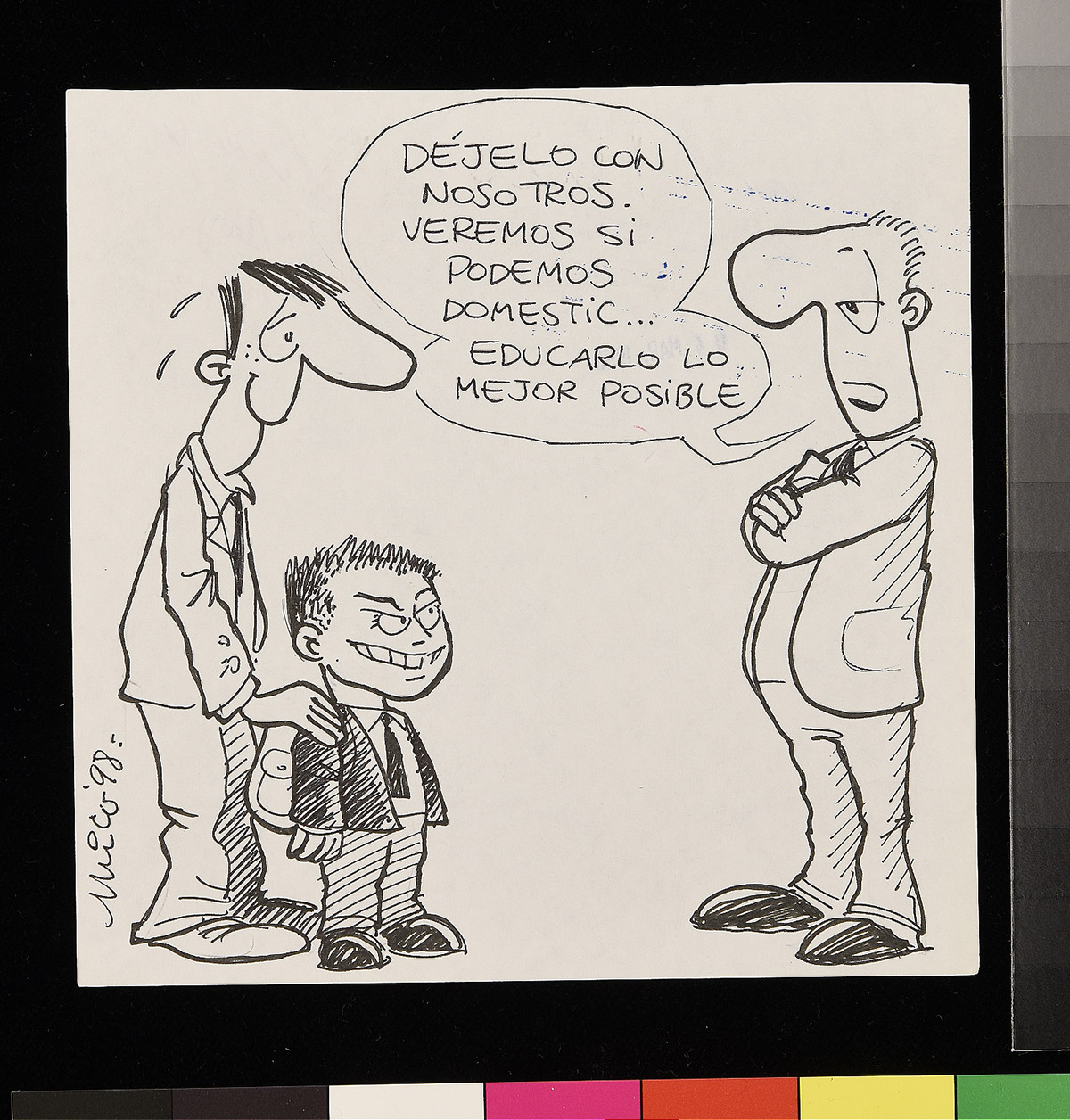 DIbujo de un hombre y una mujer conversando frente a frente. El hombre lee un periódico que sostiene con sus manos.