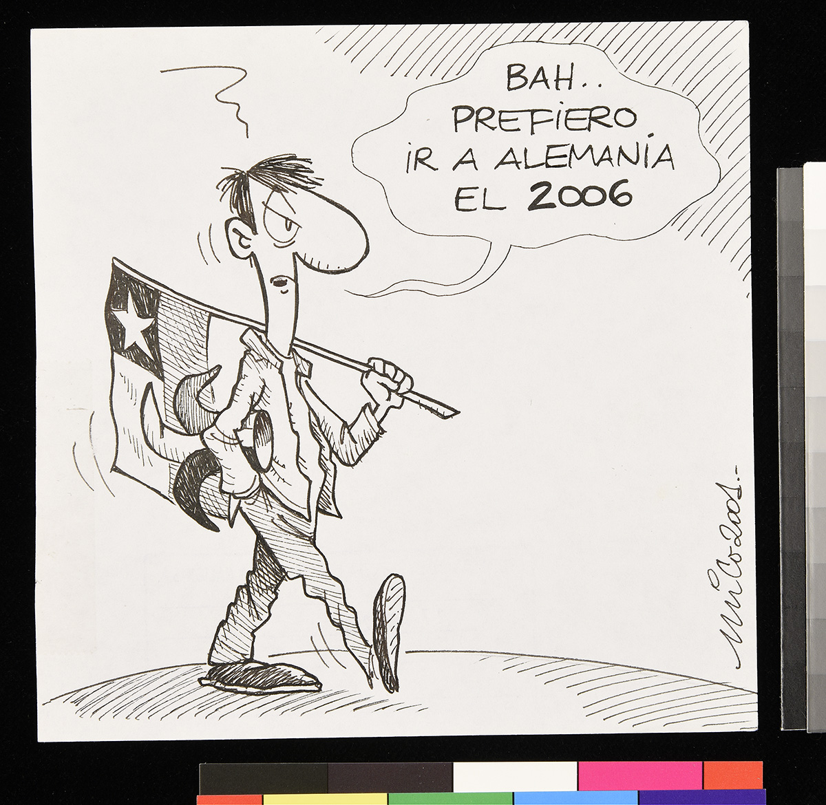 Dibujo de un hombre que sostiene en sus manos un libro y un palo encendido, mientras está de pie sobre varios tipos de bombas.