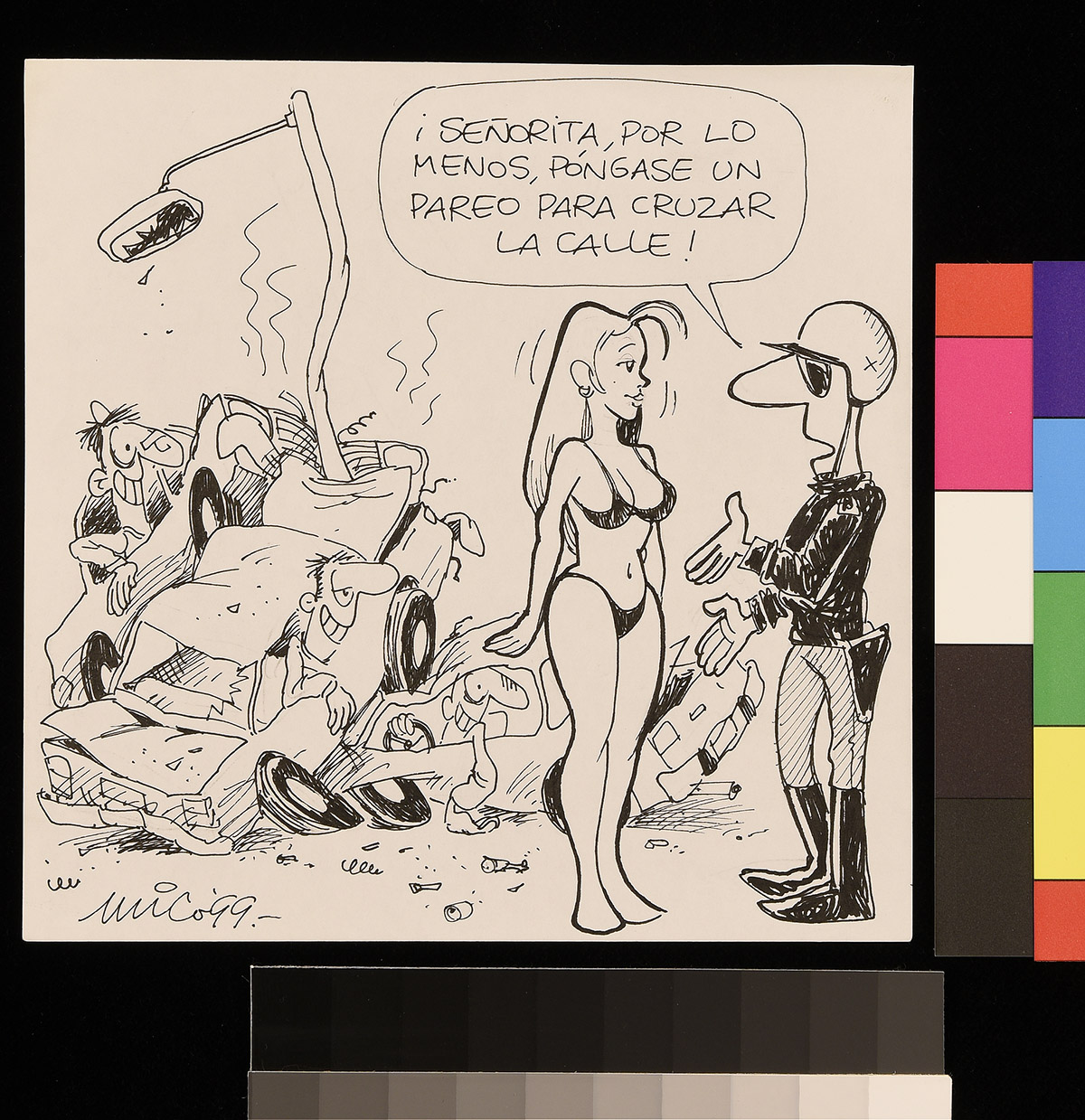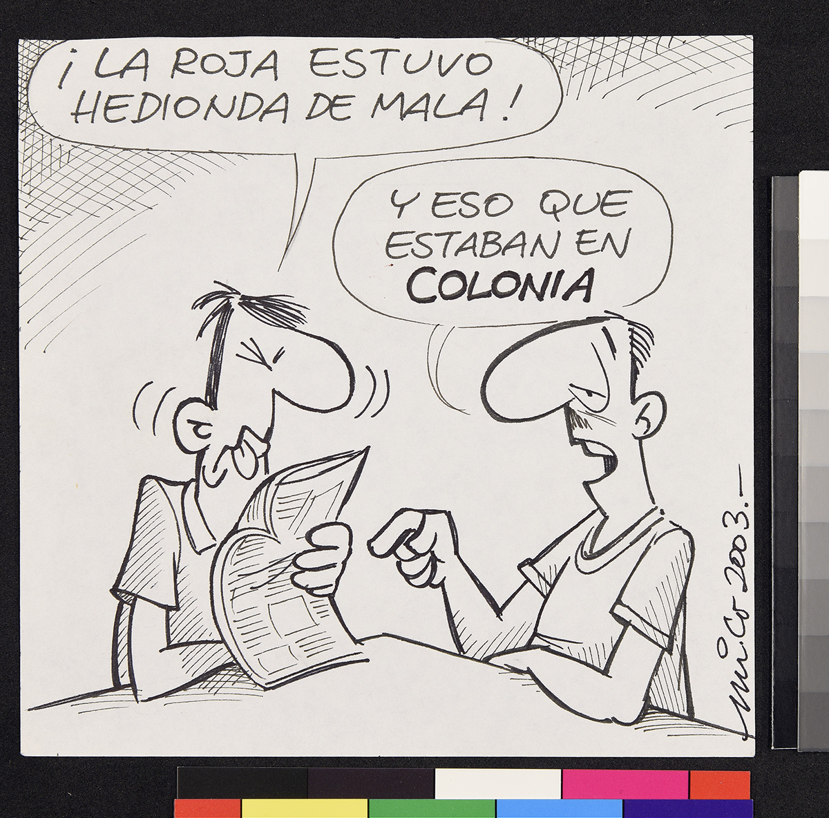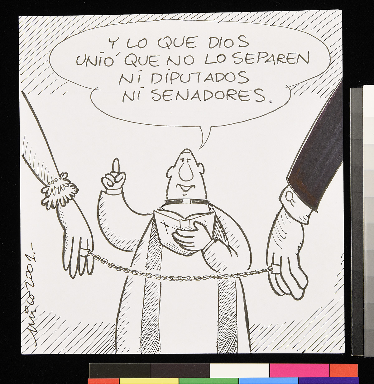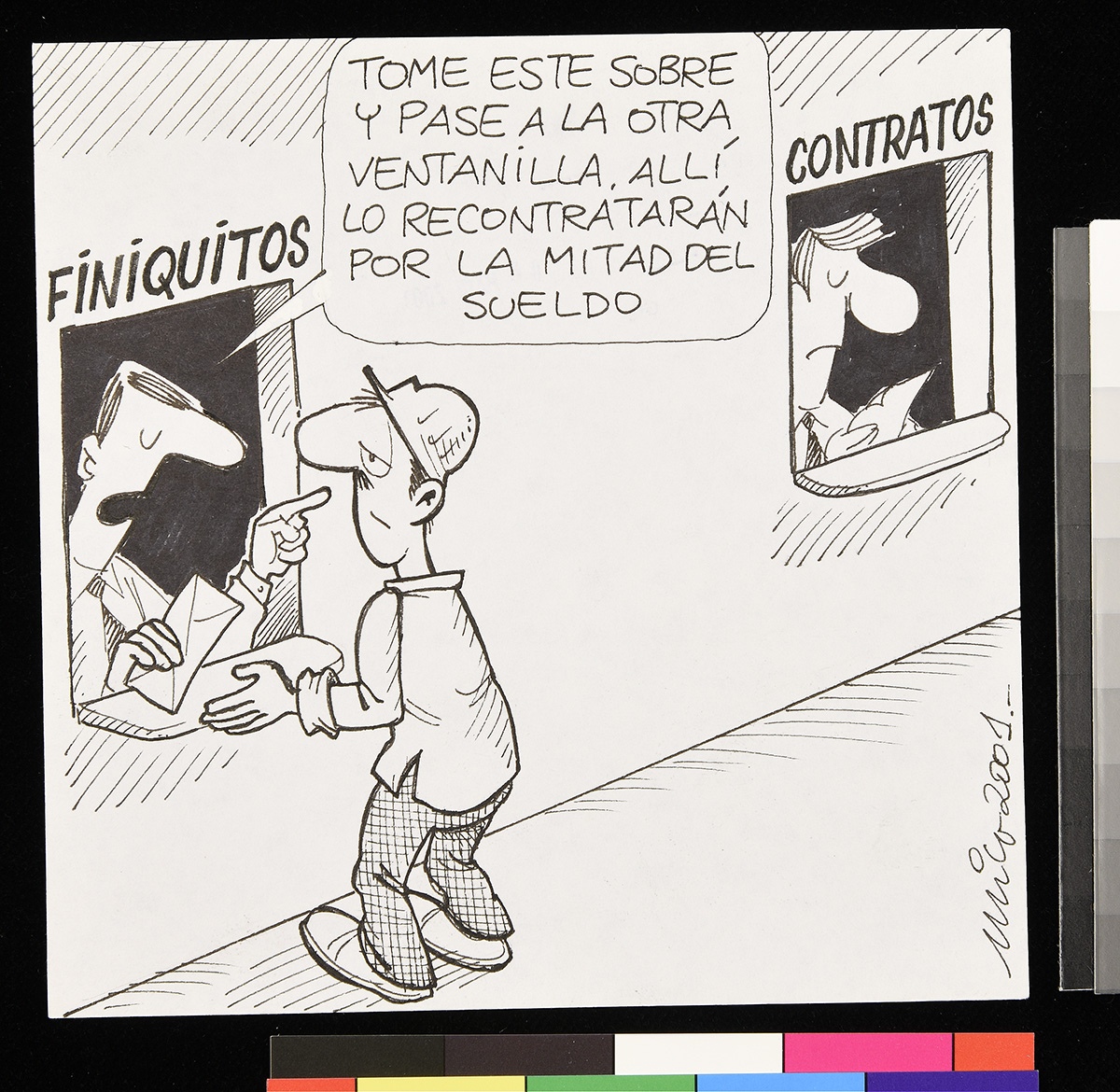 Dibujo de un hombre de traje que protesta, llevando en cada una de sus manos pancartas donde dice ” No a las reformas laborales” y “Muera el cambio”.