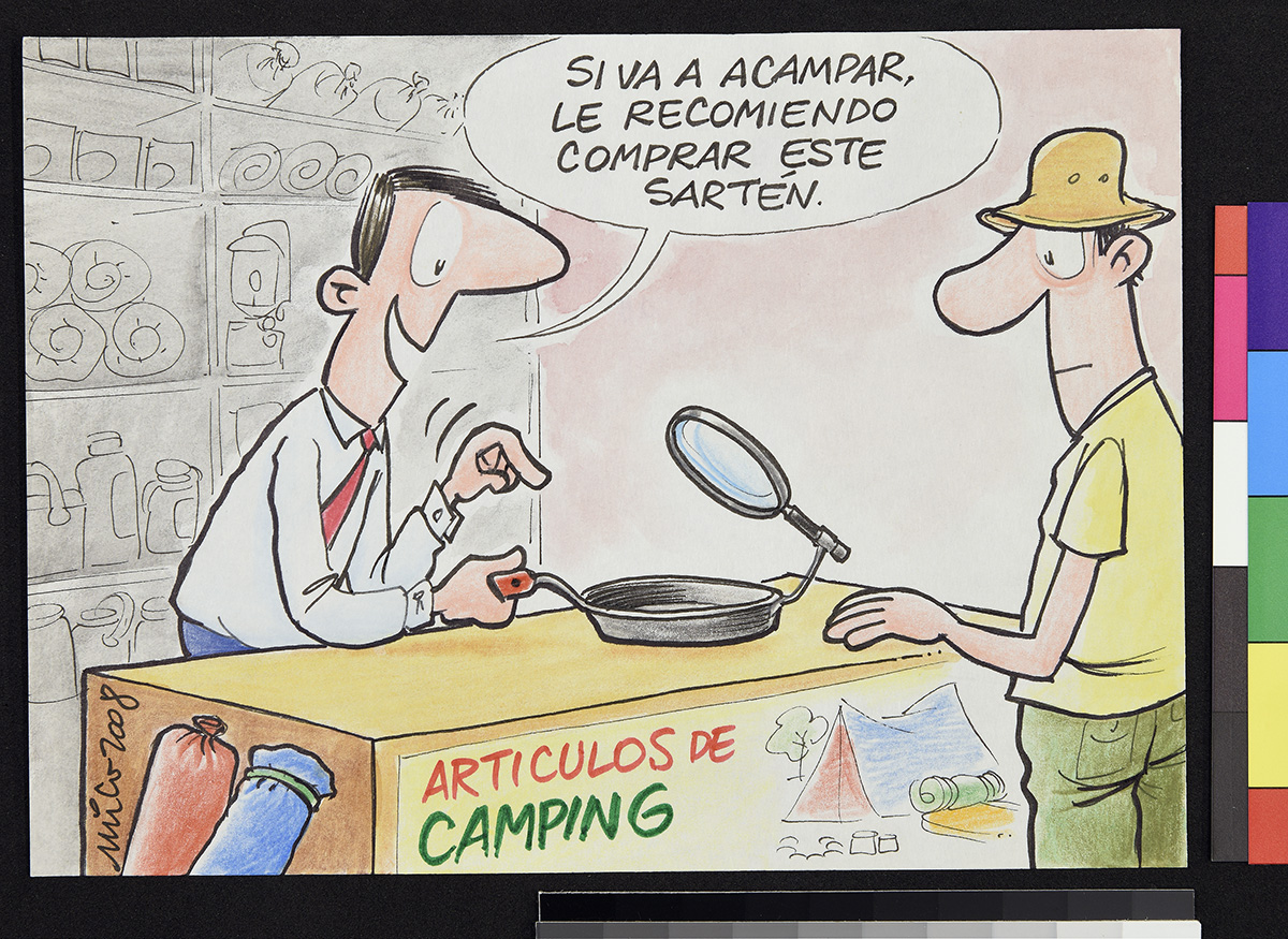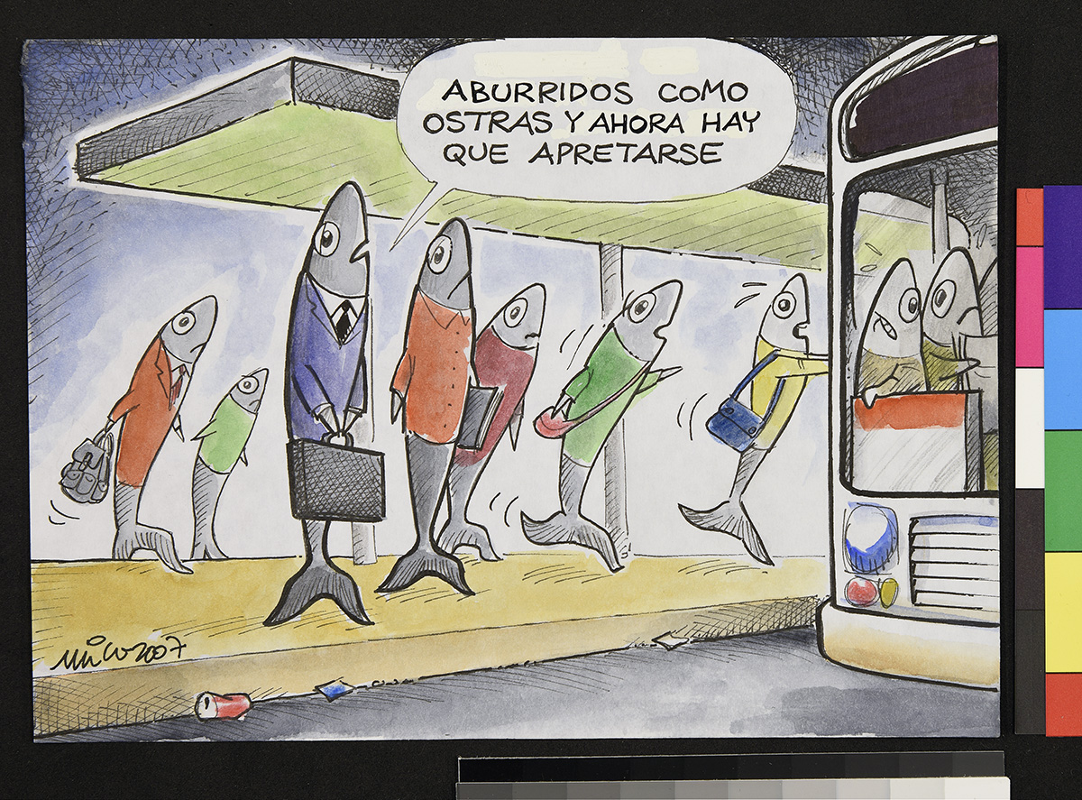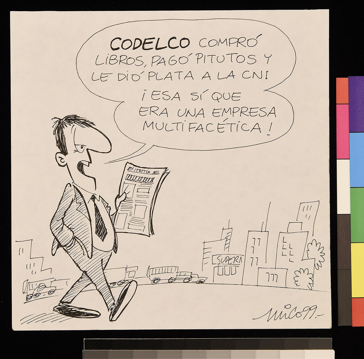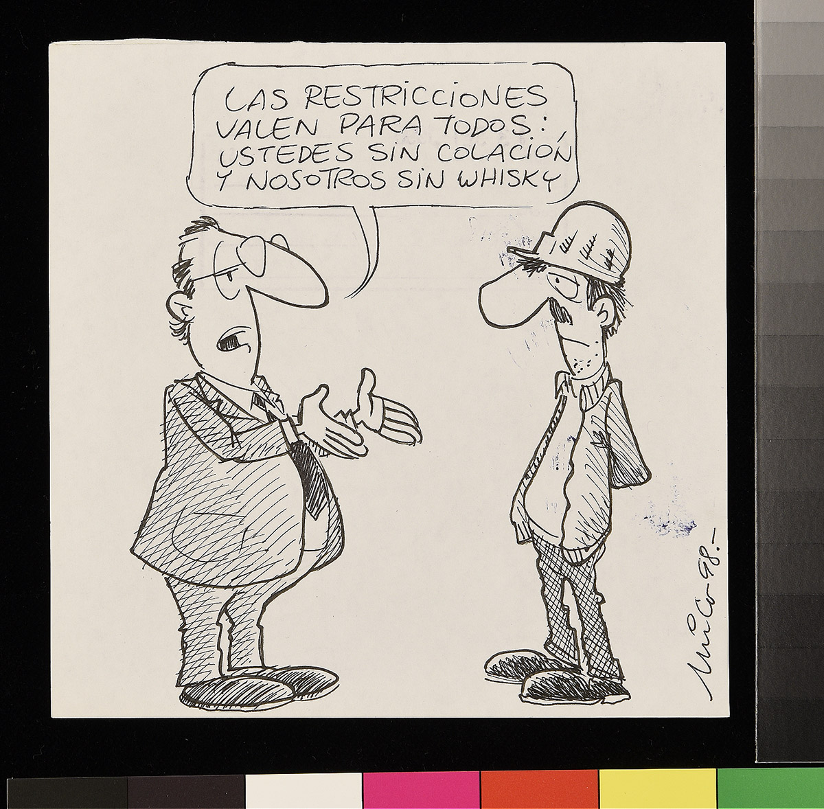 Dibujo de un hombre de traje y lentes que conversa con otro con casco de seguridad.