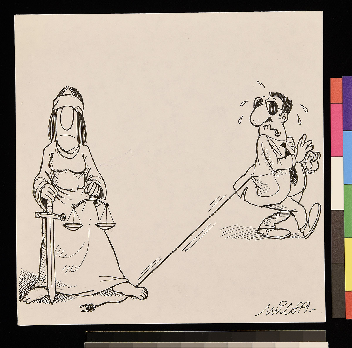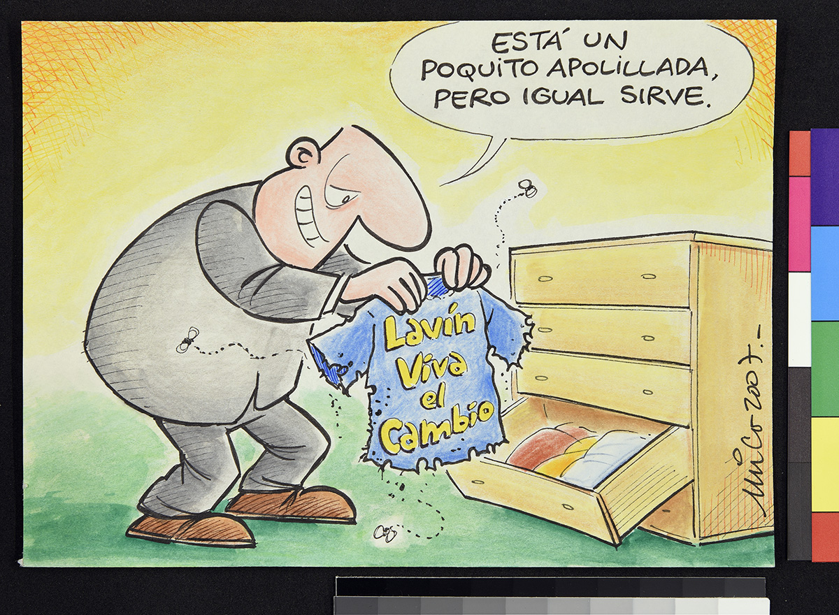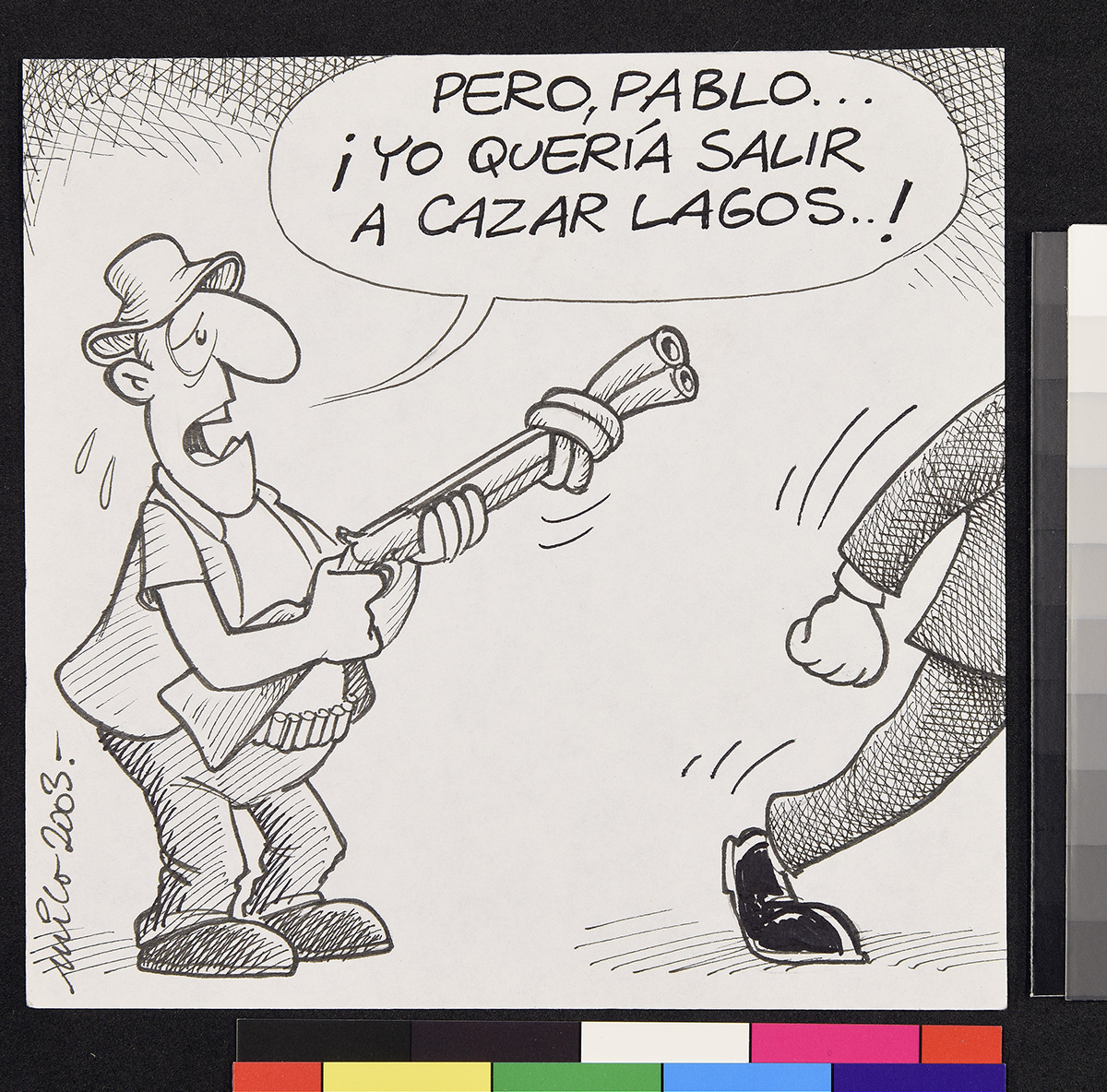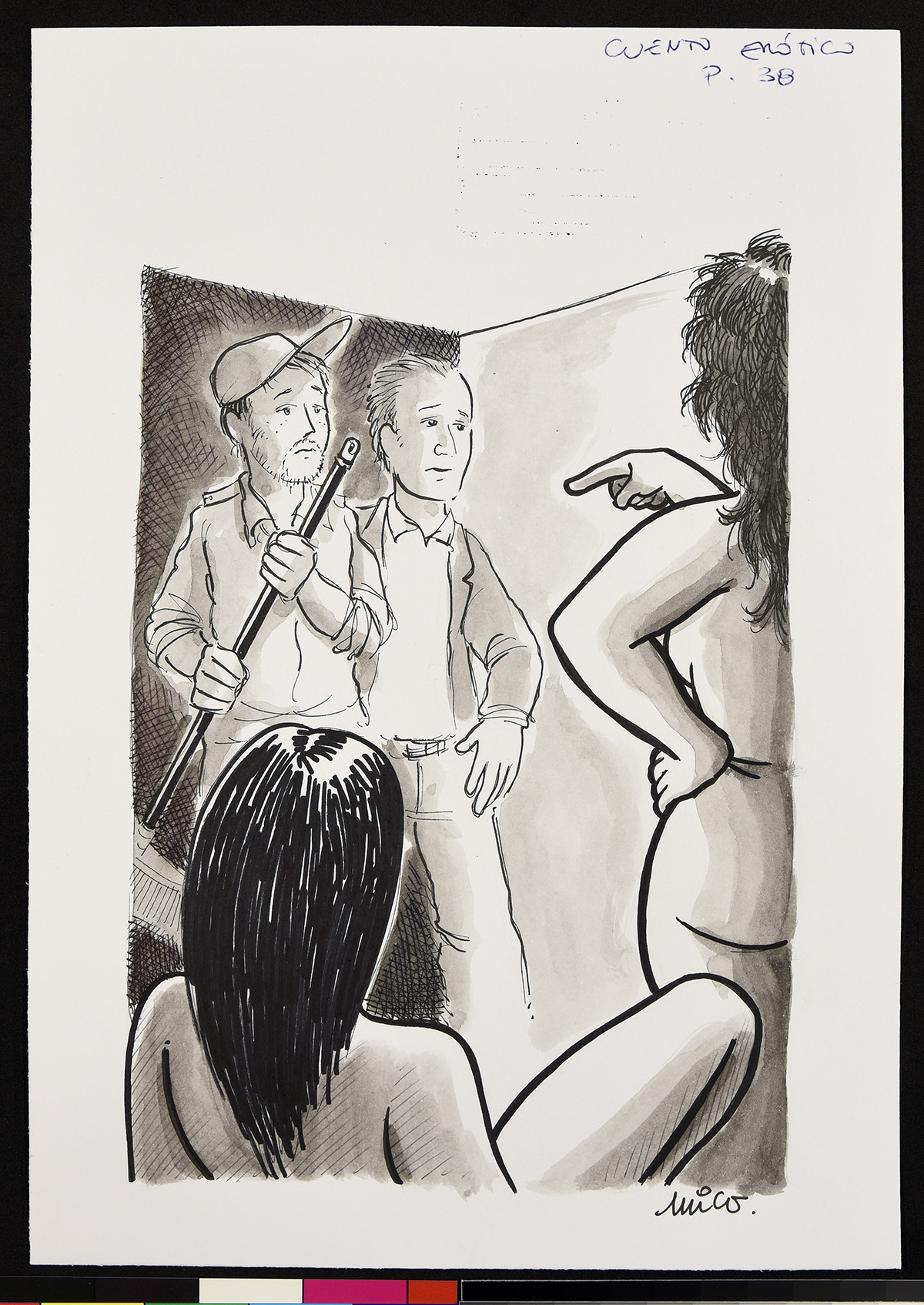 Dibujo de un hombre de traje y lentes que conversa con otro con casco de seguridad.
